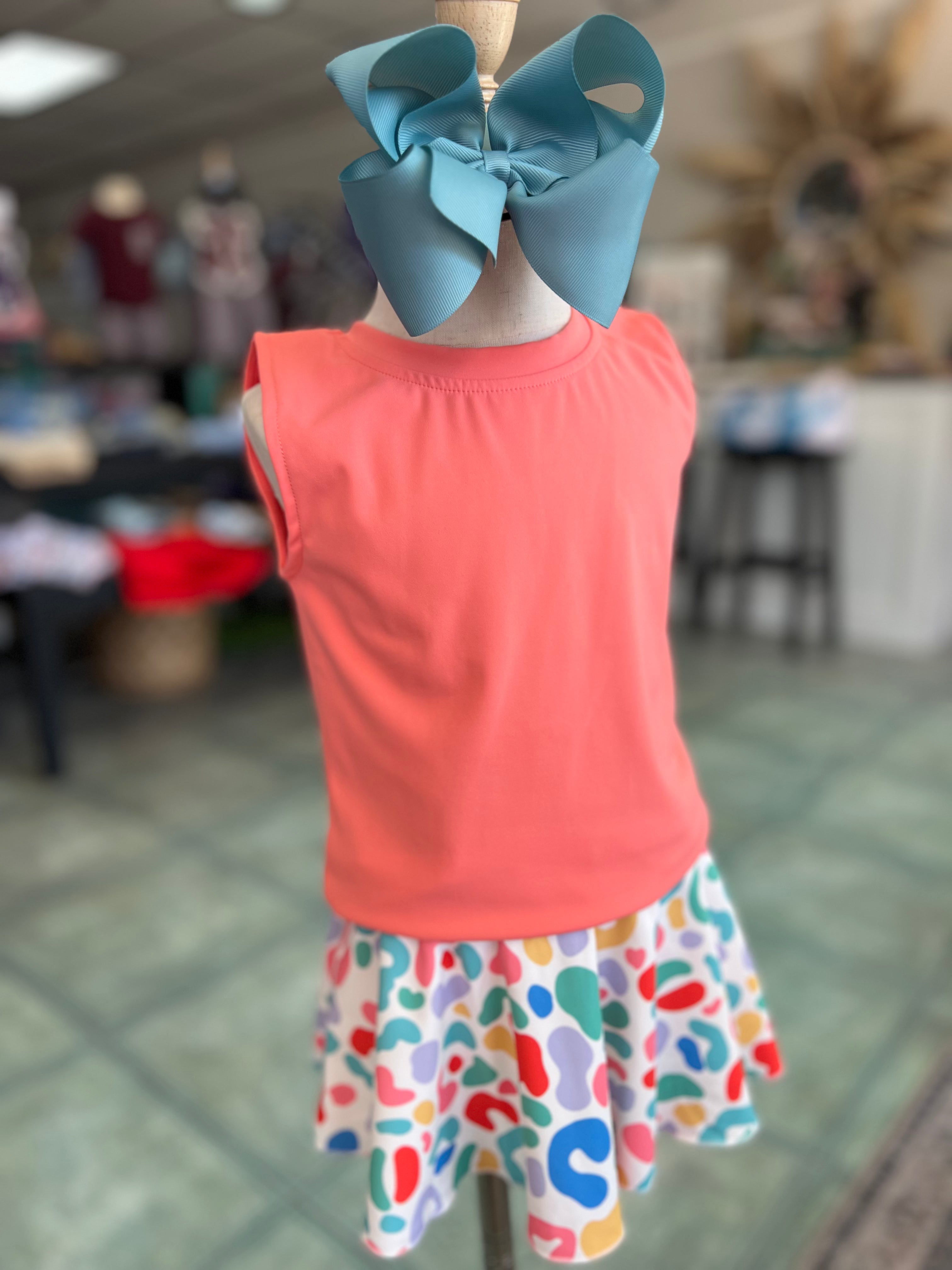 The Confetti Crush Athletic Set is a vibrant coral pink sleeveless top paired with a fun confetti print skort, crafted from soft, breathable performance fabric. Designed for active girls, it offers a true-to-size fit and built-in shorts for comfort and coverage. Perfect for playground adventures, school days, or summer fun, this set keeps her moving in style and ease. Easy care means just wash cold and lay flat to dry. Ready to ship and brighten her wardrobe!