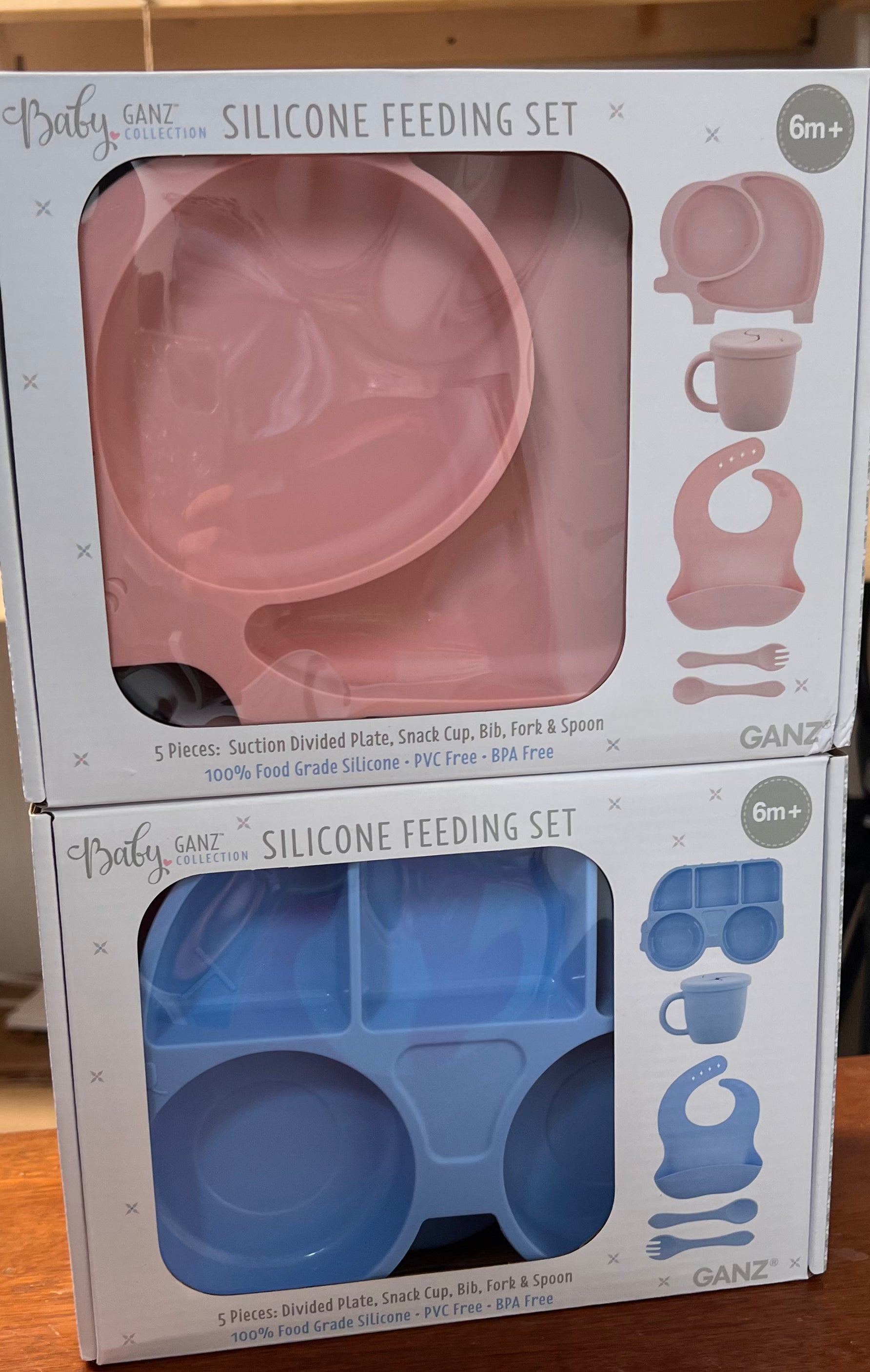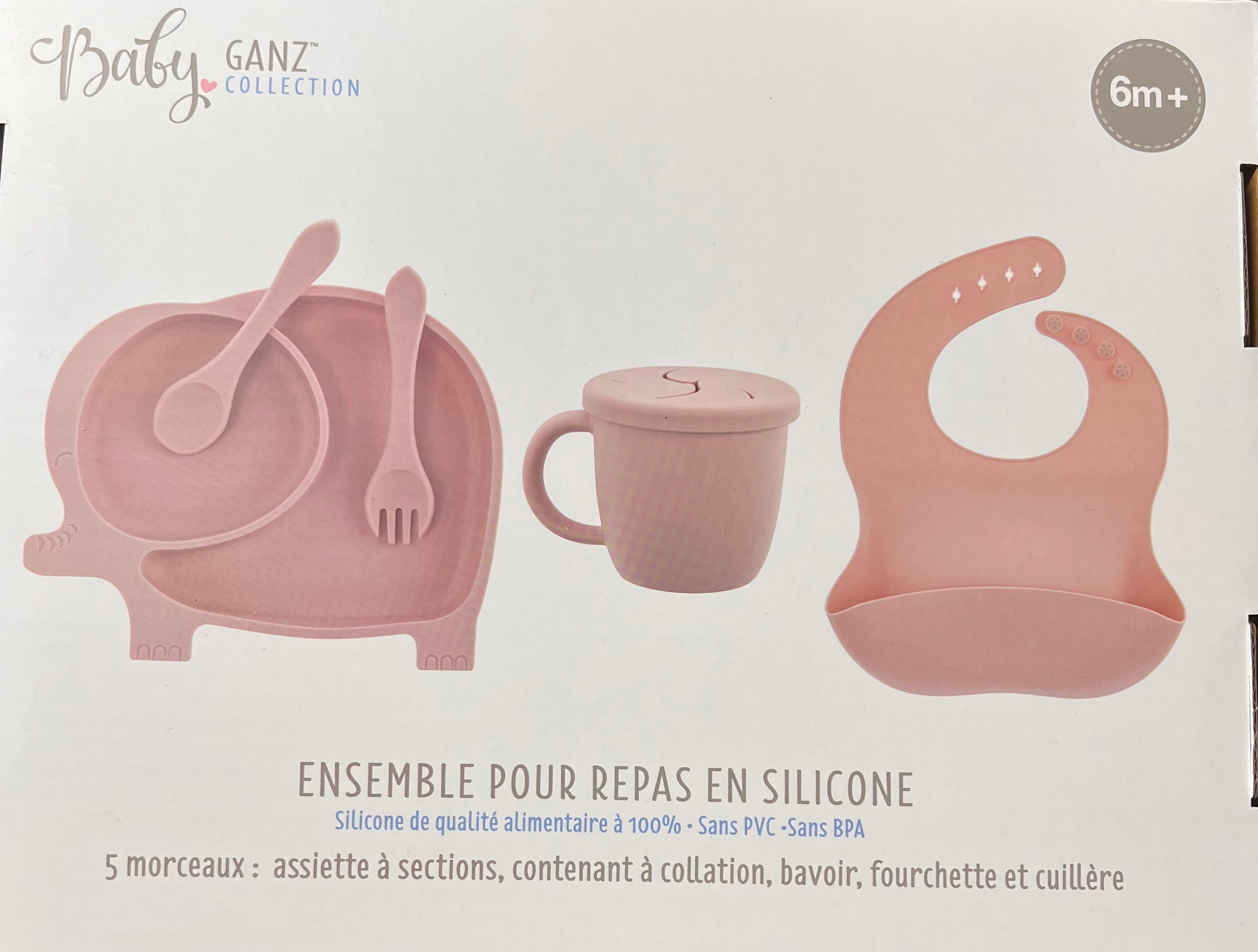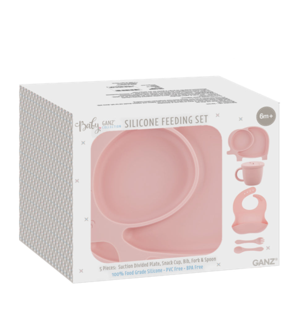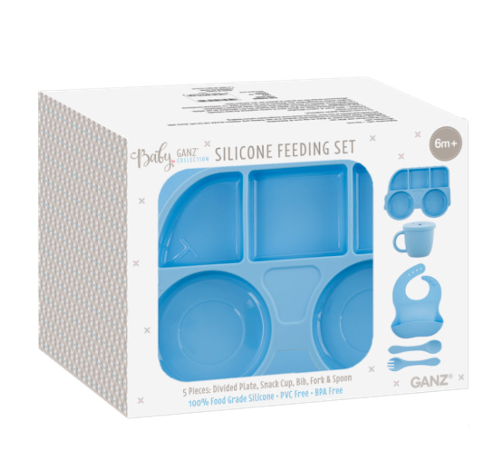 The Silicone Feeding Set is a 5 piece set perfect for feeding your little one. The divided plate and snack cup make mealtime a breeze, while the bib, fork, and spoon are all made from 100% food grade silicone and are PVC and BPA free. Suitable for babies 6 months and older. Mealtime just got easier (and safer) with this set!