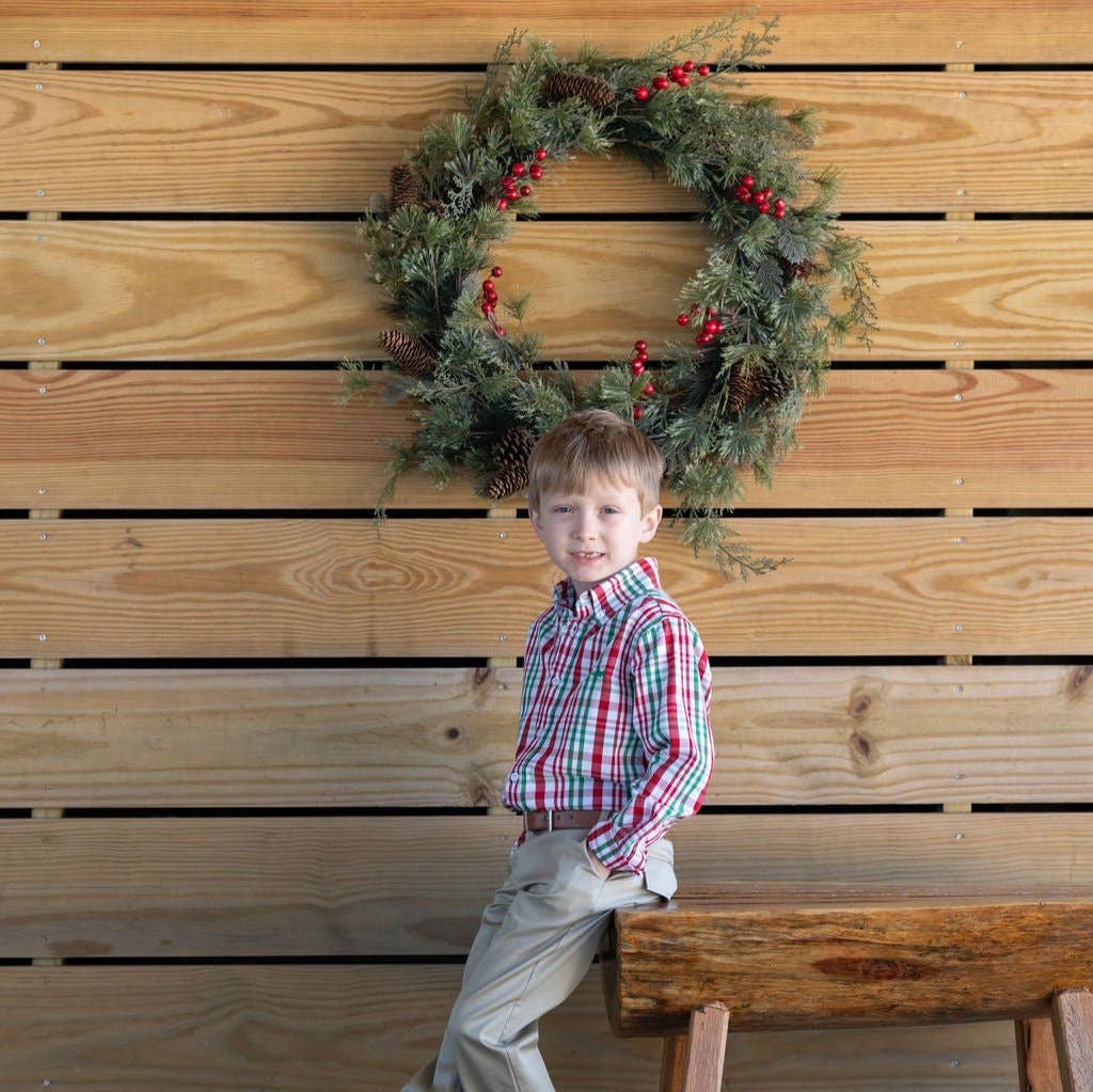 The perfect shirt for your little man - the Carter Oxford Shirt in Sleigh Plaid. Pair it with our pants for a complete look for family photos, school pictures, and every special occasion in between!