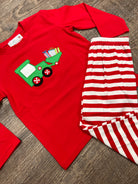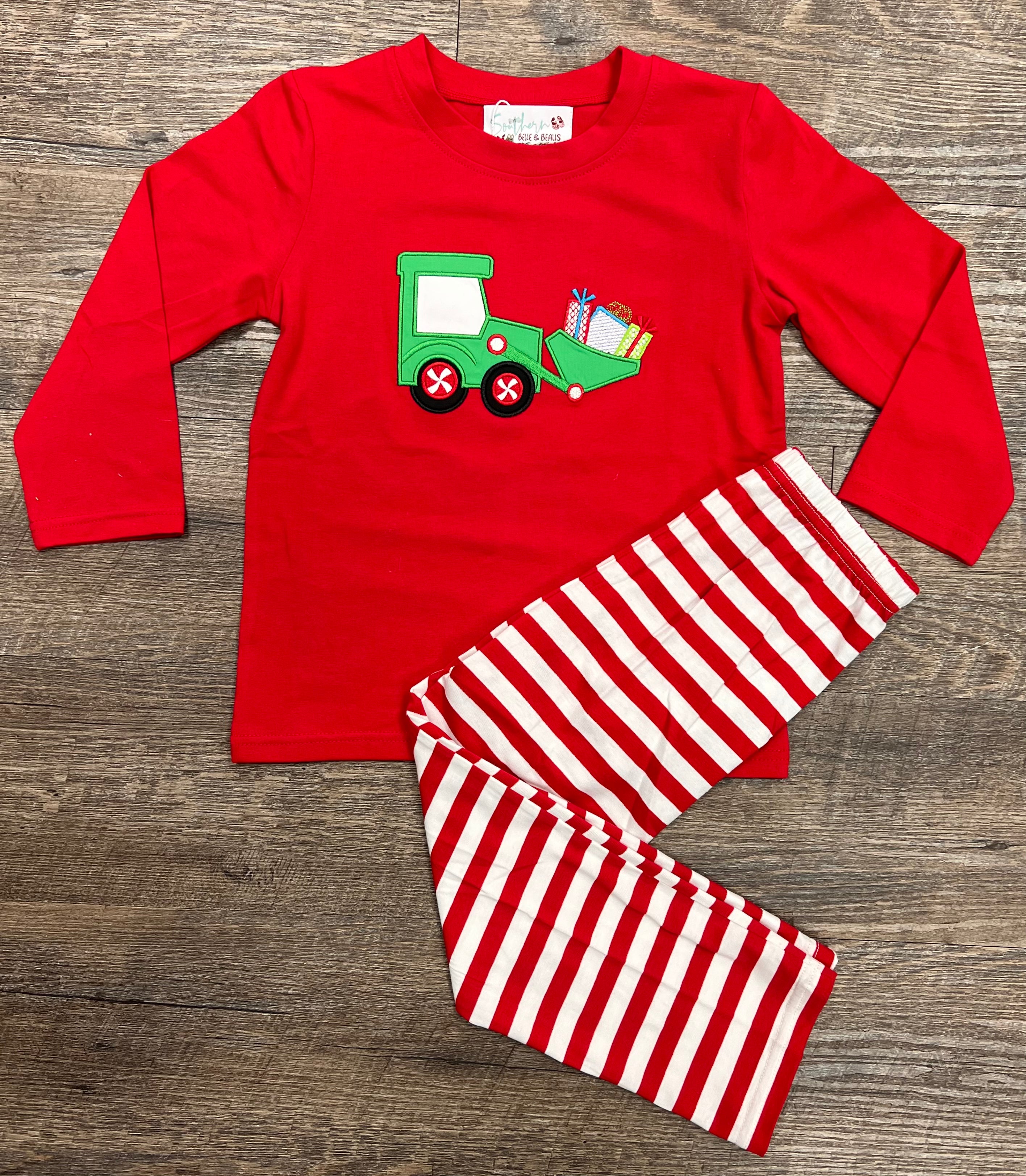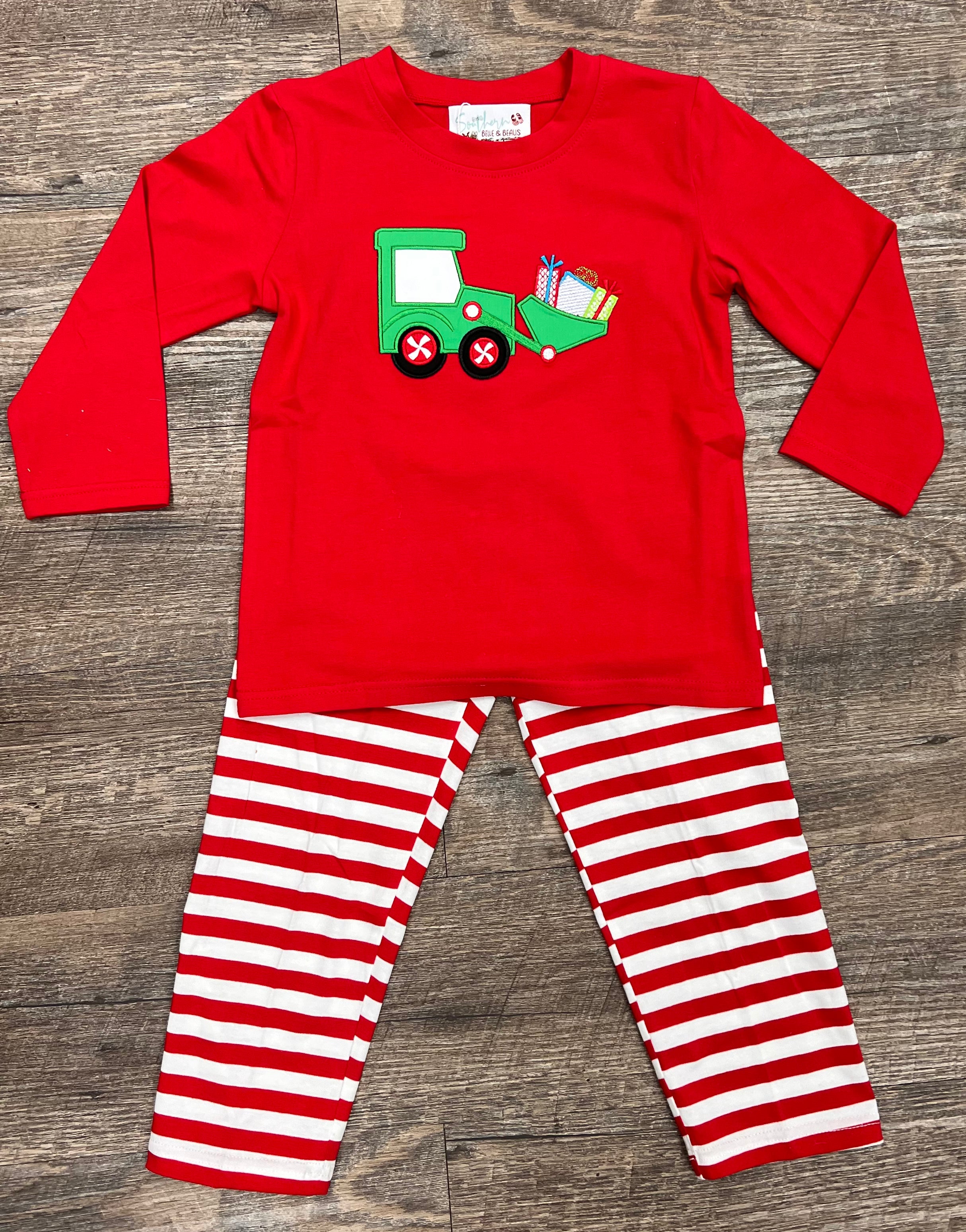 Celebrate the magic of the holidays with our "Pile Of Presents" boy set! This set includes a cozy long sleeve red shirt with a charming tractor and presents applique, paired with playful red and white striped pants. Perfect for creating unforgettable memories on the farm this season.