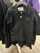 Elevate your child's style with our Gamecock Boy Polo! Made from black knit fabric, this long sleeve polo is not only comfortable but also stylish. The standout feature is the garnet applique cocky, representing their school pride. Get ready to show off your little fan with this polo!