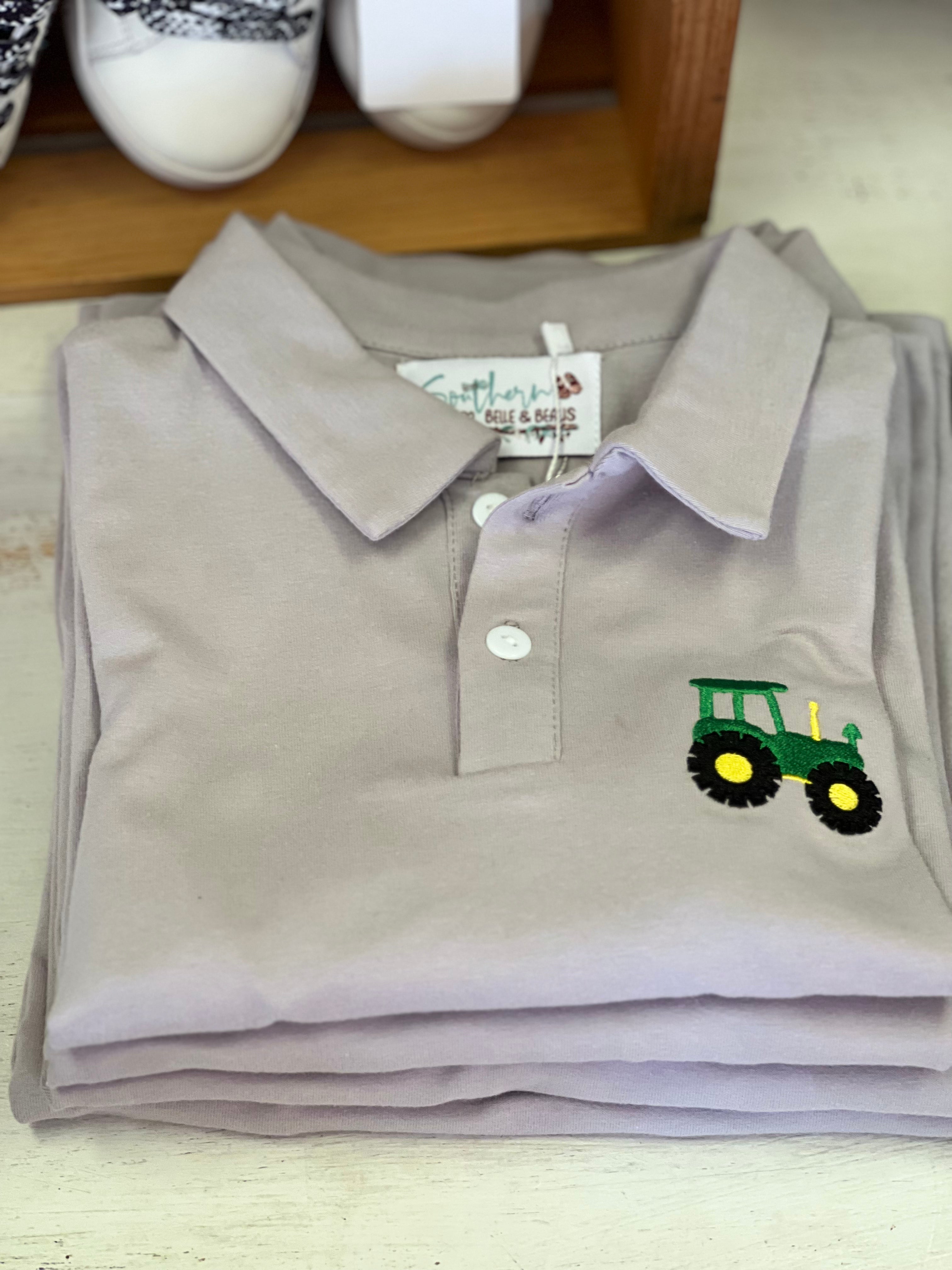 "Add a touch of playfulness to your little man's wardrobe with our Grey Tractor Polo. Designed with a comfortable knit fabric and featuring a charming Green Tractor embroidery, this top will make your boy the talk of the playground. Boys just wanna have fun, and this polo is the perfect addition to their everyday style!"