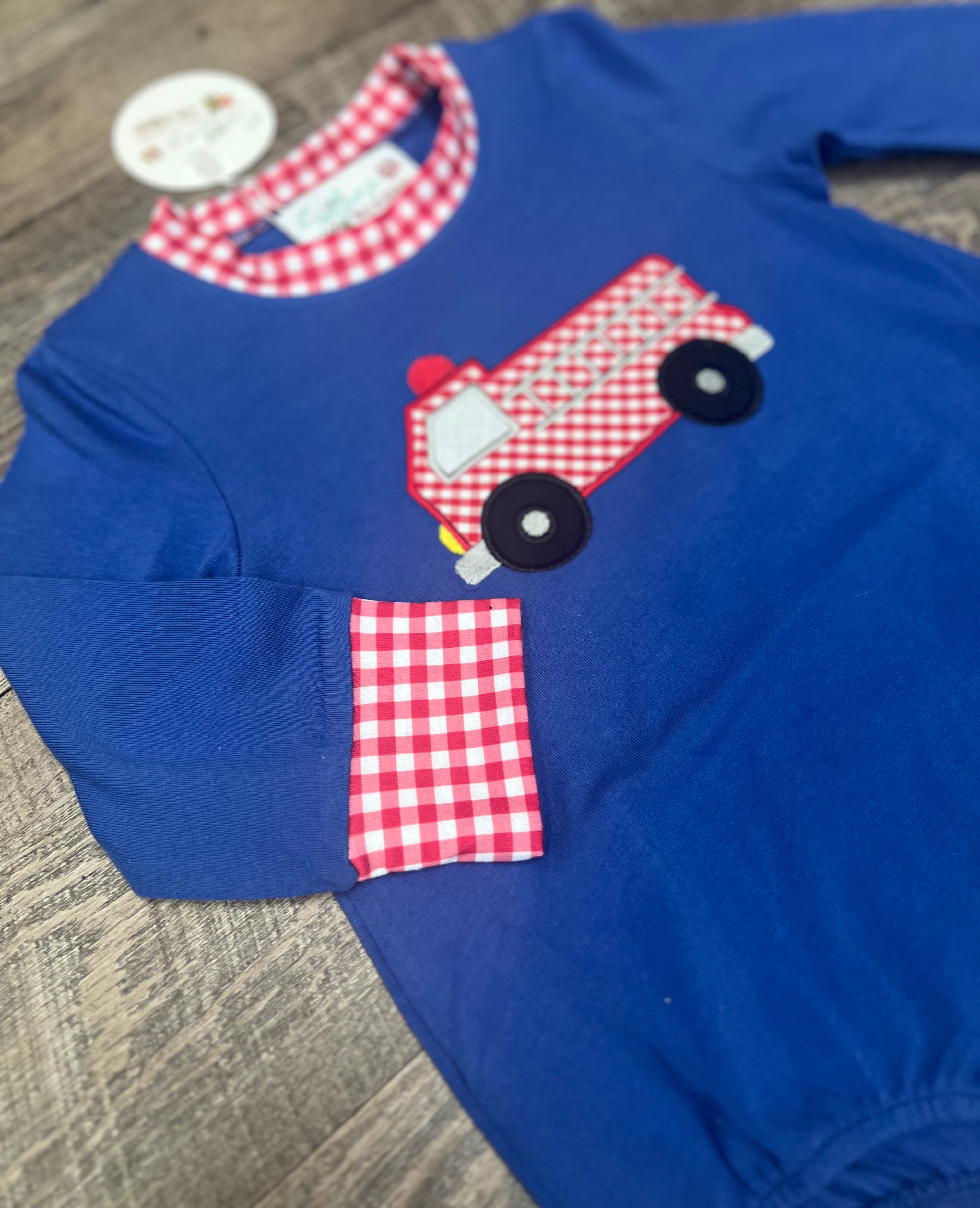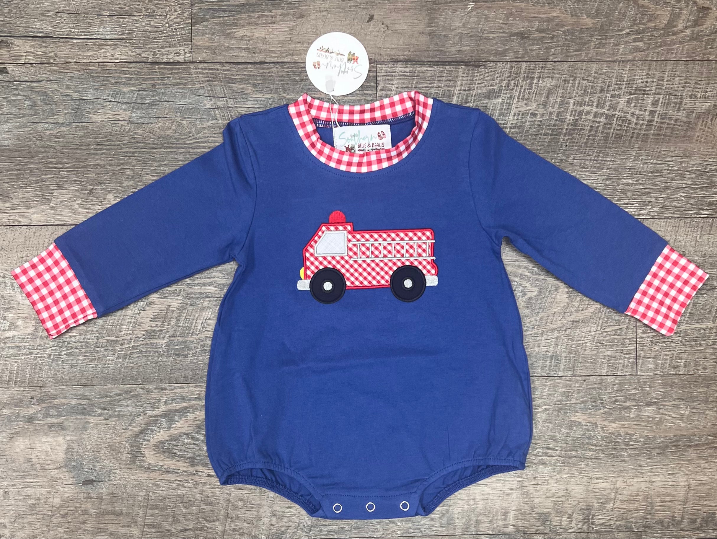 Light up your little one's wardrobe with KBug's Firetruck Bubble! This playful long sleeve knit bubble features a cute firetruck applique and trimmings in bold red and white. Perfect for all-day play and cozy enough for nap time. Get yours now before they're gone!