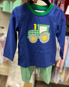 Get ready to plow through the day in style with Ollie's Tractors! The royal blue knit tops feature a fun and quirky green and white gingham tractor applique, adding a touch of whimsy to your wardrobe. And with the matching gingham pants, you'll be the trendiest farmer in town!