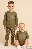 This adorable “Let the Field Be Joyful” Camo Set is perfect for your little explorer! Featuring a soft, olive-green long-sleeve top with beautifully embroidered wildlife and an inspiring Bible verse from Psalm 96:12, it’s both meaningful and stylish. The cozy camo jogger pants with an adjustable drawstring waist and cuffed ankles add a rugged charm, making it ideal for playdates, outdoor adventures, or casual family outings.For a complete sibling look, pair it with the matching bubble romper for the perfect coordinated outfit!Key Features:• Top: Olive-green long-sleeve with detailed embroidery (Psalm 96:12)• Pants: Soft camo print joggers with adjustable drawstring & elastic cuffs• Material: Lightweight, breathable, and comfy for all-day wear• Matching Option: Coordinating bubble romper available for siblings• Perfect for: Fall outings, casual wear, church, or special occasionsSizing: True to sizeCare Instructions: Machine wash cold, hang to dryAdd a little faith and fun to your child’s wardrobe with this joyful set!