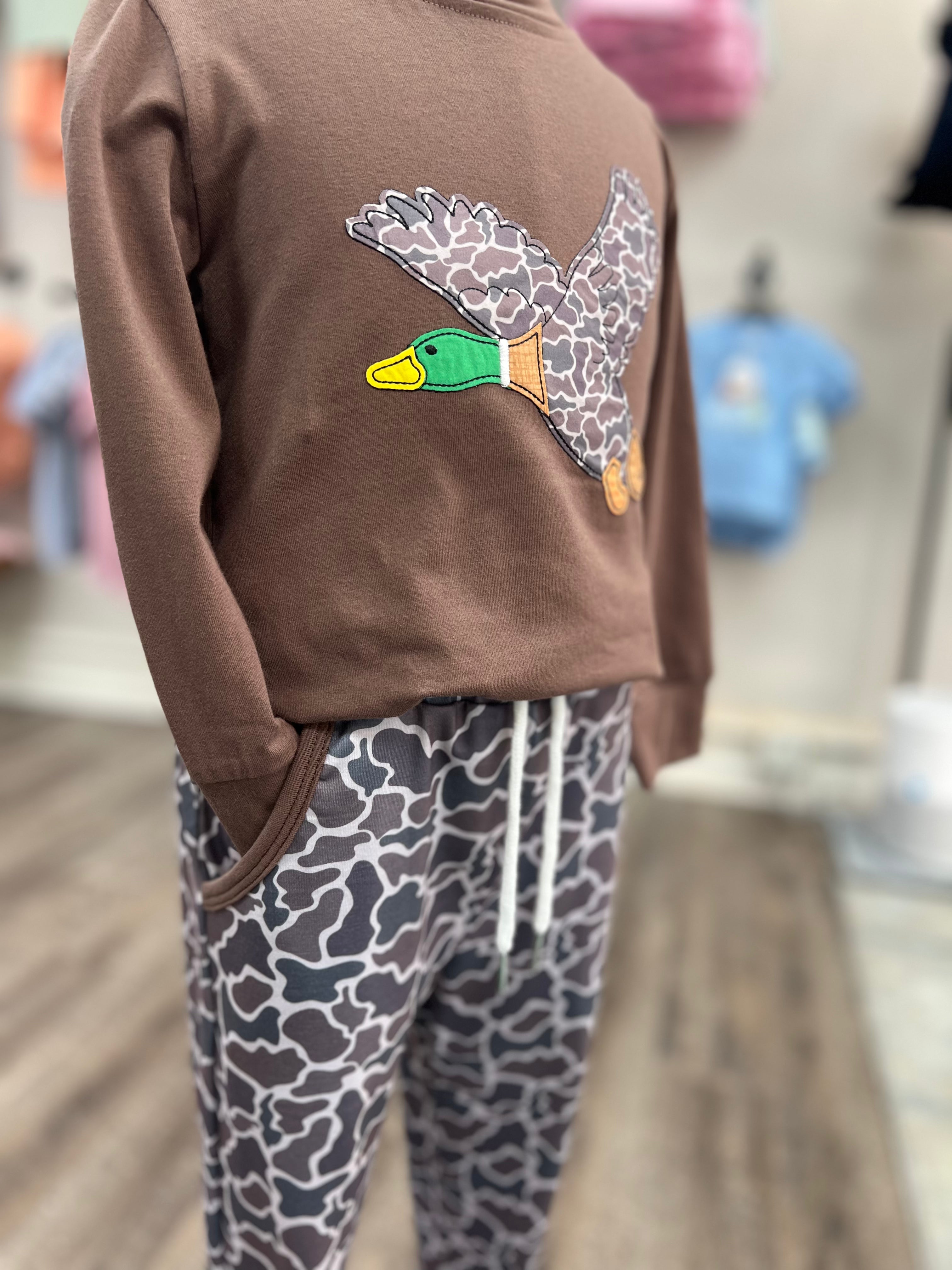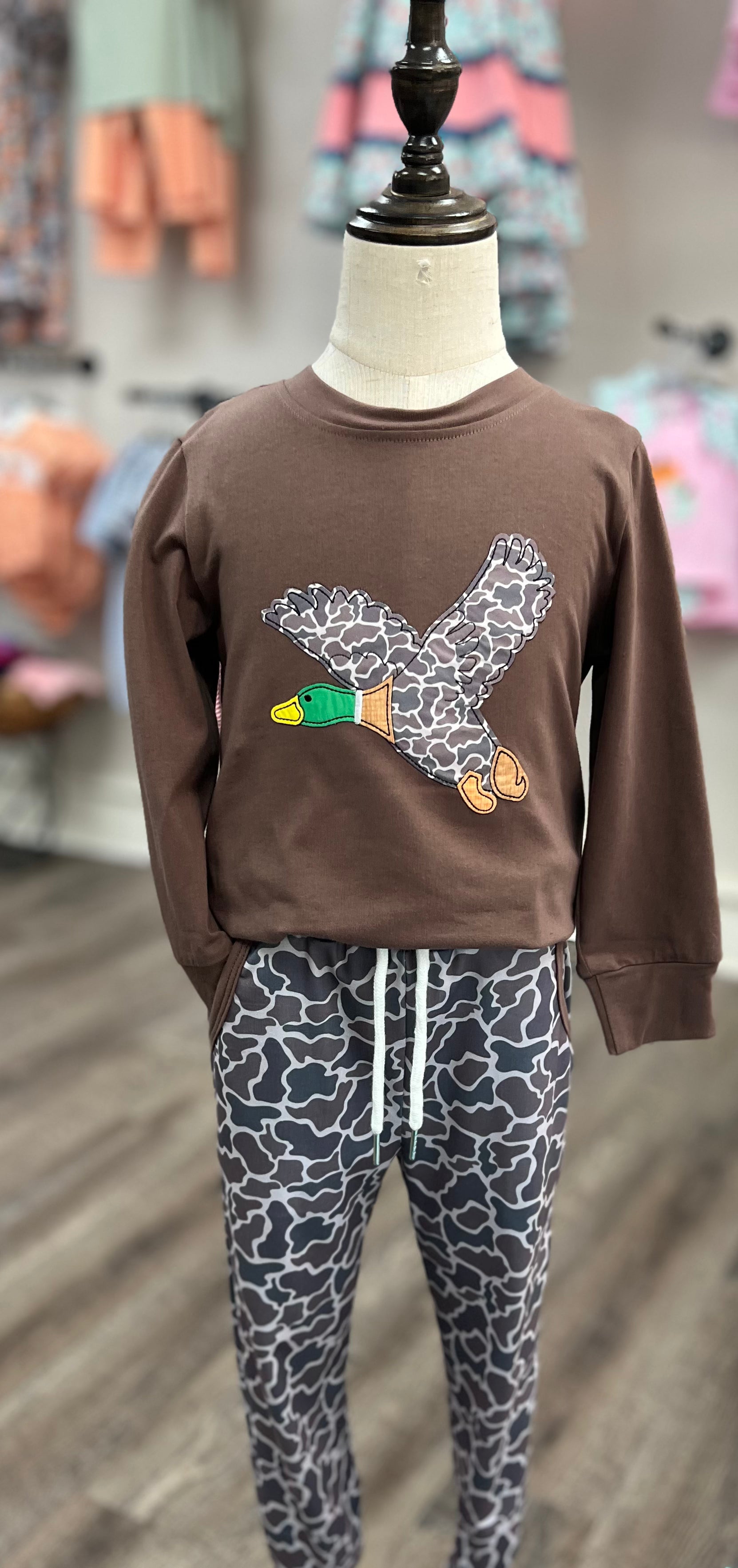Lead the flock in camo comfort! 🦆 This two-piece set features a chocolate brown crewneck with our bold camo mallard applique, paired with joggers in a matching duck-blind print. Soft, stretchy, and made for everything from duck hunts to downtown strolls — your little guy will rule the roost in style.