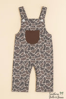 Feathered style for your little hunter-in-training! 🦆 These camo longalls feature a soft, breathable fabric, front kangaroo pocket in rich chocolate brown (can monogram), button/snaps for easy changes, and adjustable button straps for the perfect fit. Layer over our Mallard Mafia tee or crewneck for a full flock-approved look.