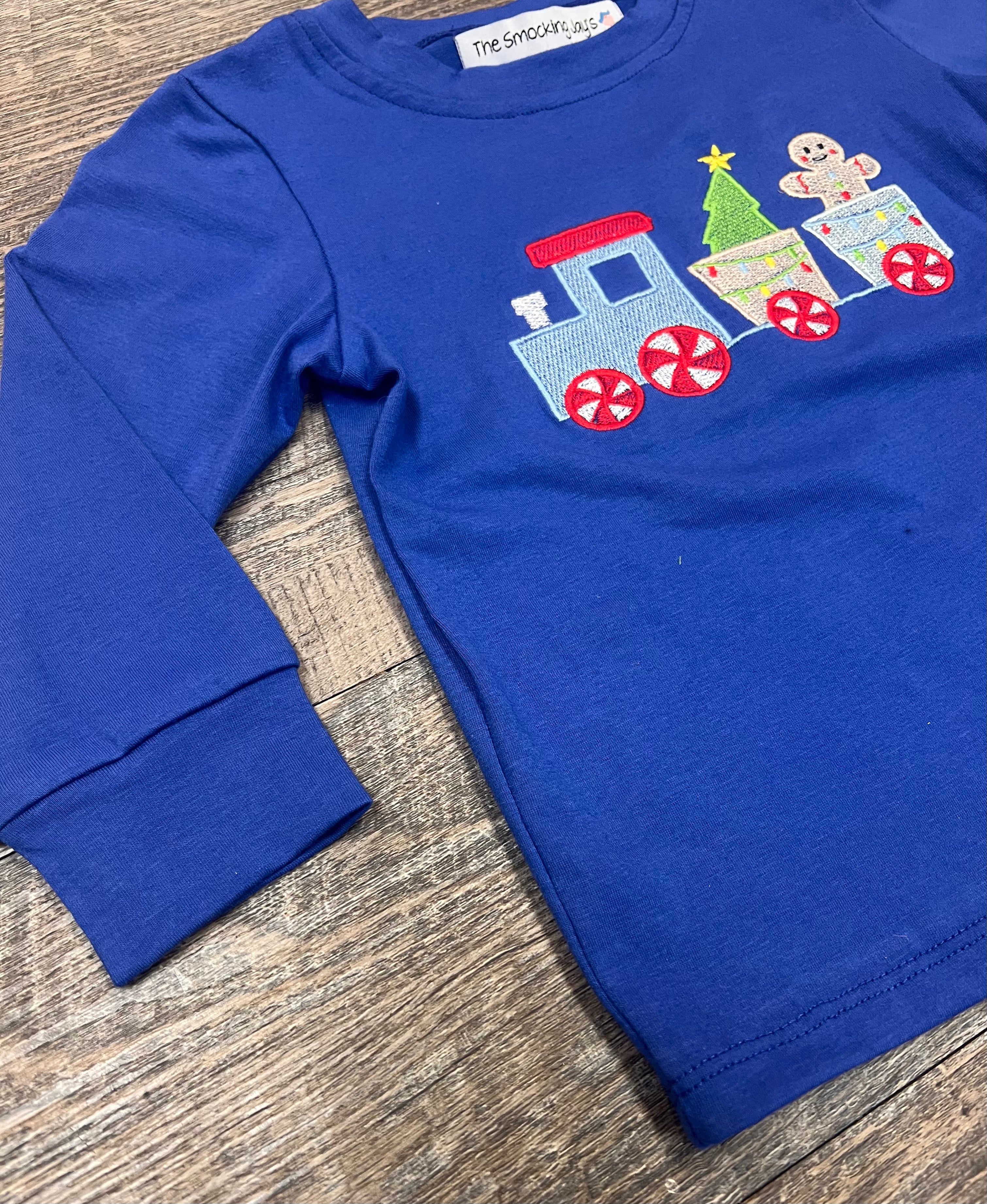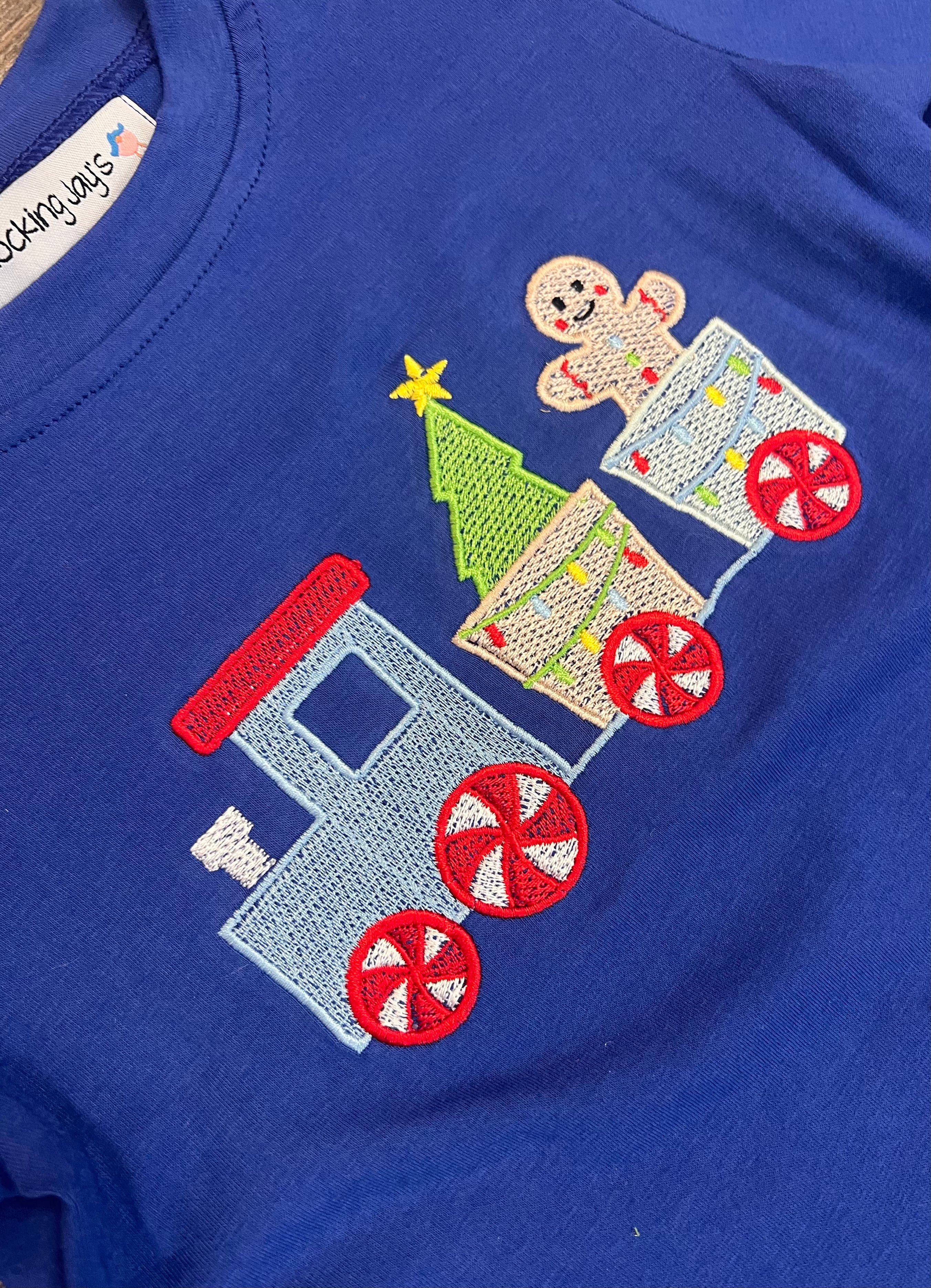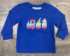 Introducing our All Aboard Christmas Boy Tee! This long sleeve knit blue top is perfect for any holiday occasion. Featuring a festive blue train, christmas tree, and gingerbread man applique, your little one will look adorable while staying comfortable. Get yours now and spread the cheer!
