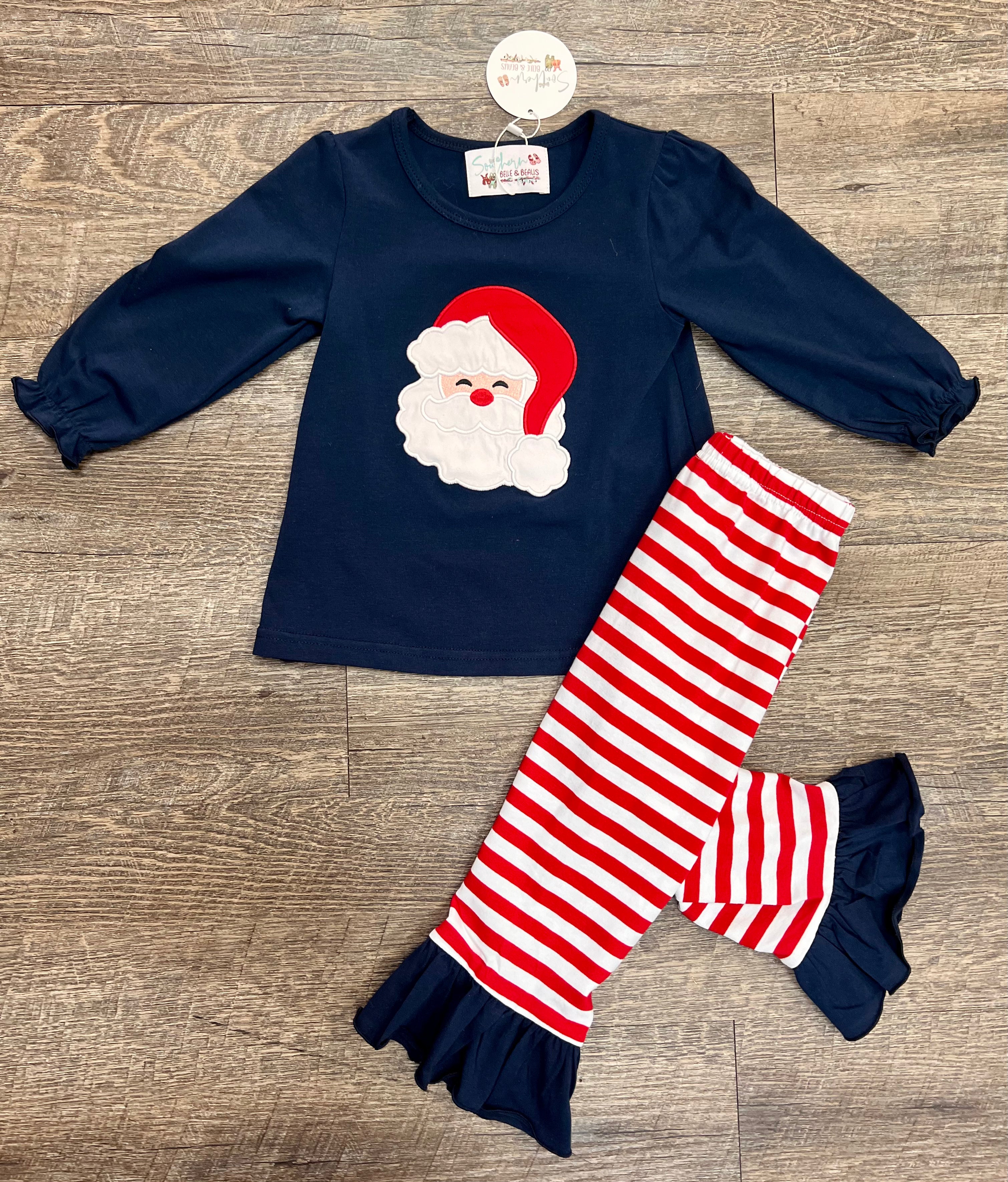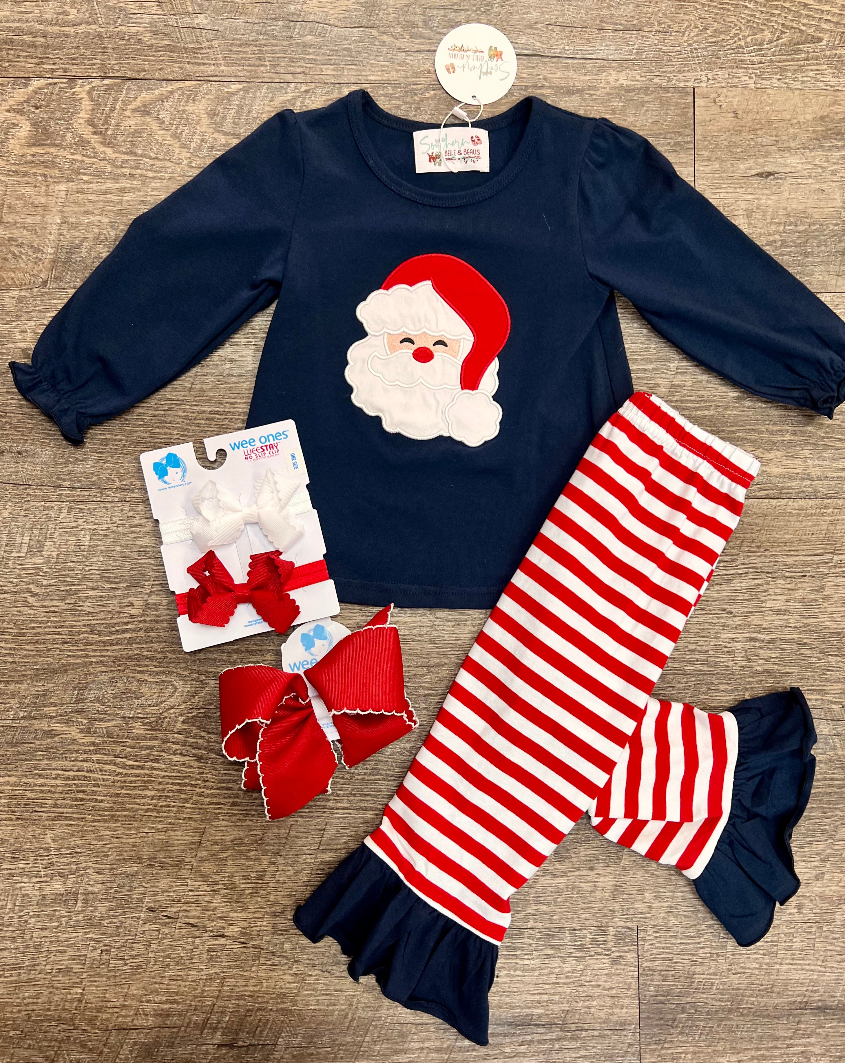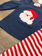 Get ready for the holiday season with our Twas the Night Before Christmas Girl Set! This adorable set features a long sleeve navy shirt with a festive Santa applique and ruffled sleeves. The red and white striped bottoms with navy ruffles complete the look. Perfect for spreading holiday cheer and making memories!
