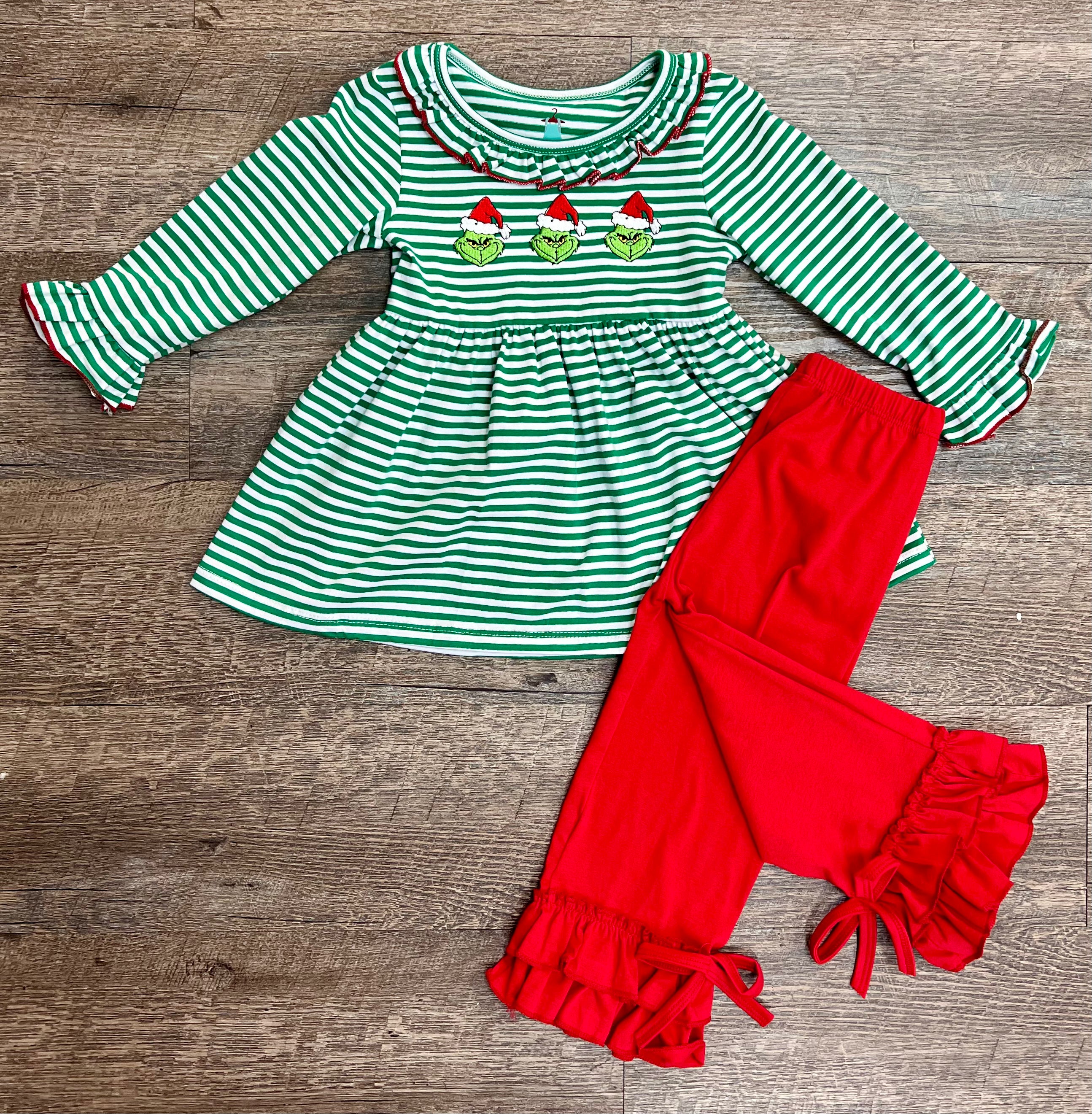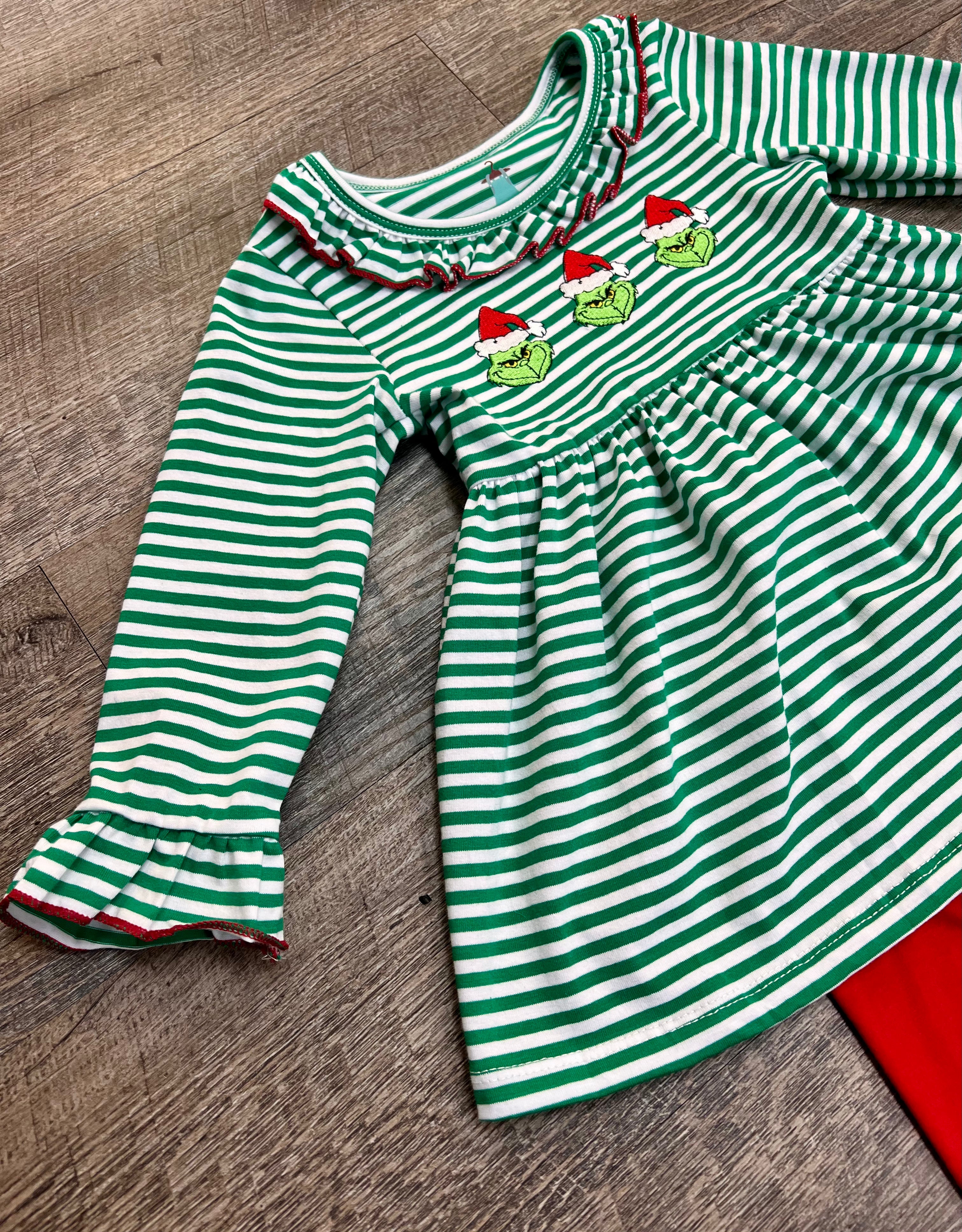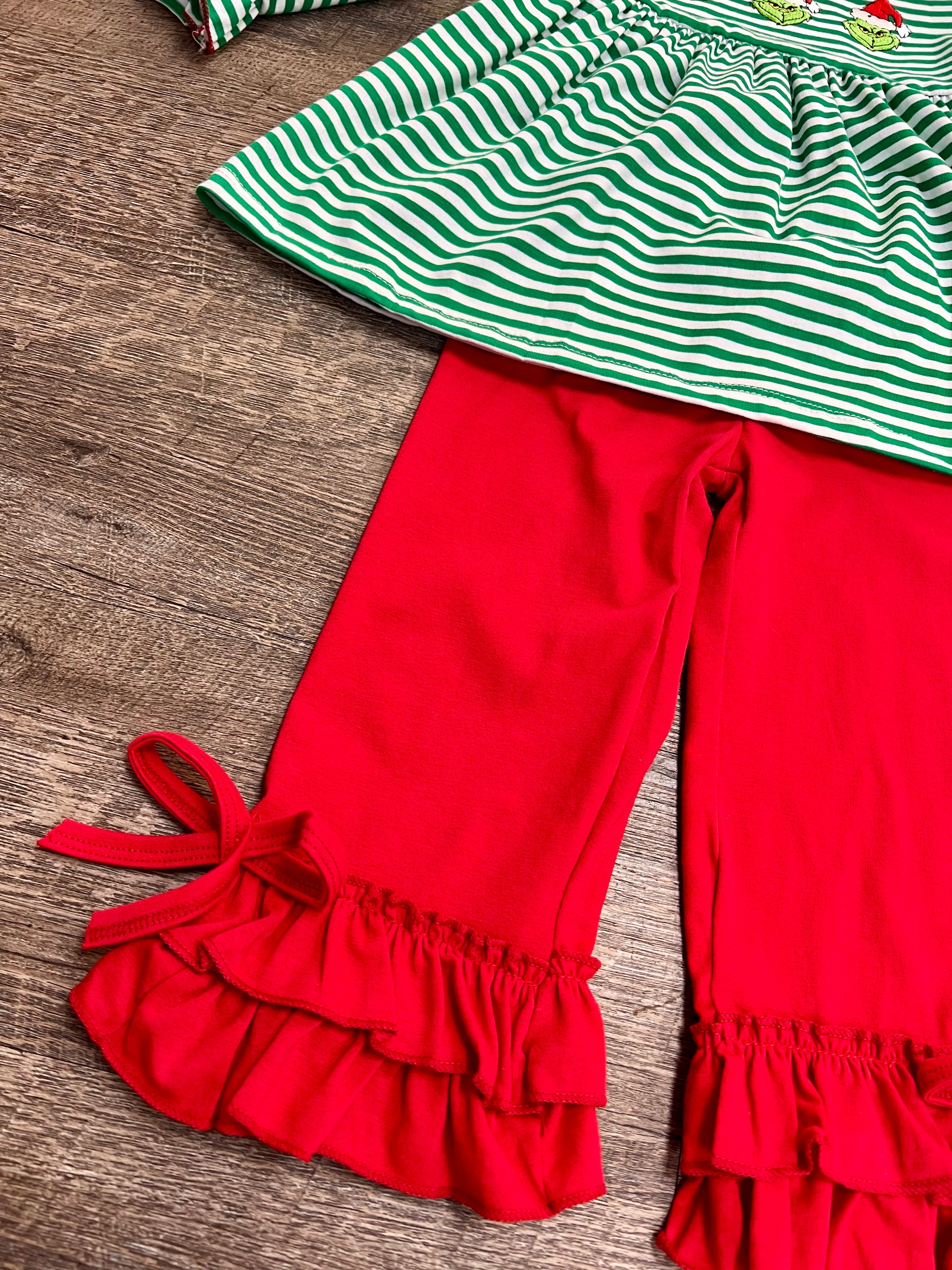 Add a touch of Grinchy charm to your little one's wardrobe with our You're a Mean One Girl Set! This adorable set features a green and white long sleeve knit top with a playful ruffled collar and sleeves. Complete with a cute Grinch applique, and matching red ruffled bottoms with a sweet bow on the side. Perfect for bringing some holiday cheer to any occasion!