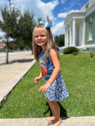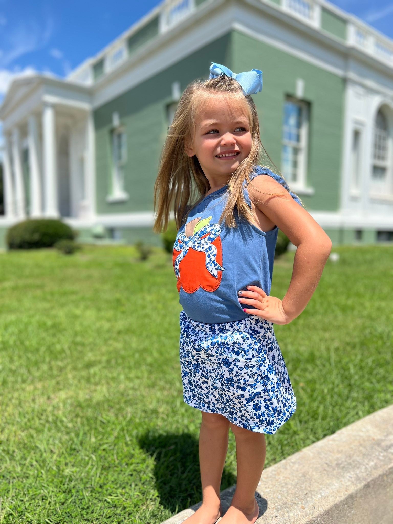 Matching blue floral knit skort with built-in shorts for carefree play.