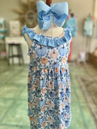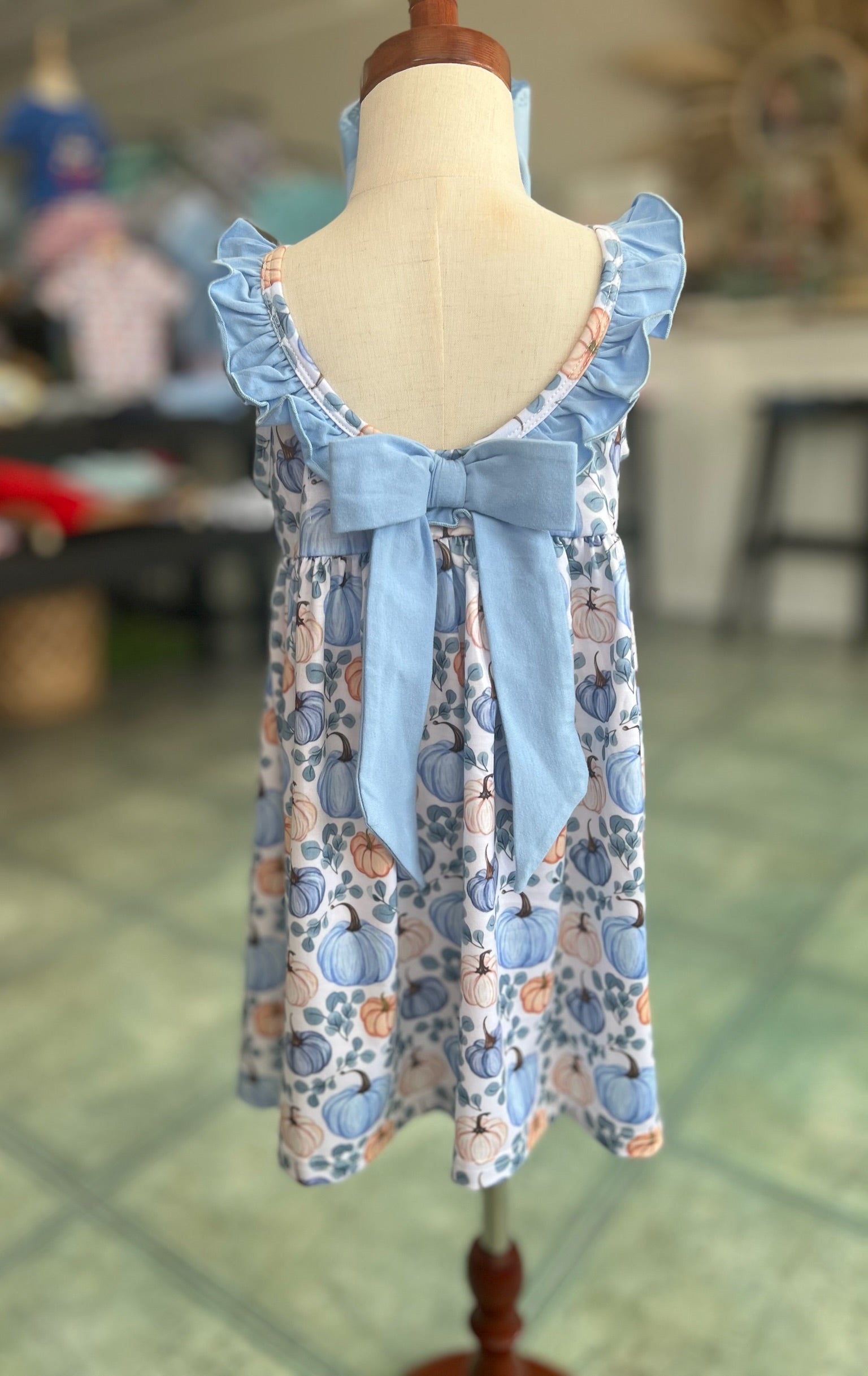 This darling ruffle dress is full of fall charm, with soft blue + peachy pumpkins and the prettiest back bow. Whether she’s twirling at the patch or posing on the porch, this look is a whole mood. 💙🎃