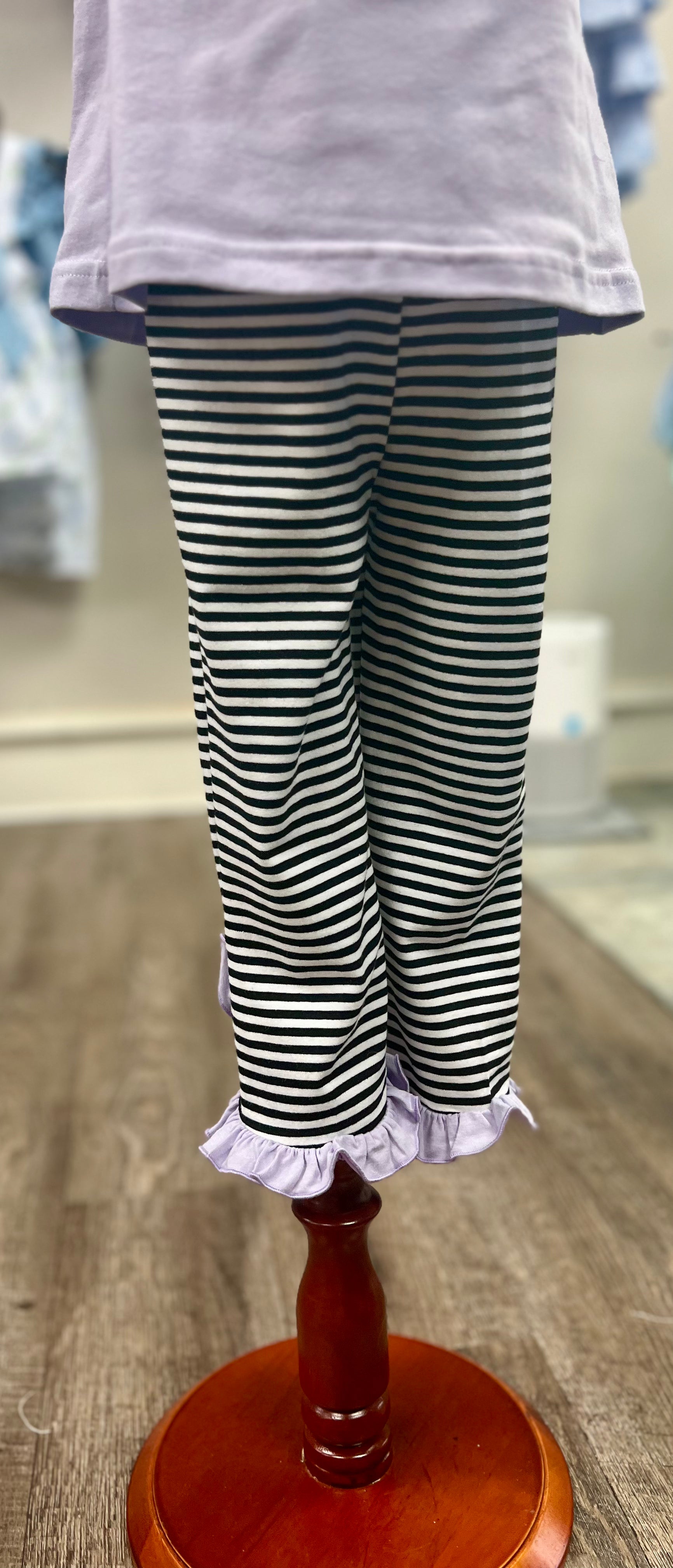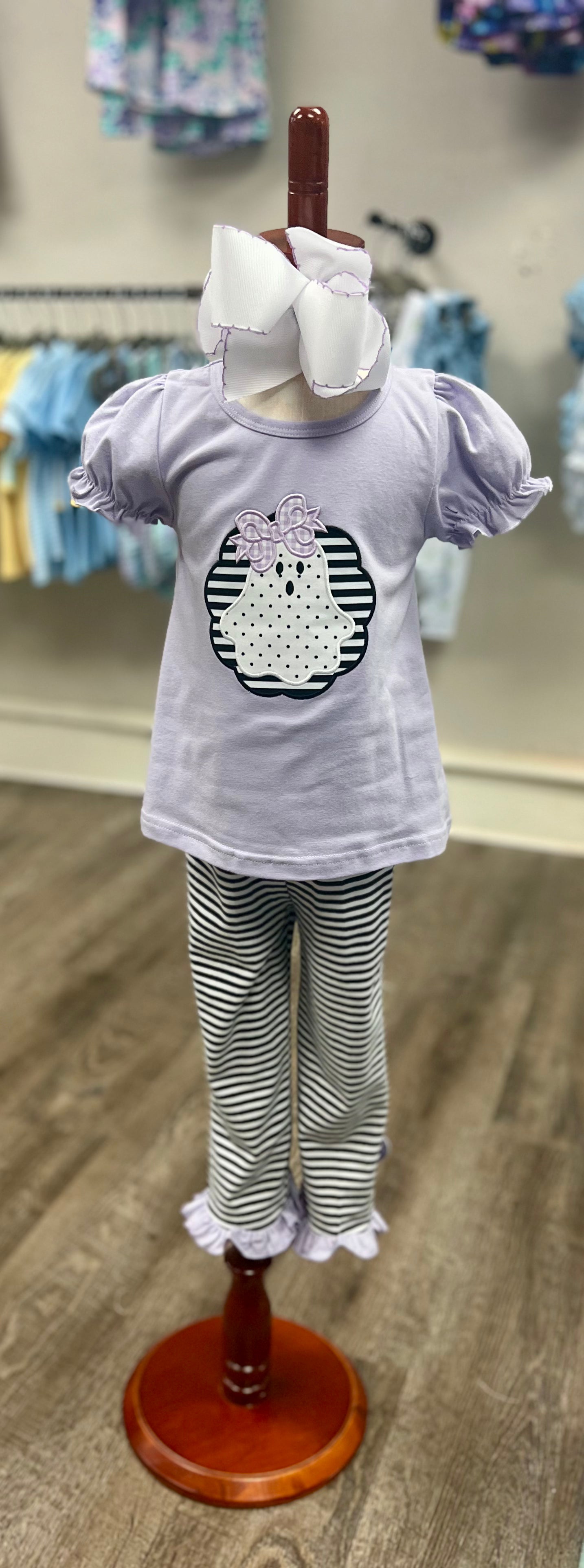 Lavender top with polka-dot ghost, striped ruffle pants, and oversized charm — perfect for your lil’ sass queen.