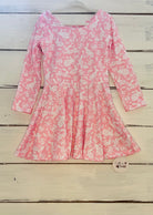 "Get ready to twirl with these adorable bunnies! This pink twirl dress is not only made of soft plush material, but it also features cute white bunnies and flowers. Perfect for a playful and stylish look. (Hop to it!)"