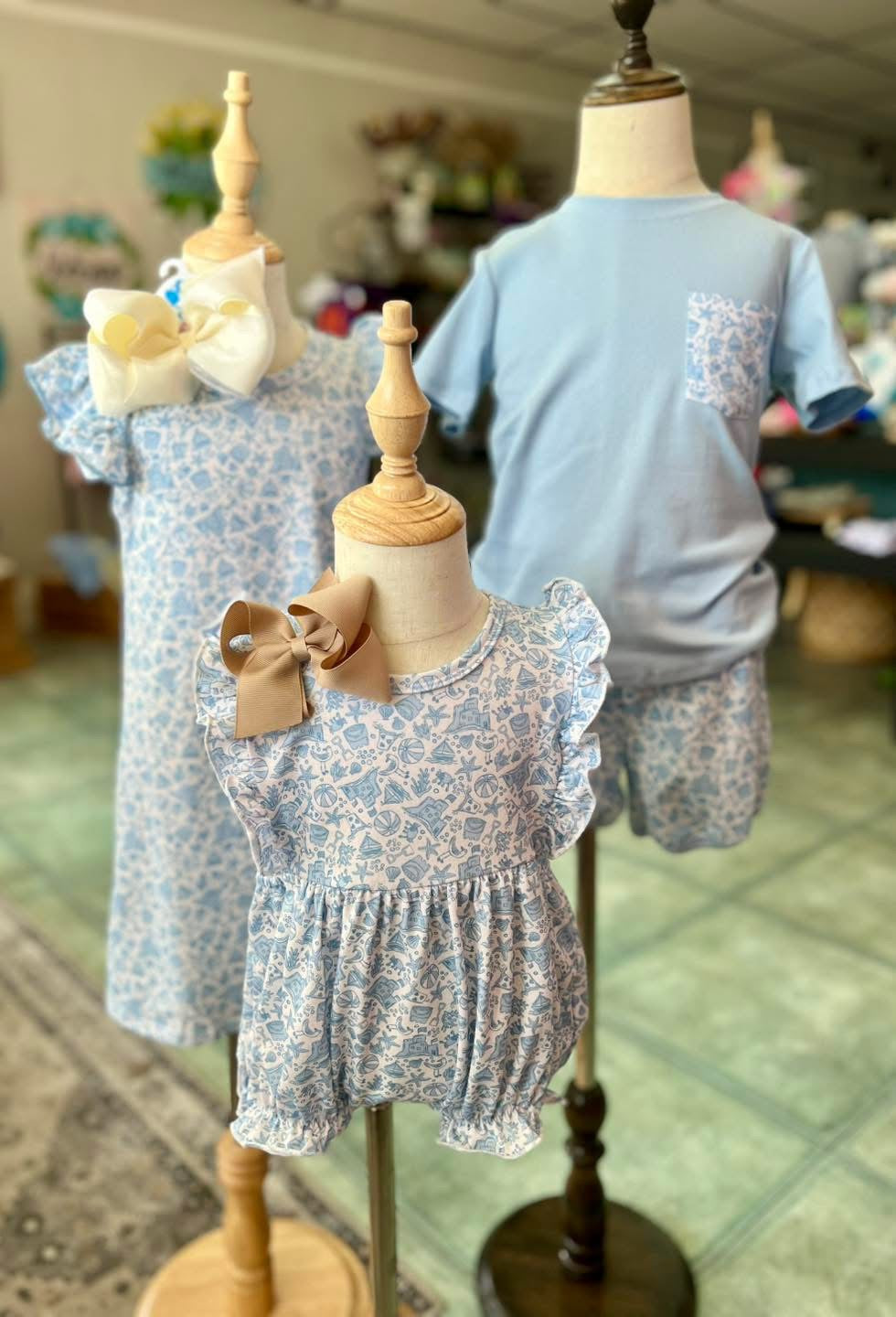 Easy, breezy, and ready for beach adventures — this comfy boys' set includes a soft sky-blue tee with matching printed pocket, plus elastic-waist shorts in our signature coastal print. Mix, match, and play all day!
