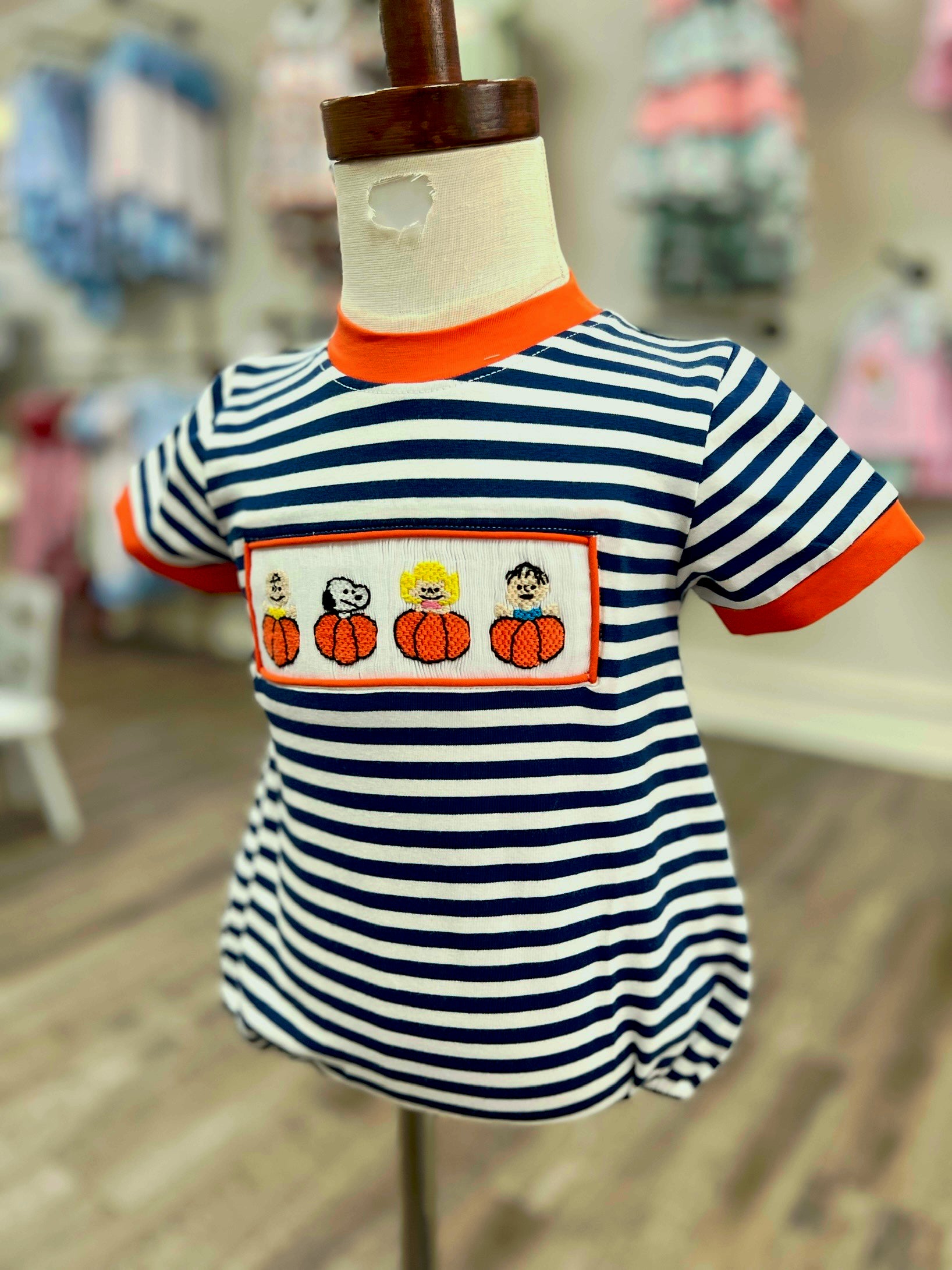 🍂 Say hello to fall fun with our Charlie Brown Came to Town Bubble! This smocked bubble brings timeless charm with a playful nod to everyone’s favorite pumpkin patch pal. Navy blue & white stripes with the cutest hand embroidered Charlie Brown & his Peanut Crew!