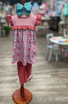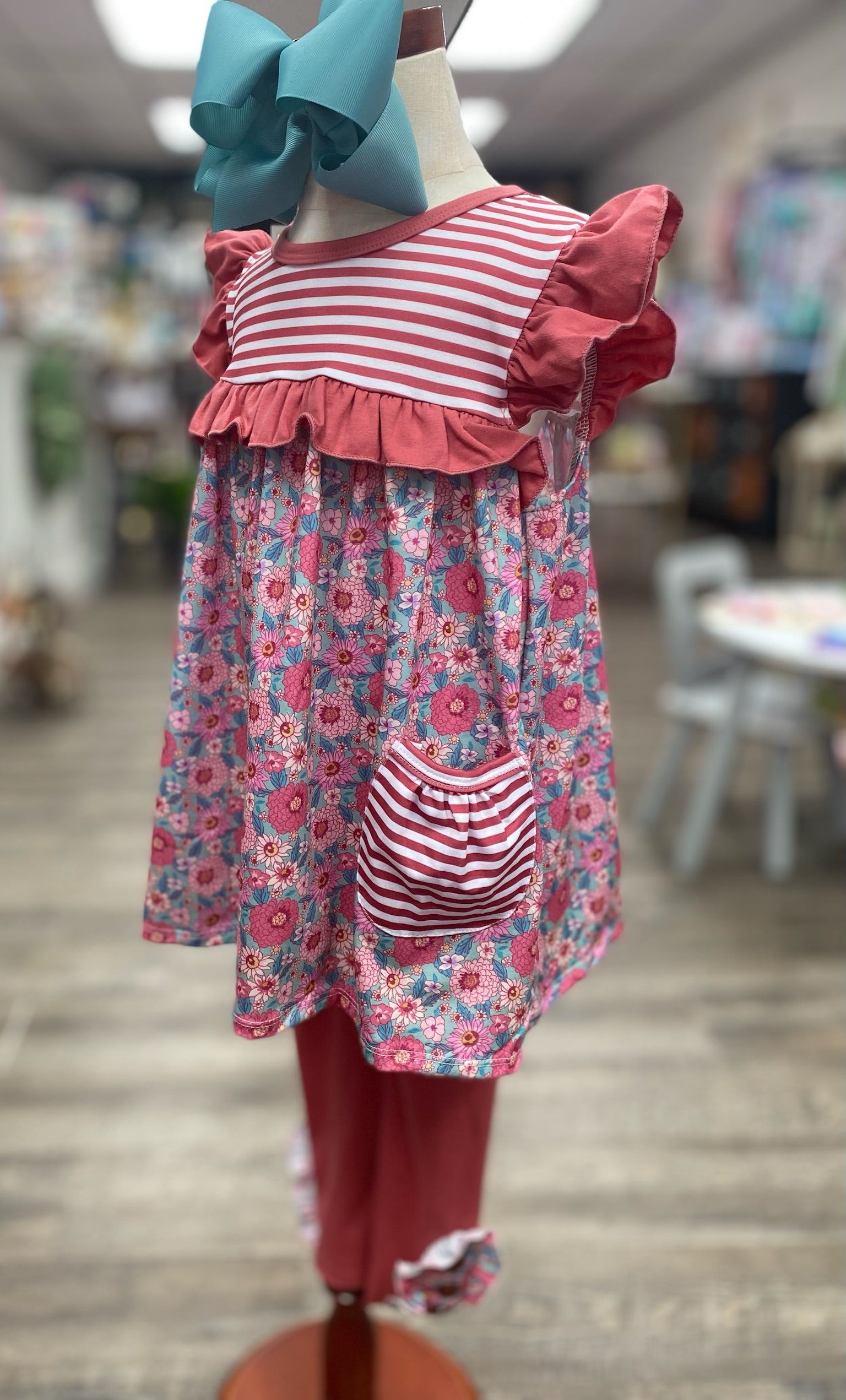🎀 Girl Set: Floral ruffle tunic with matching cranberry striped ruffle pants
