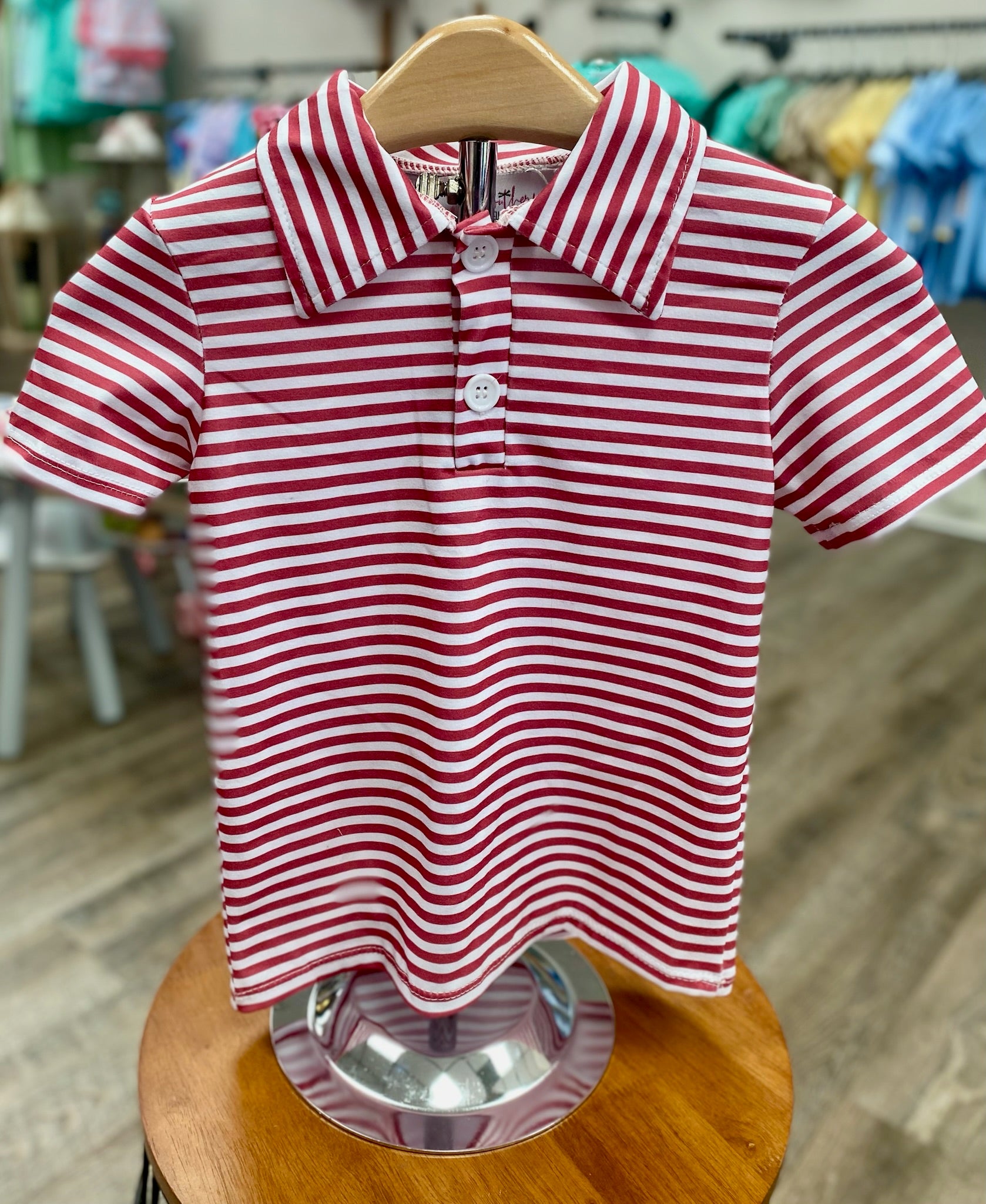 👦 Boy Polo: Soft knit cranberry stripe polo with button details