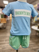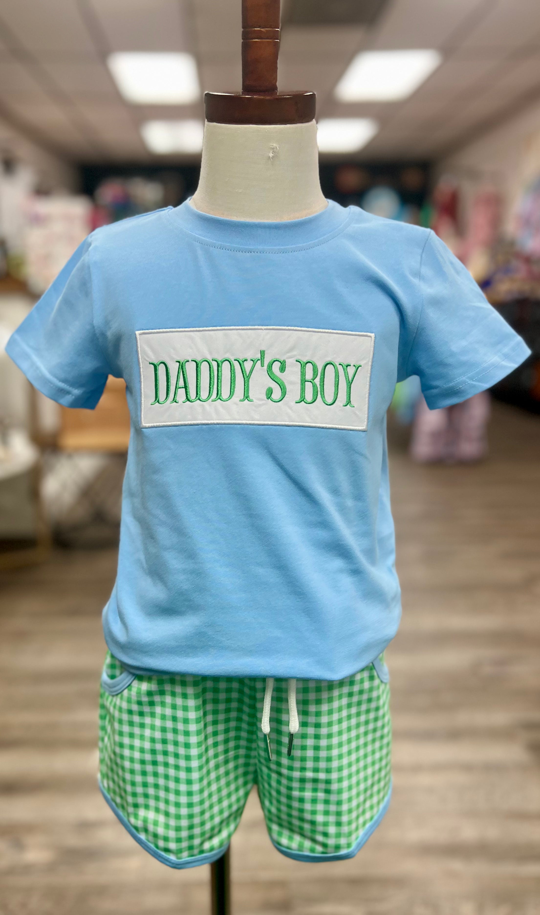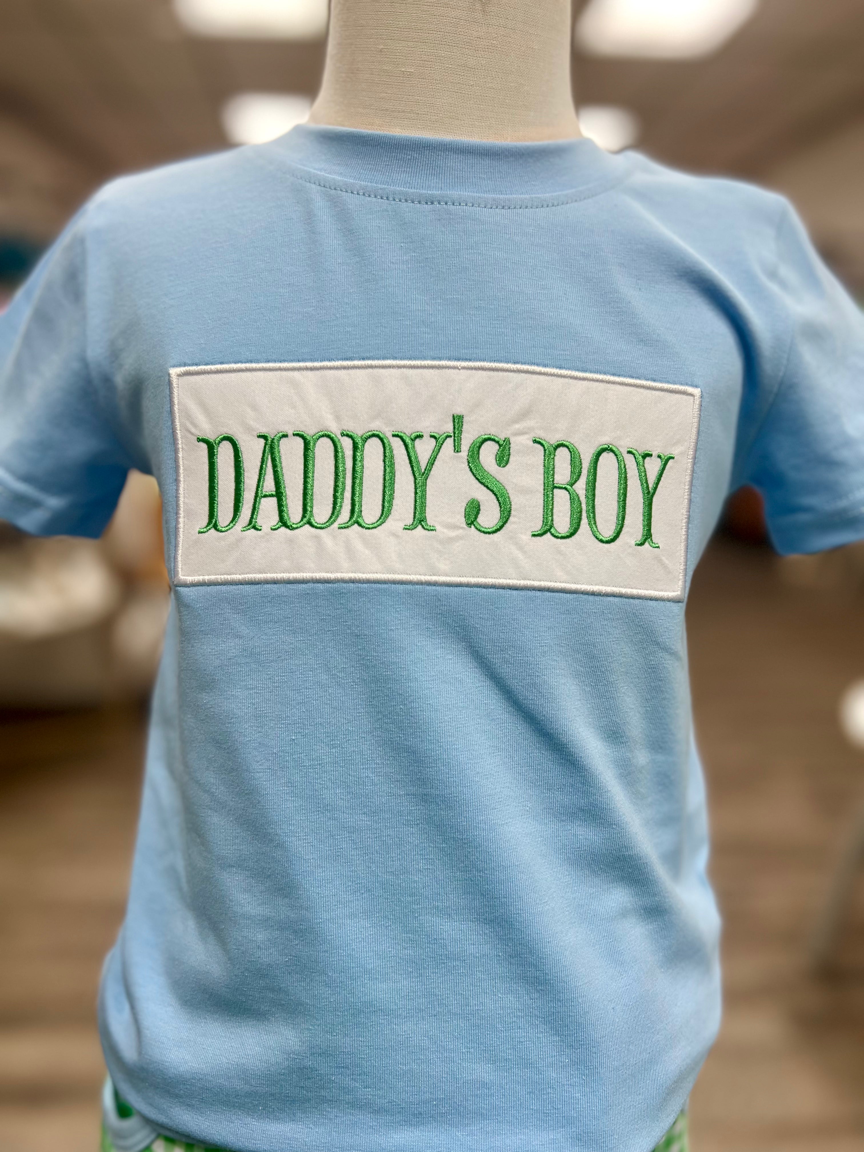 - Soft baby blue knit tee with "Daddy's Boy" embroidery