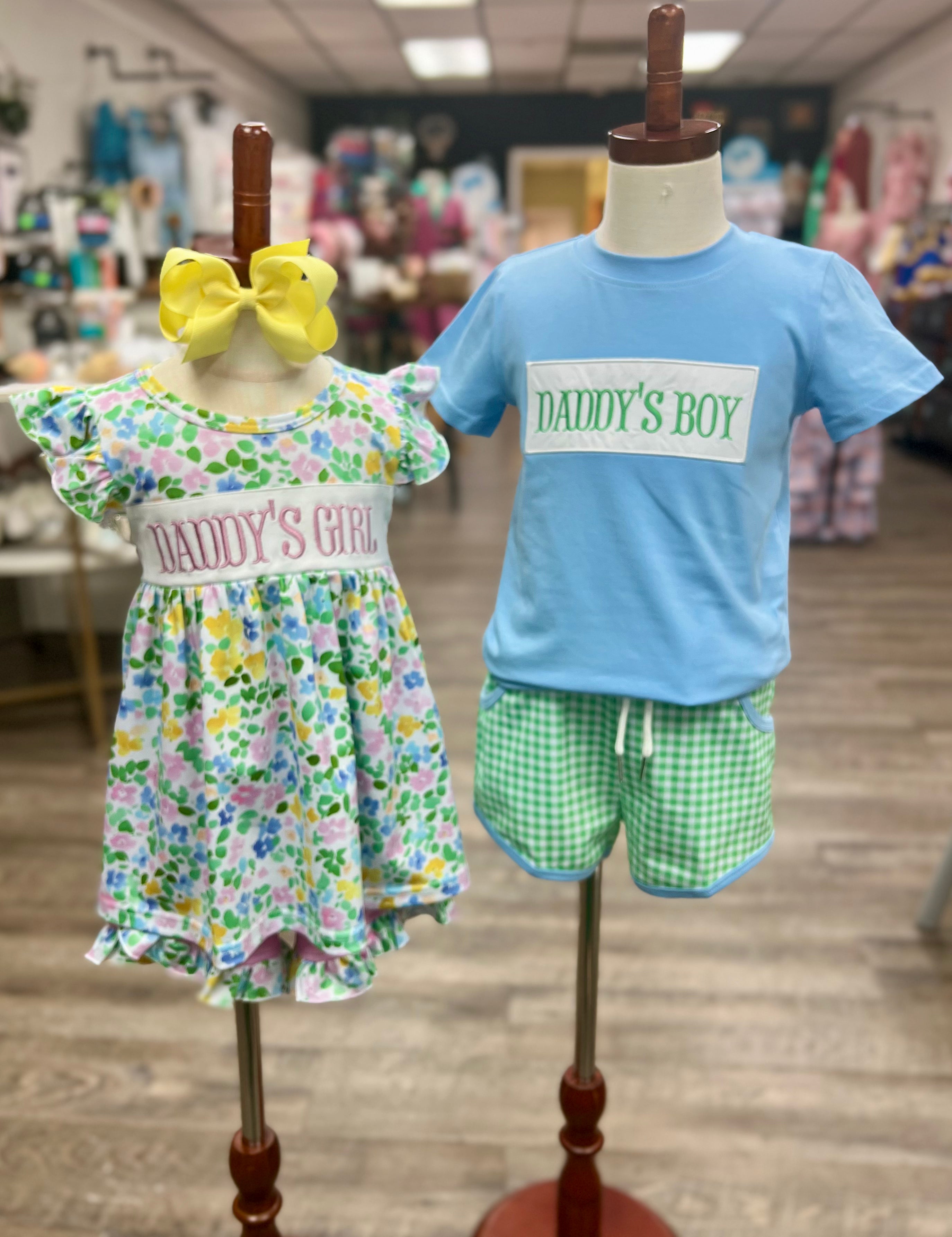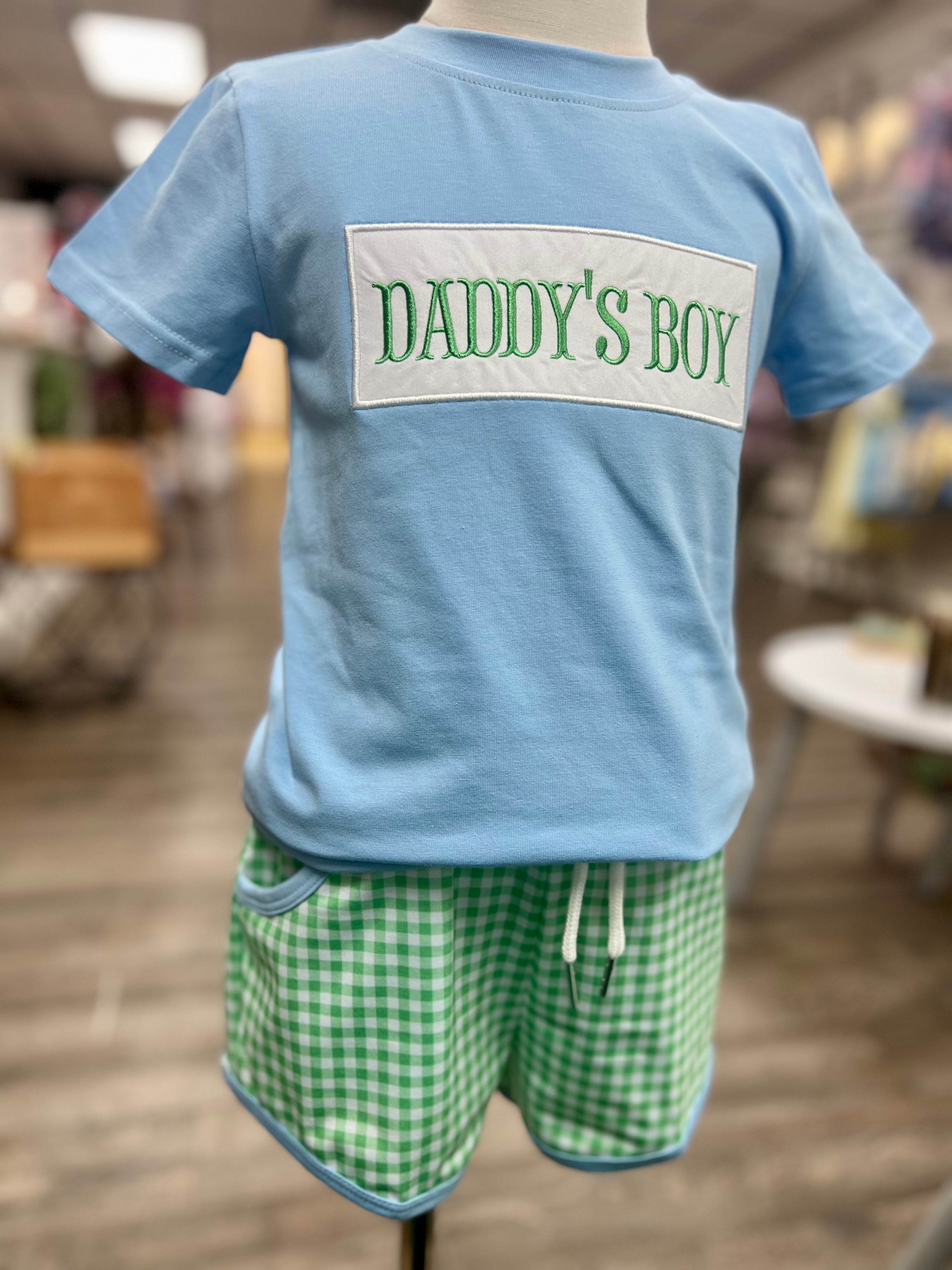 Every superhero needs a sidekick-and this set is made for the little guy who shadows Daddy wherever he goes. Daddy's Sidekick features a soft knit tee with bold embroidery and the sweetest green gingham shorts to match.