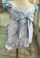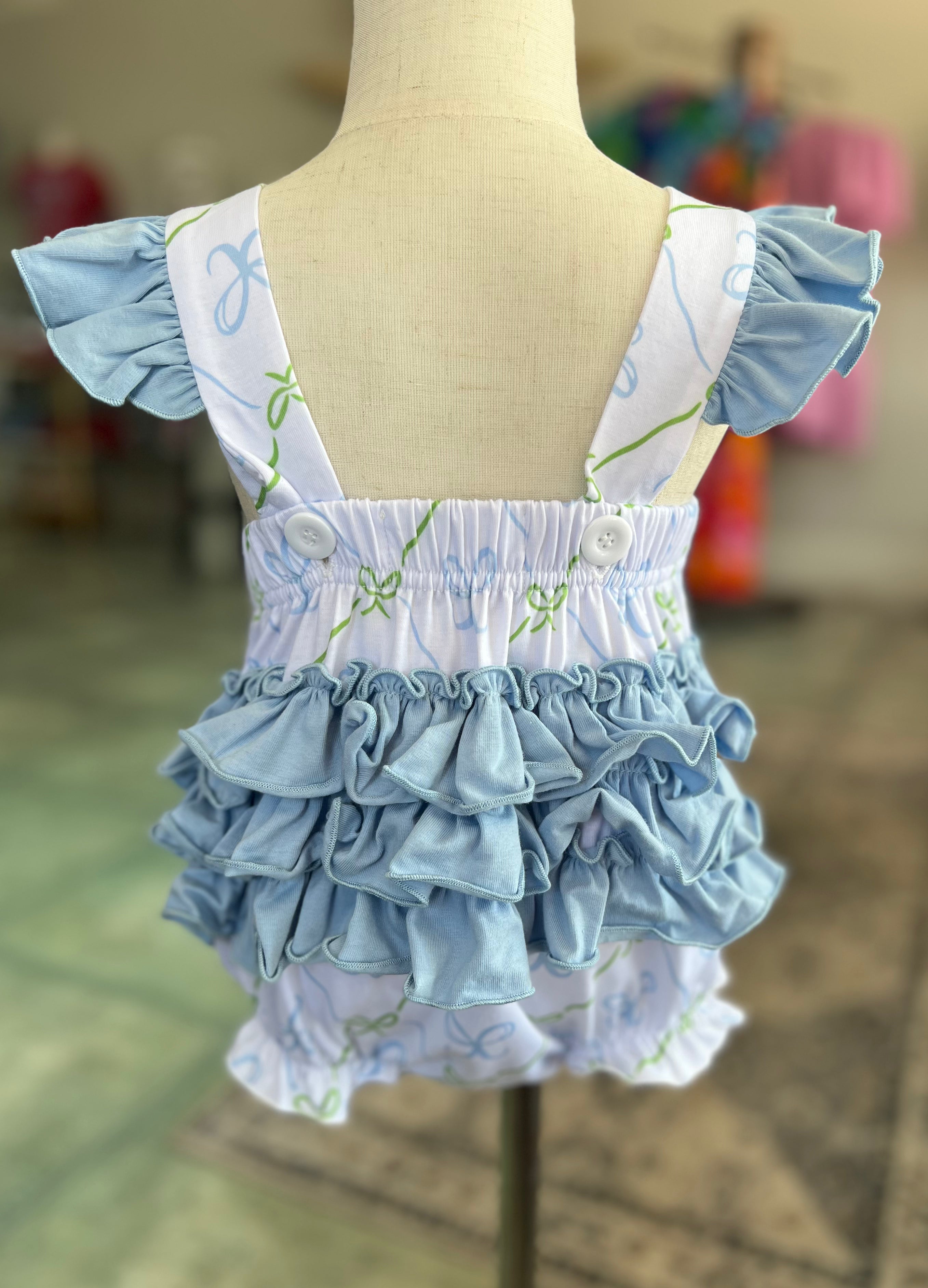 The Ellie Sage SunSuit features a flutter sleeve silhouette, a soft pastel bow print, and the prettiest oversized sky blue bow that steals the show. It’s picture-day perfect but comfy enough for every day.