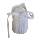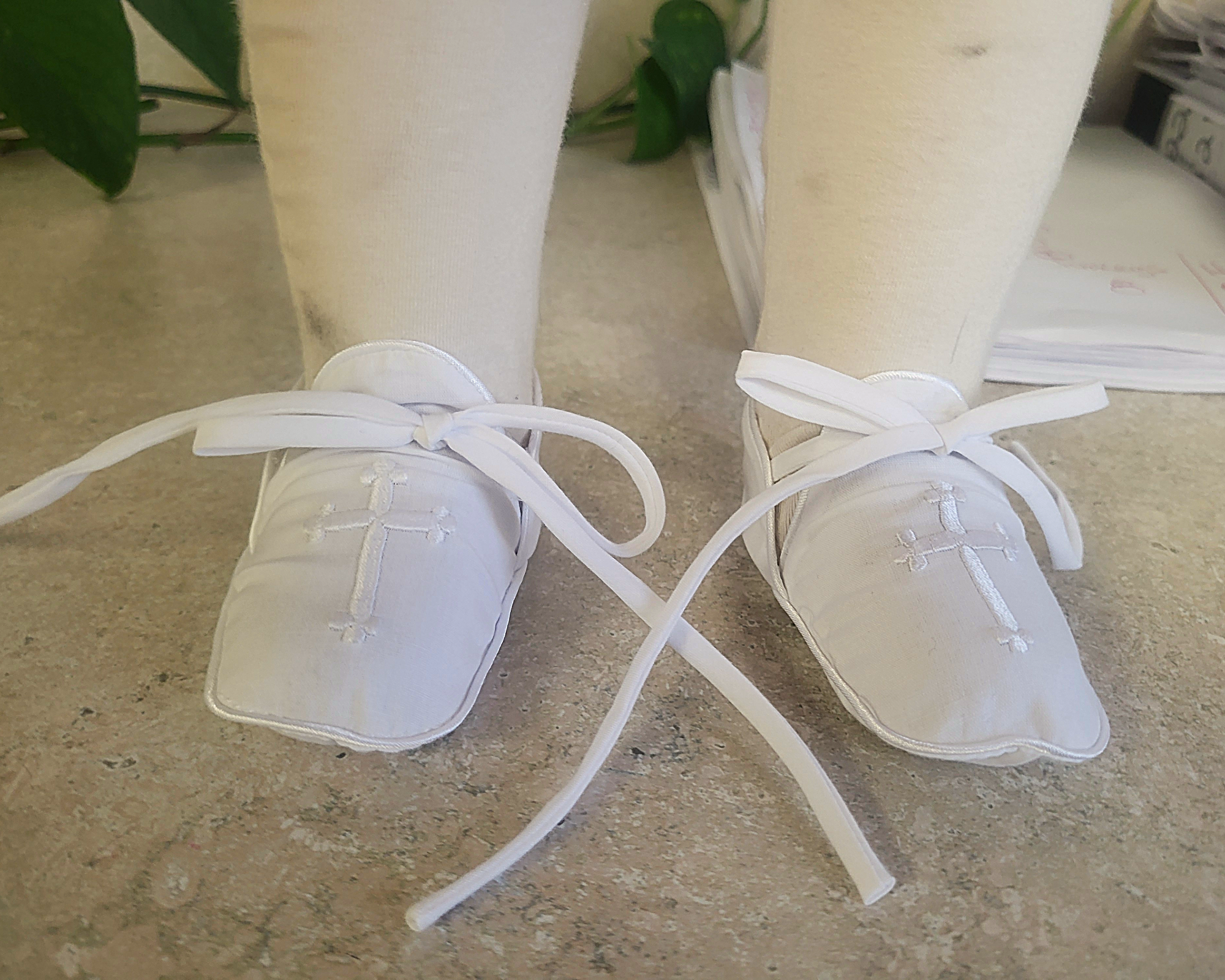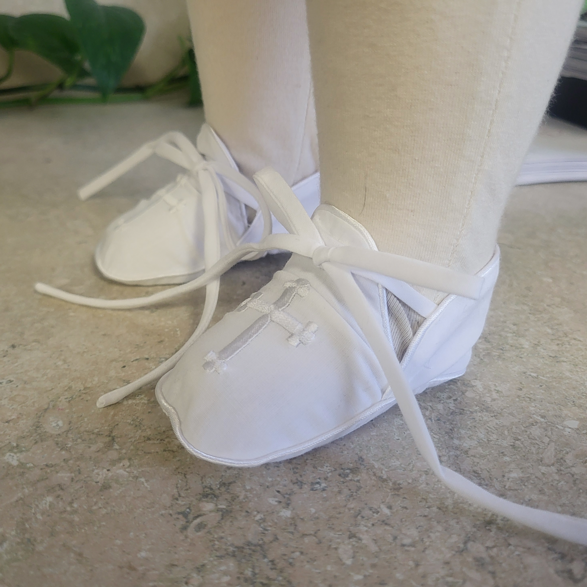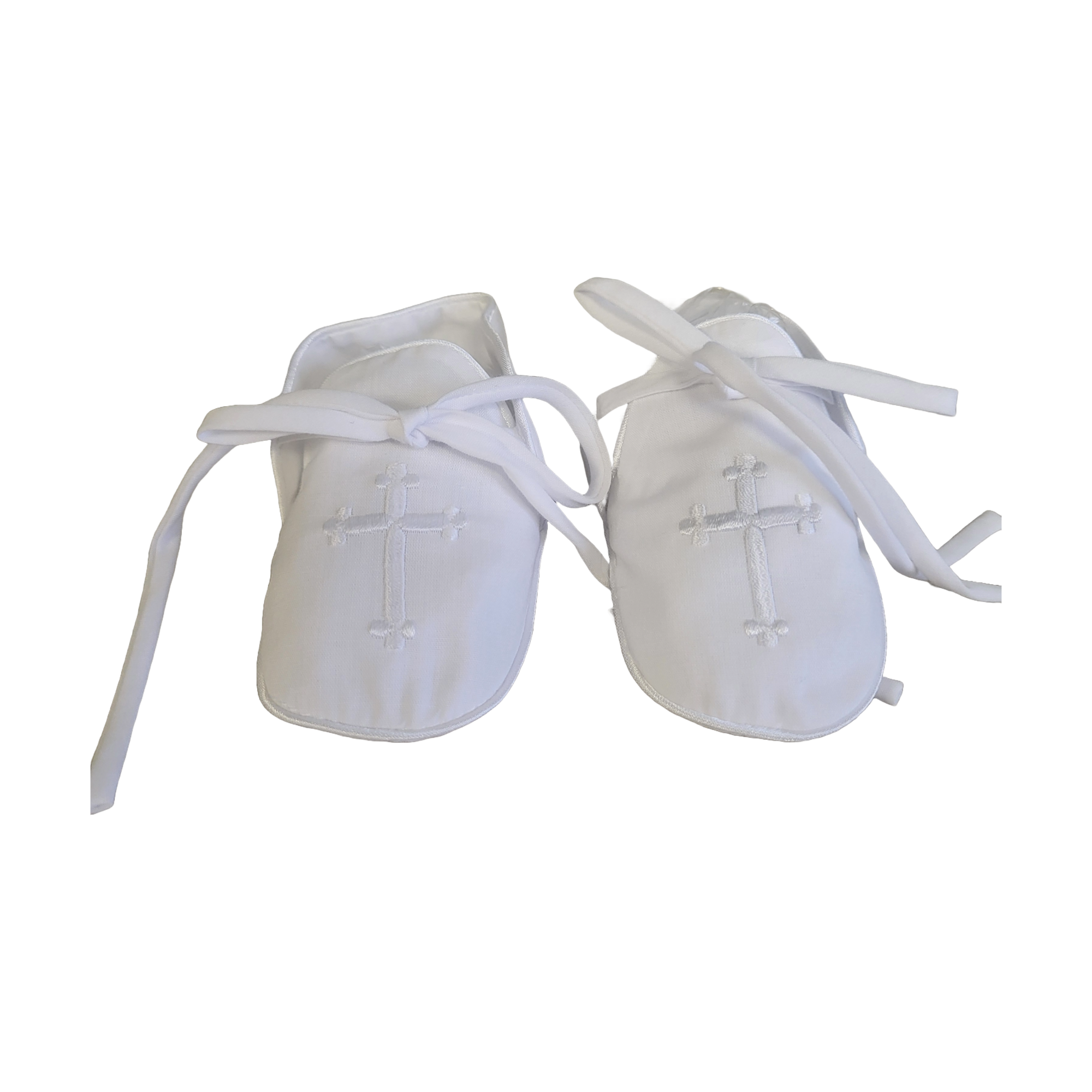 Our white cotton blend booties makes a beautiful baptism or christening accessory for baby boys and girls. A beautifully embroidered satin stitch cross adorns these sweet booties with a rich satin edge trim, your little precious little one will look simply sweet on their big day. These heirloom-quality booties are sure to become a treasured keepsake and is perfect for family photos. The lightweight fabric keeps little ones cool and comfortable and is easy to care for - just machine wash and tumble dry. 65% Polyester/35% Cotton