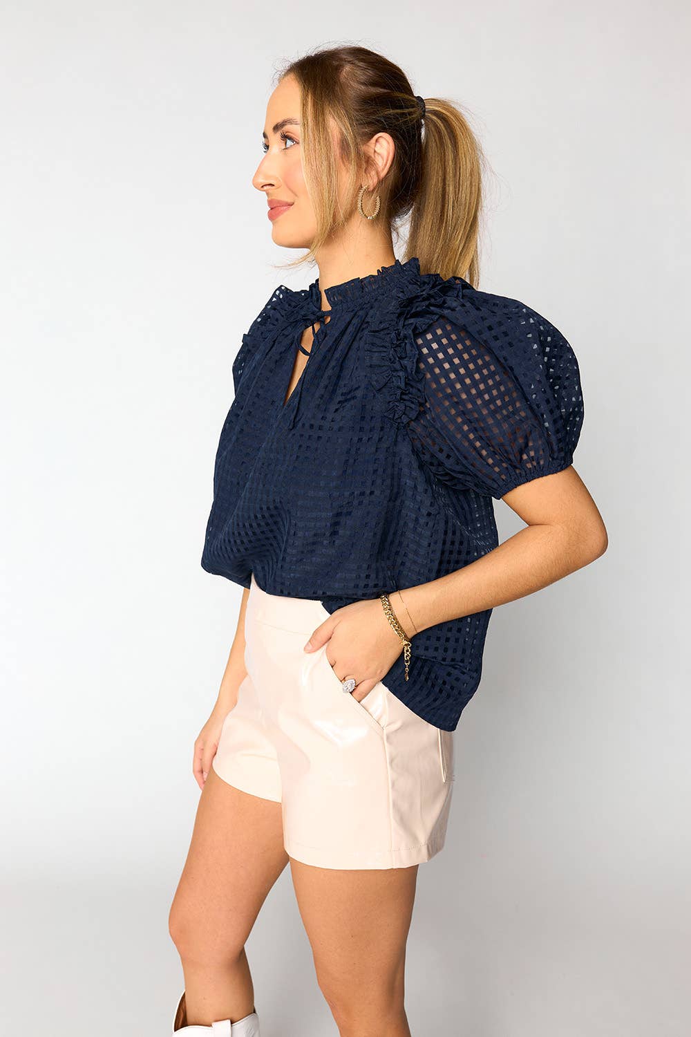Our Essie top is a customer fave! She features a puff sleeve, shoulder ruffle detail, and tassels. Essie is a classic blouse with a twist and a fun checkered fabric to add some flare. We love her because she can be dressed up or kept casual, and transition from fall to spring. Add her to your cart now!