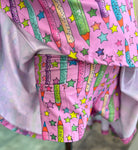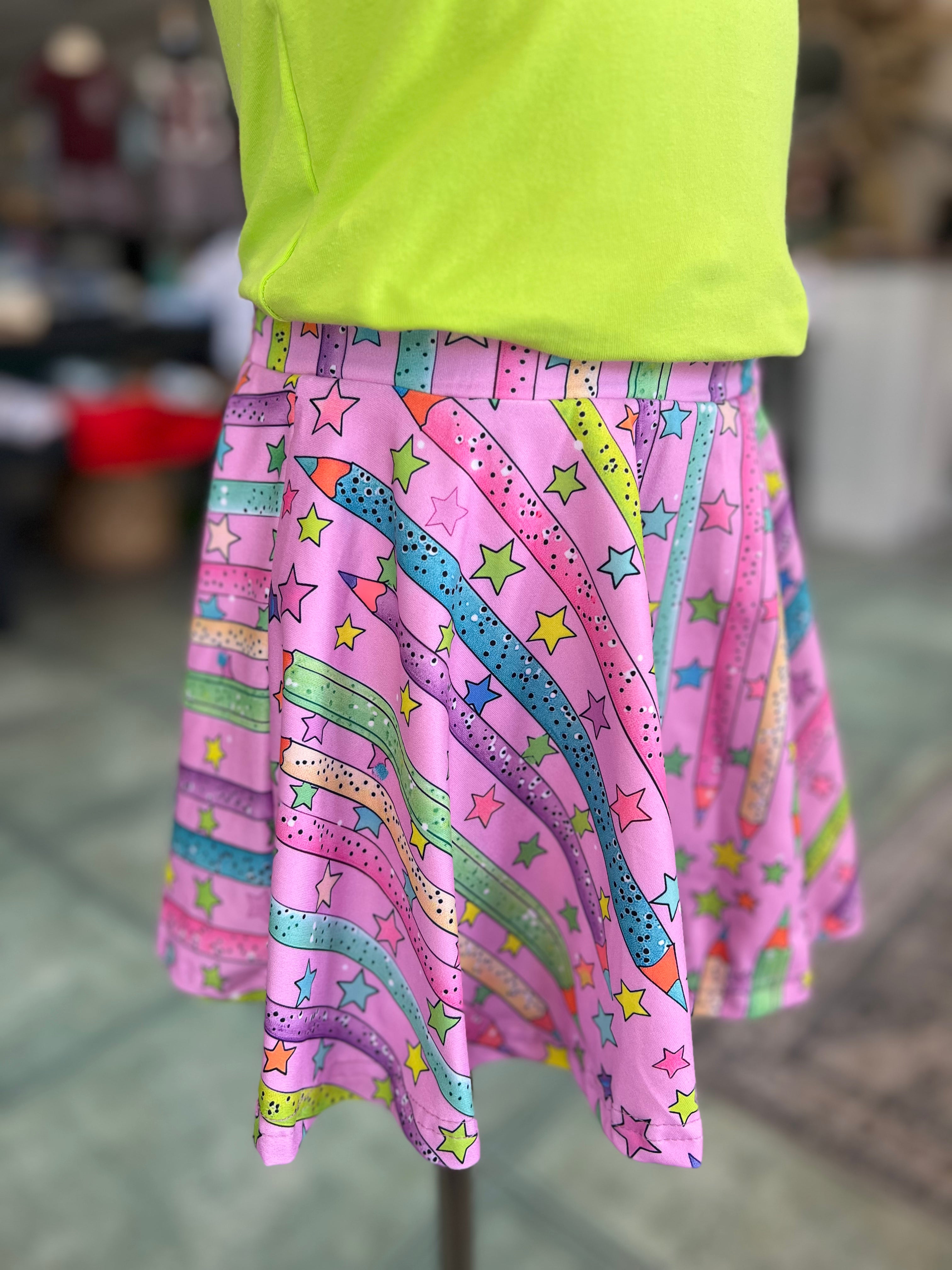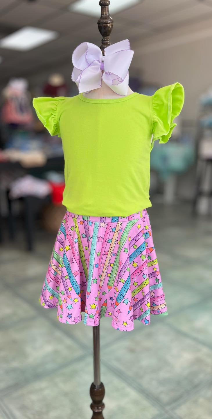 This girls’ set includes a flutter sleeve black top and a twirl-worthy skirt featuring playful prints of apples, books, bows, and stars — made for classroom cuties and confident first-day moments.