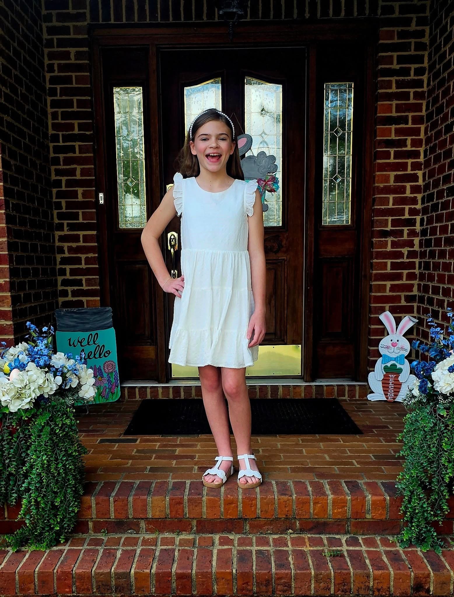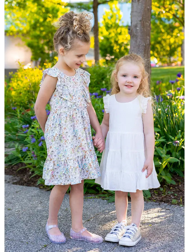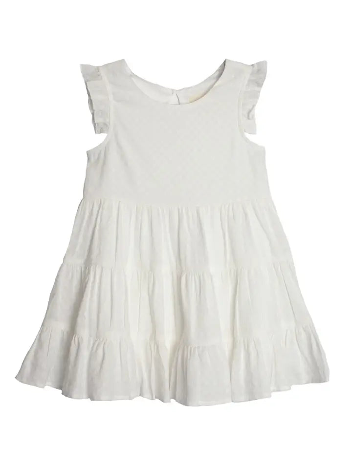 This Mabel and Honey natural waist dress features flutter sleeves and a ruffled skirt, adding a touch of whimsy. The pure white cotton fabric is soft to the touch, with subtle embossed detailing. Perfect for sunny days, this sleeveless design is both comfortable and stylish. Fabric Care 50% VISCOSE 50% COTTON / 100% POLYESTER Machine Wash Cold | Line Dry Do Not Bleach