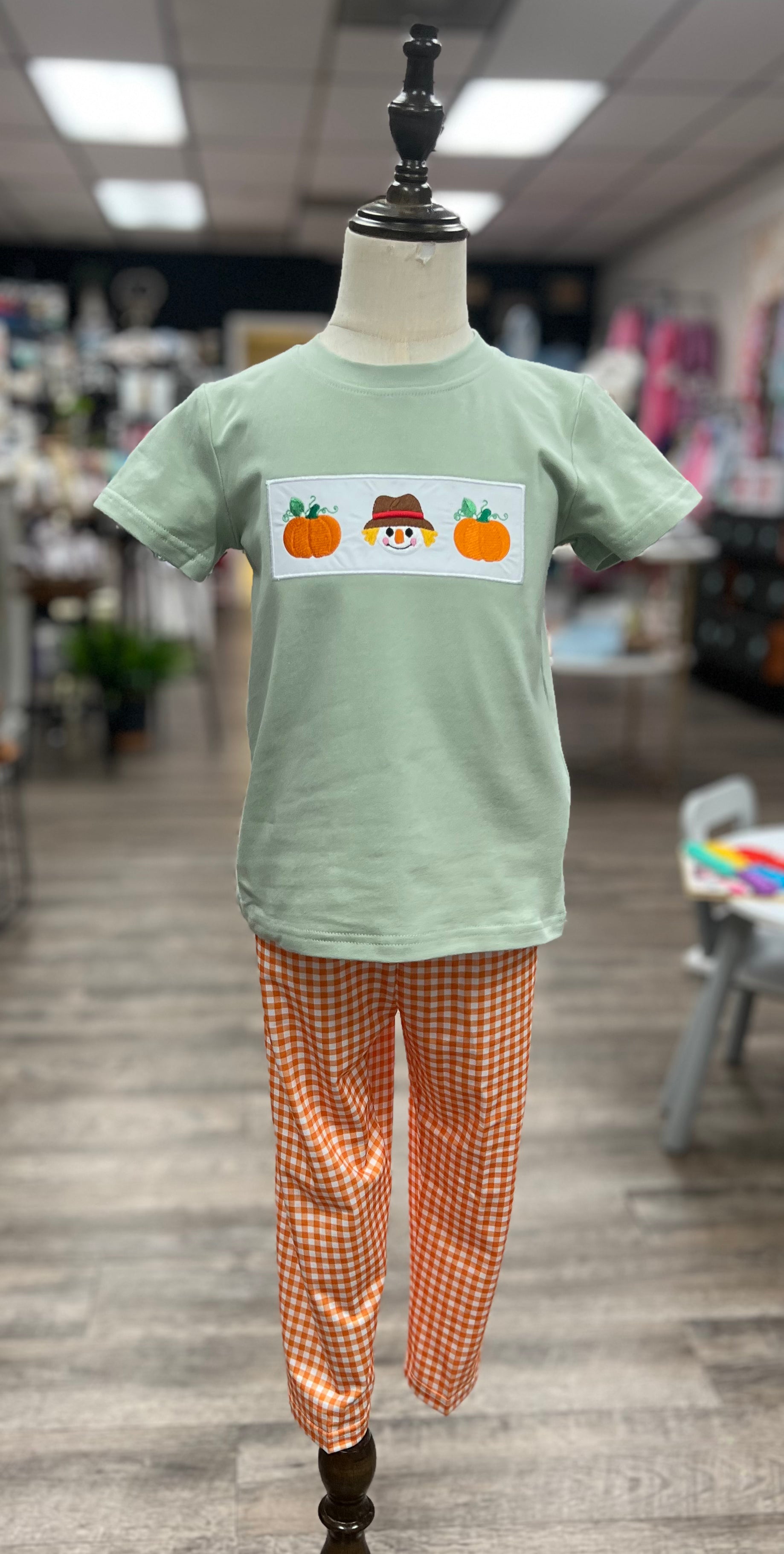 This two-piece set features an embroidered harvest scene applique on the front of the shirt, paired with coordinating orange & white checkered elastic-waist pants for comfort and class. Dressy enough for Thanksgiving Day and durable enough for a little backyard leaf-jumpin’. Southern styling meets real-kid comfort.