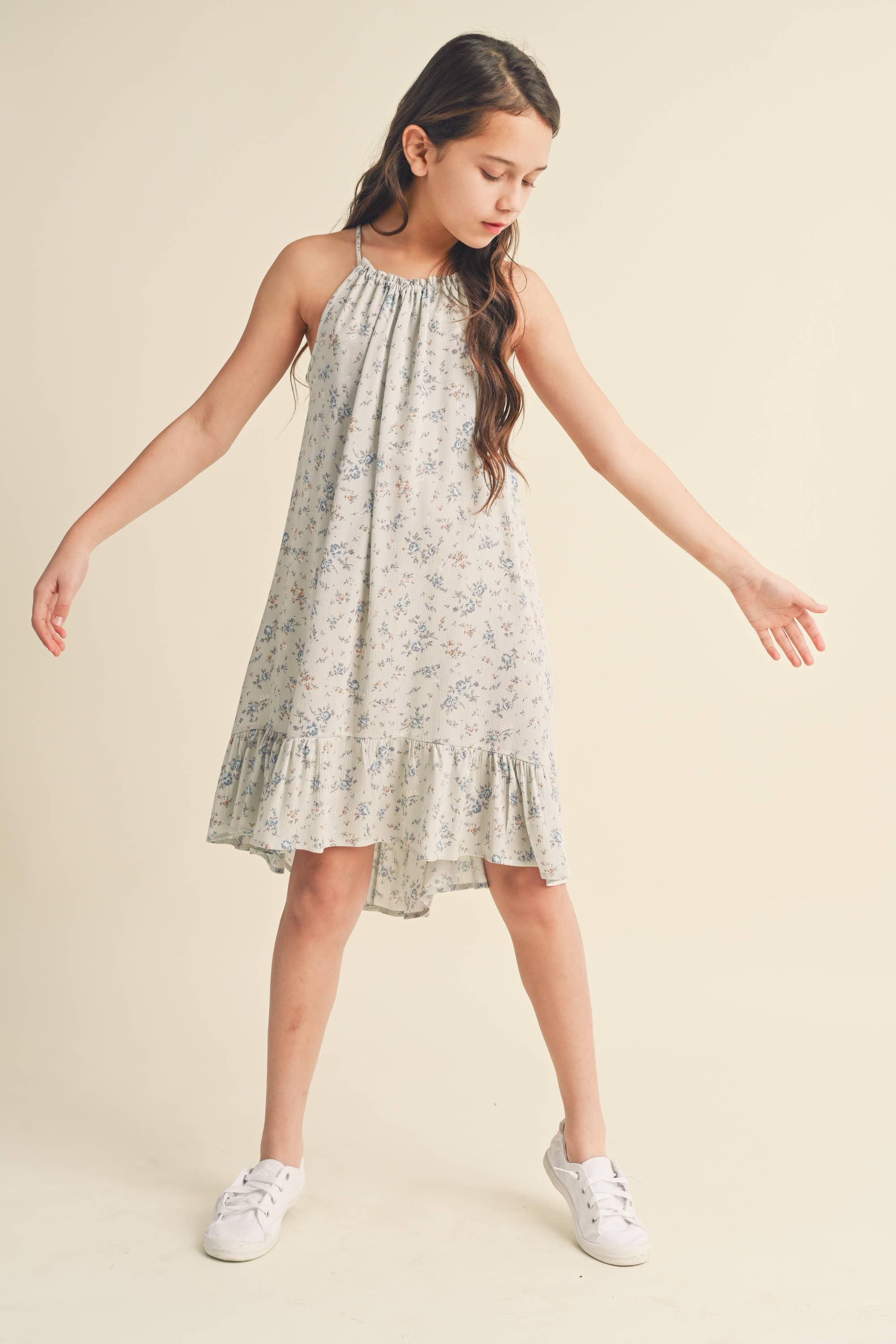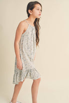 KIDS EASTER VALENTINE HALTER FLOUNCE DRESS A-line silhouette- fitted at the top and gradually widens towards the hem, creating a flared and flowy shape. This design is flattering and comfortable for various body types. The combination of the halter neckline and flounce detailing gives the dress a youthful and playful aesthetic.
