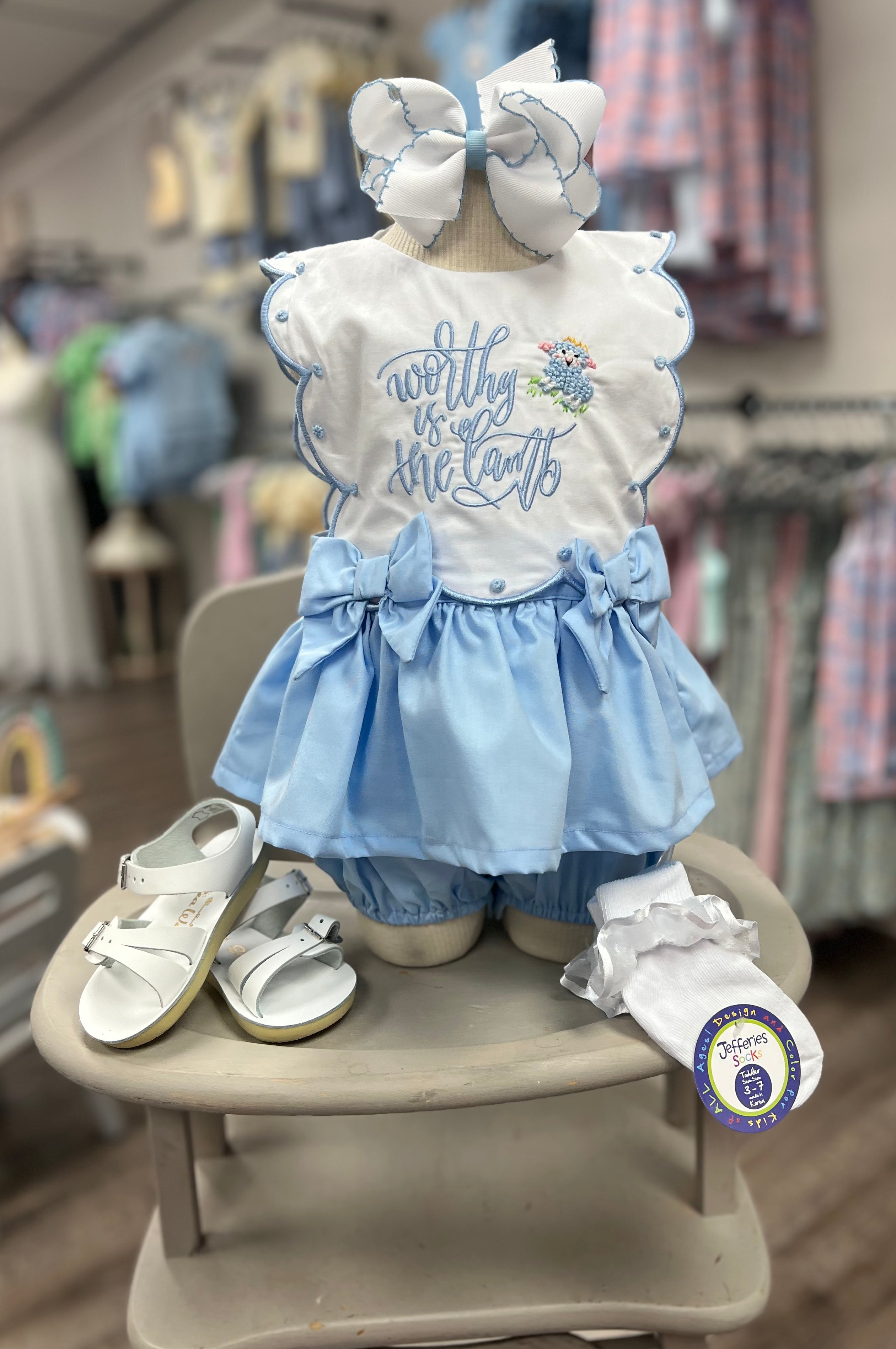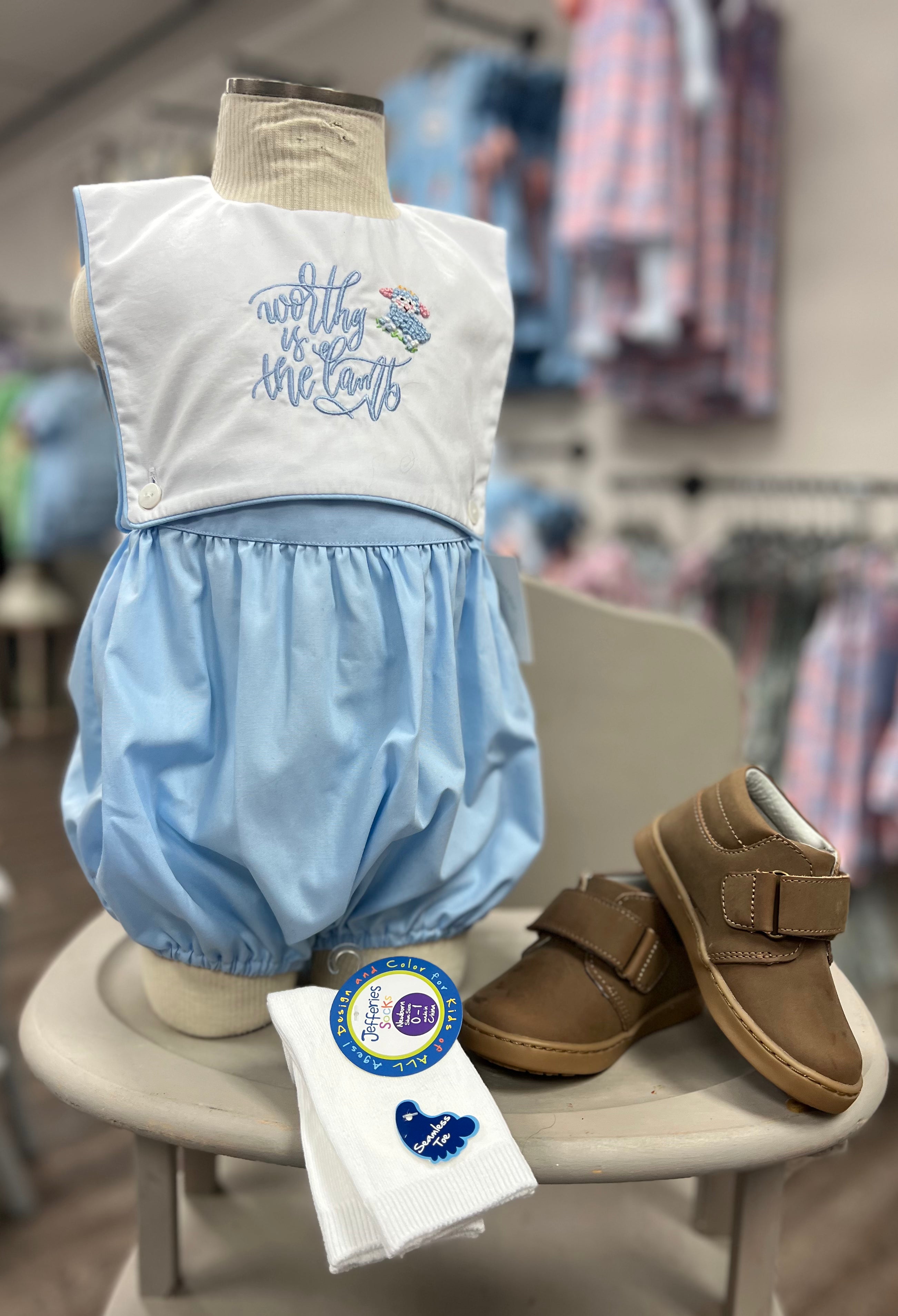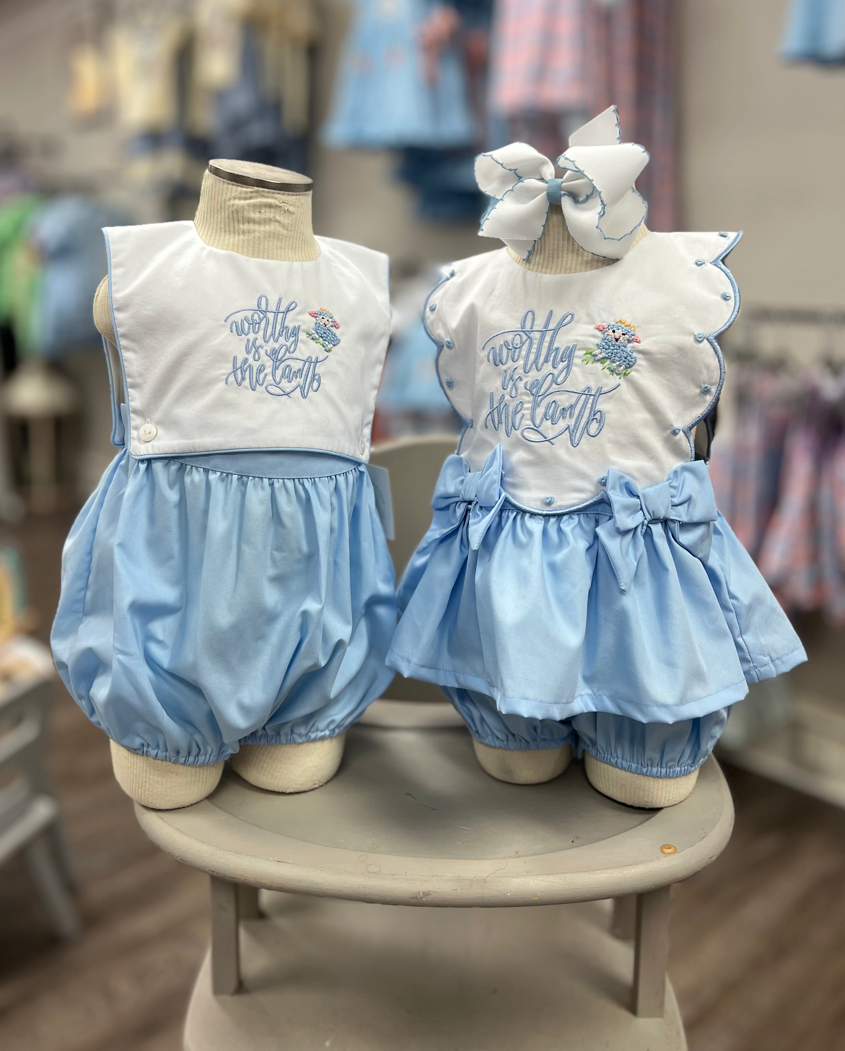 The Lamb of God Heirloom Bubble blends traditional charm with meaningful detail—perfect for baby boys or girls on special occasions. Crafted with heirloom-quality fabric, soft pastel blue accents, and hand-embroidered “Worthy is the Lamb” script, this bubble is made to be passed down and treasured for generations.