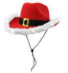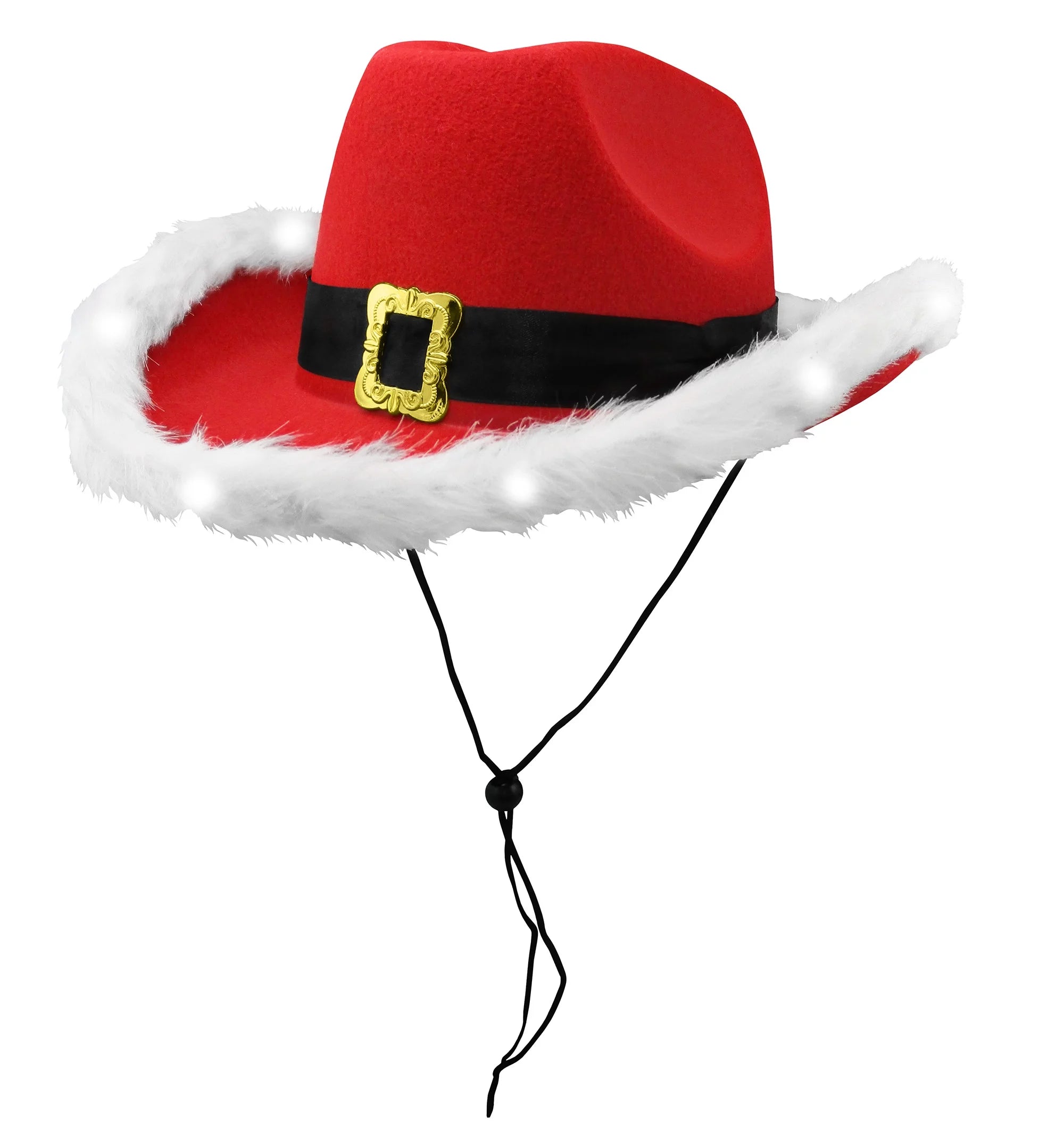 Crafted with festive cheer, this Light Up Cowboy Christmas Hat is sure to add sparkle and joy to any holiday celebration! Light up the night with red LED lights, wrapped in a classic red Santa Cowboy Hat. Shine with holiday spirit!