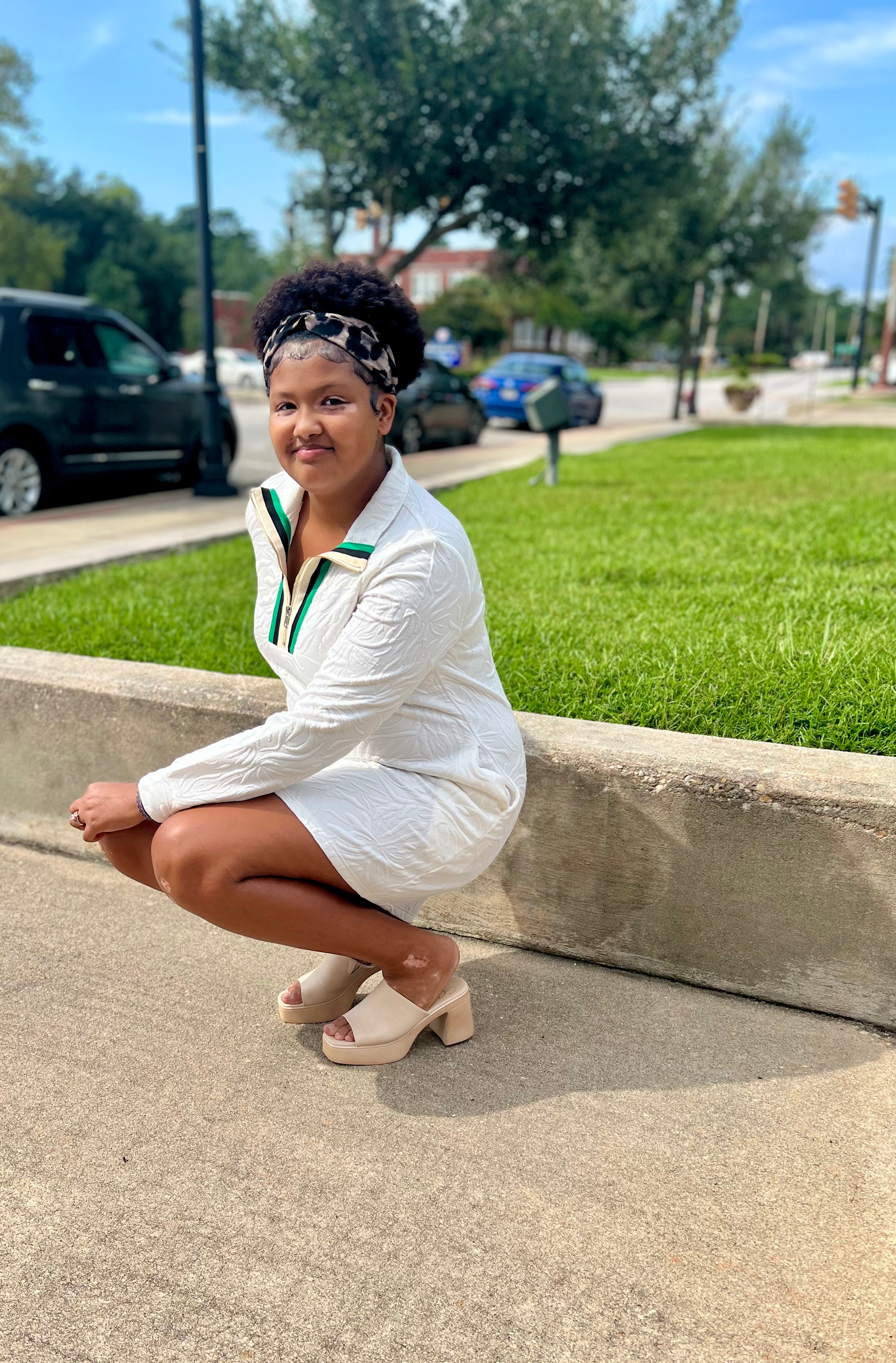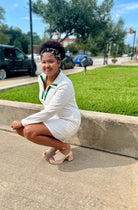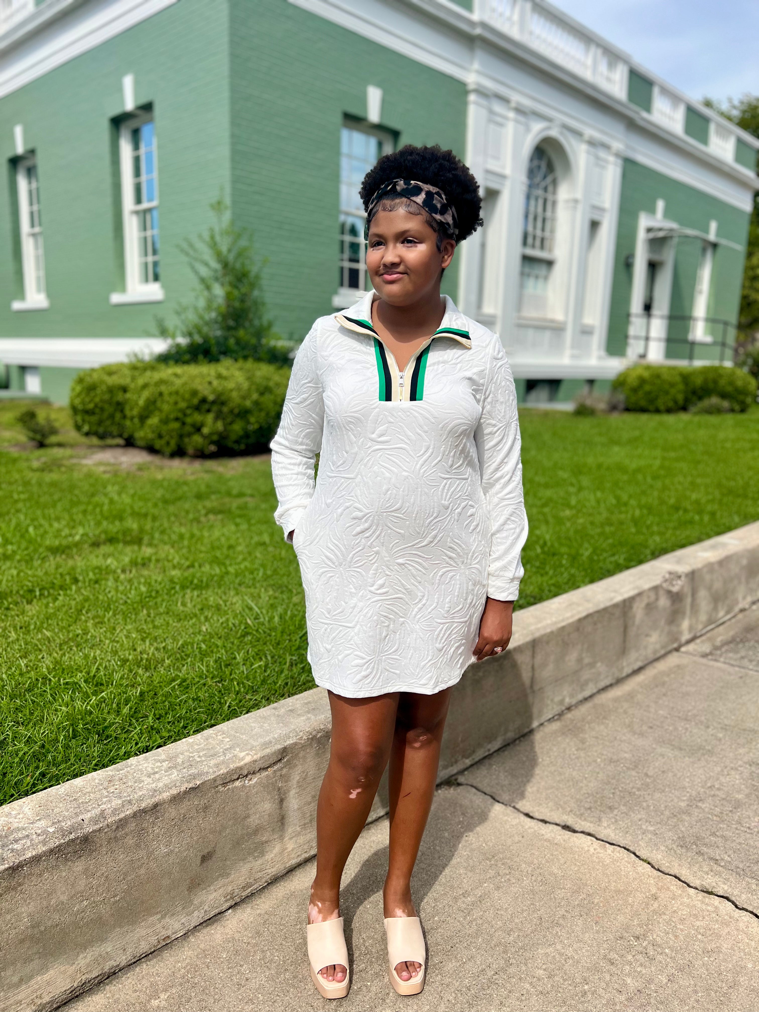 Crisp White with Green & Black Stripe Zip Detail