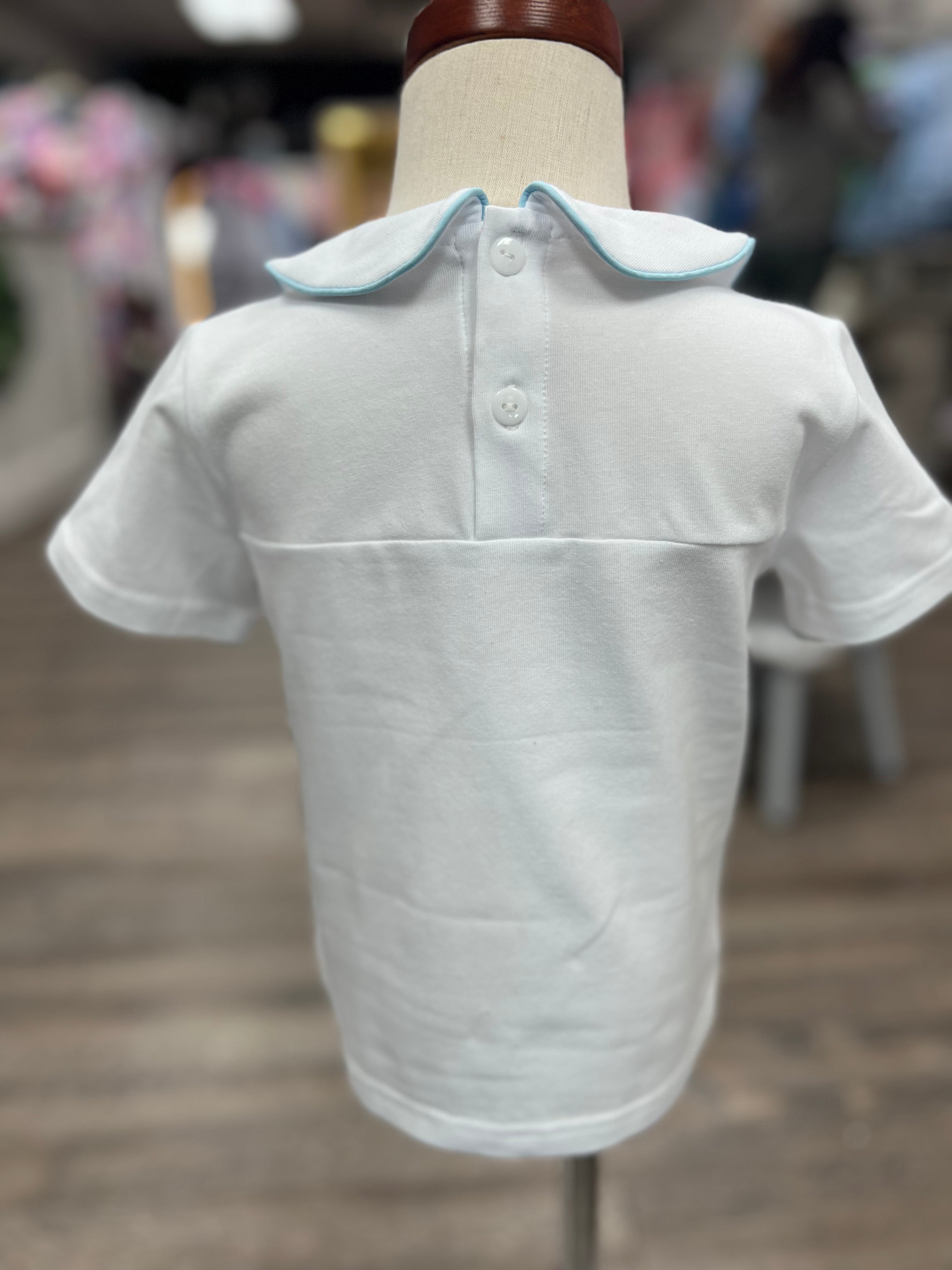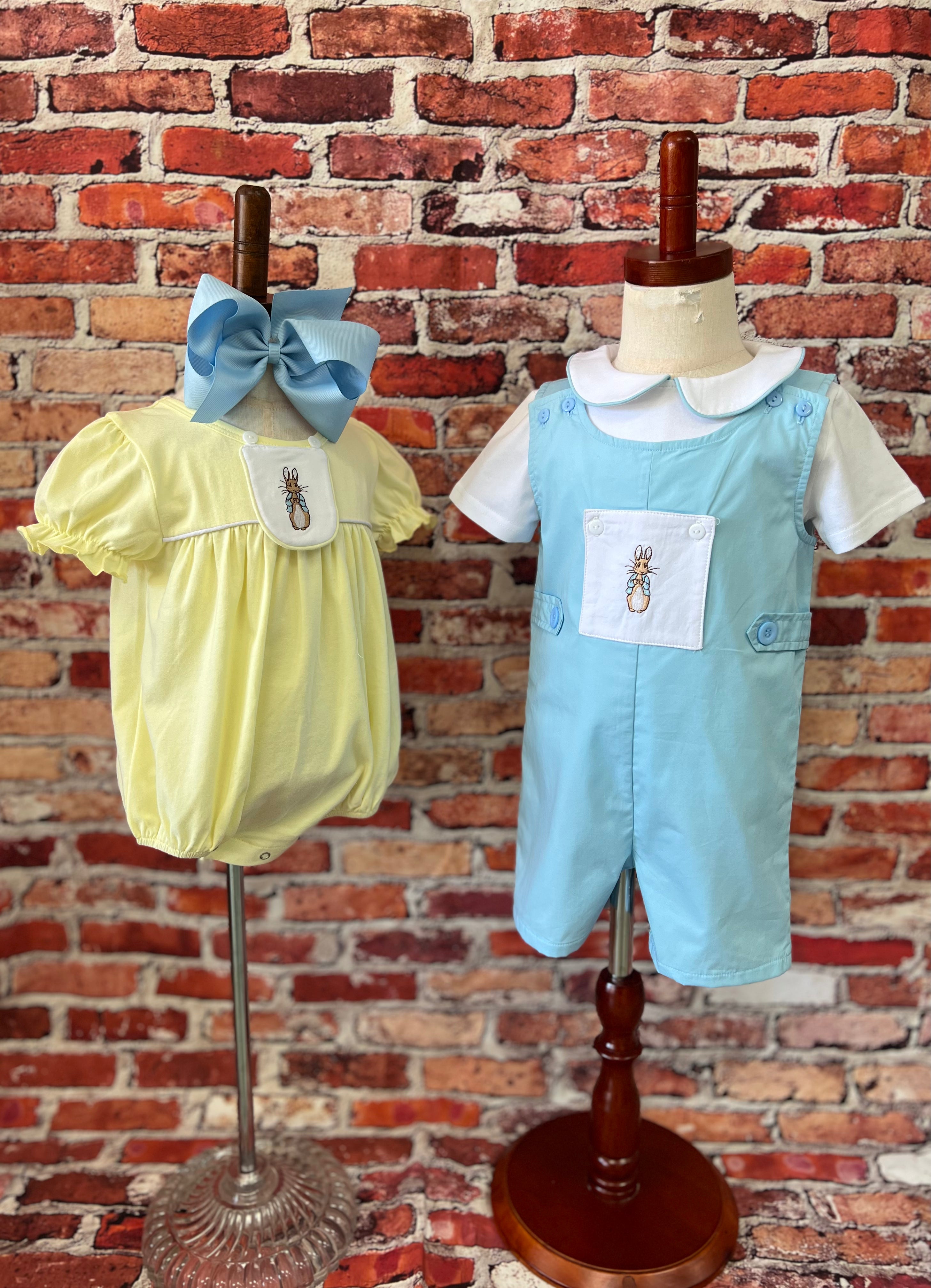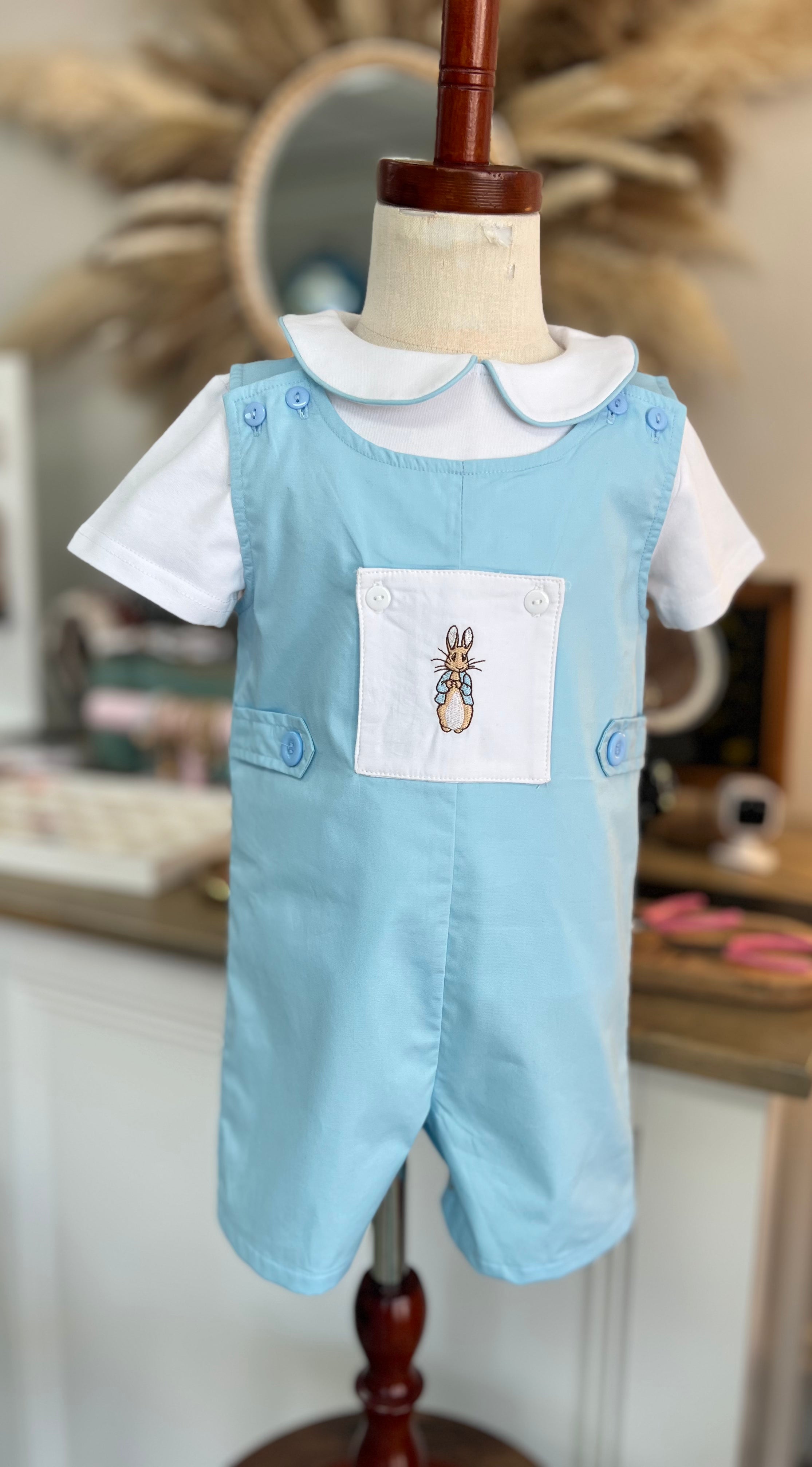 A timeless classic for your little gentleman. This light blue Jon Jon features a charming Peter Rabbit inspired embroidered bib, delicate button details, and a crisp white collared shirt underneath for a polished look. The perfect outfit for Easter Sunday, spring celebrations, egg hunts, or special occasions. Crafted from a lightweight, breathable fabric, this outfit ensures all-day comfort while keeping your little man looking dapper and sweet.Β