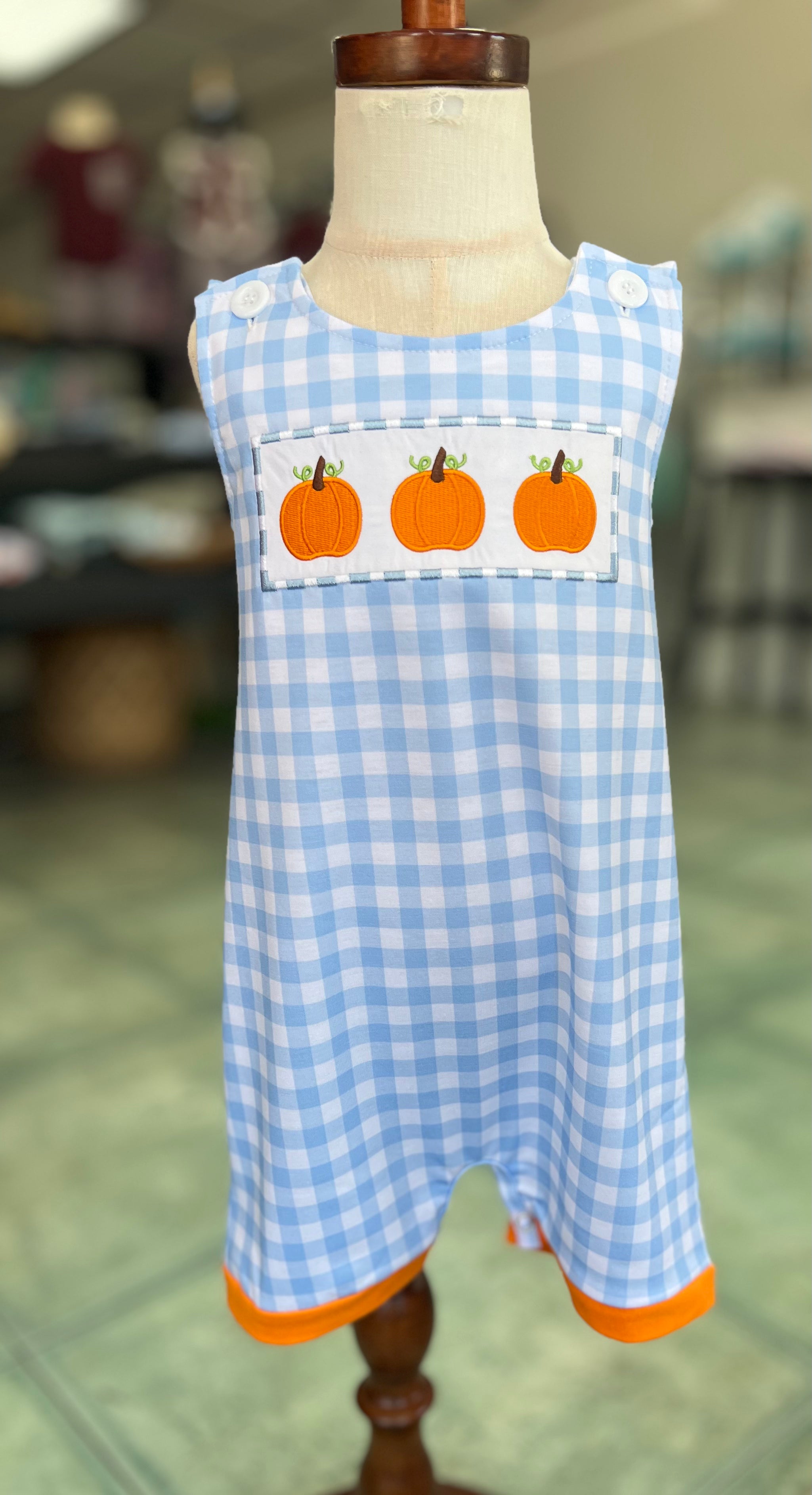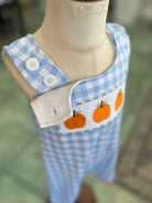 Cutest little pumpkin in the patch! 🎃 Our Pumpkin Patch Picnic Boys JonJon is made for fall’s tiniest trendsetters. Featuring a classic baby blue gingham base, sweet pumpkin embroidery, and vibrant orange trim, this one-piece style makes dressing a breeze while keeping things stylish and seasonal. Snap closures for easy changes.