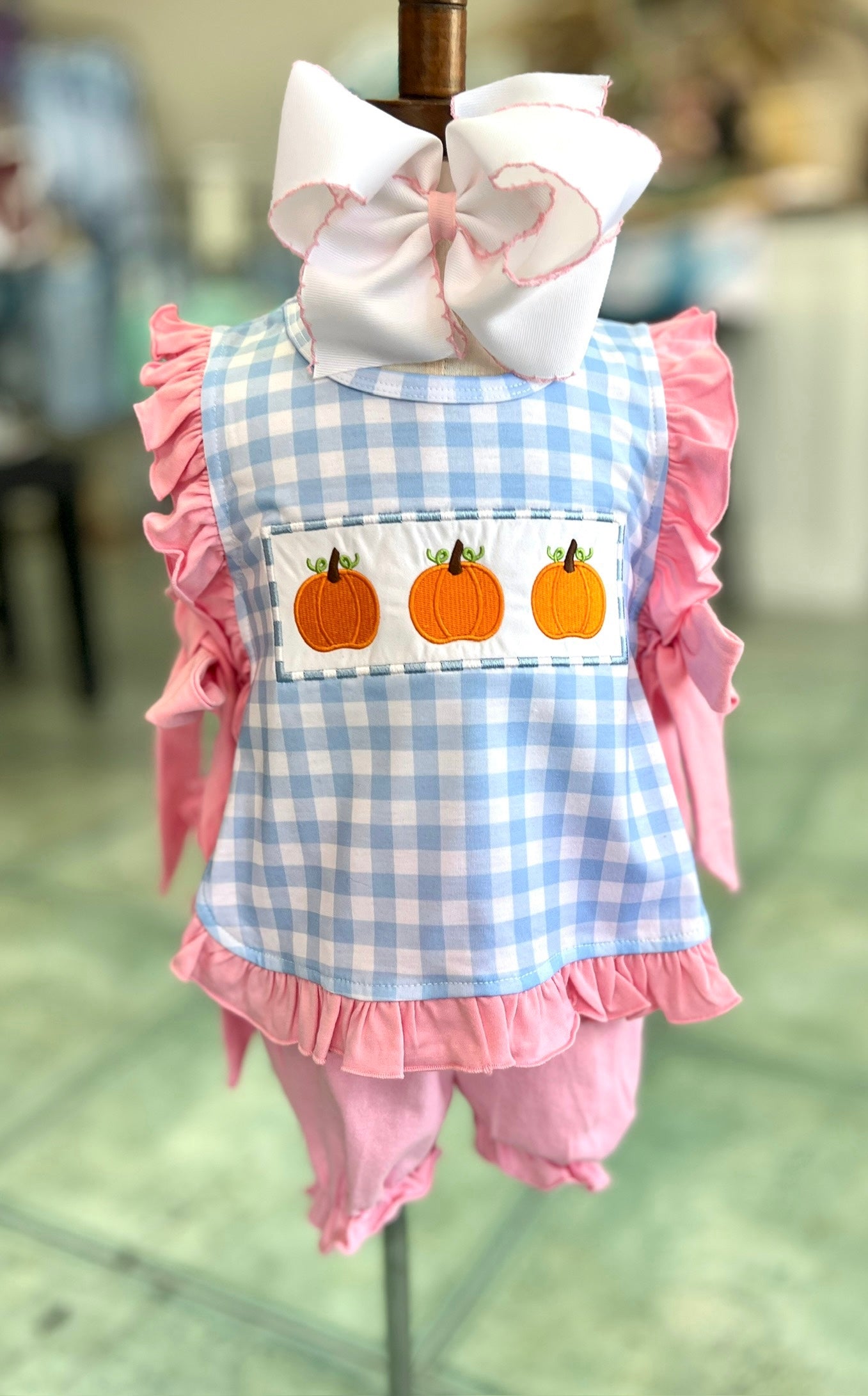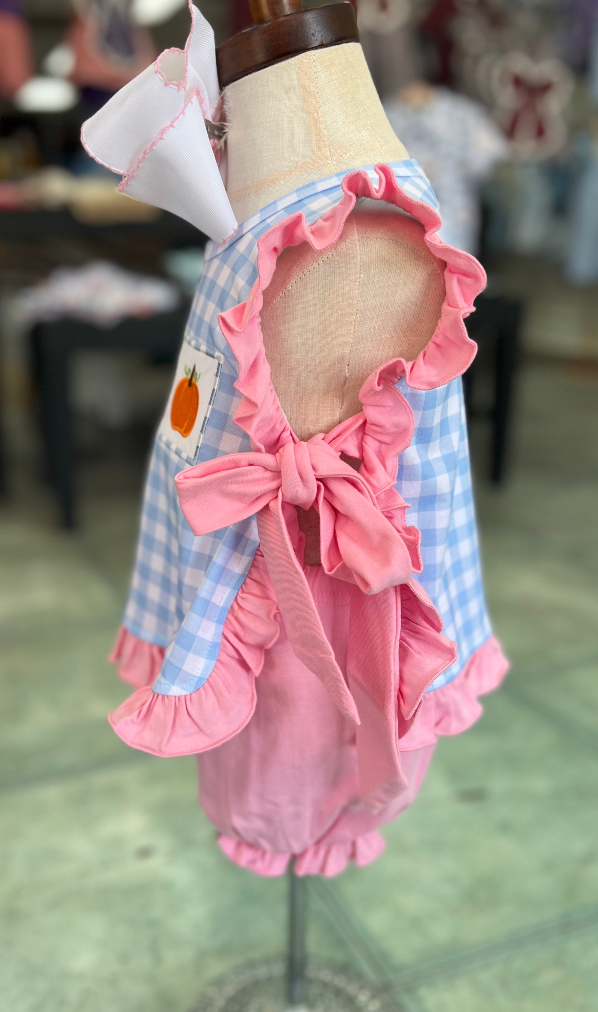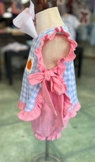 Sweet as pie! 🥧 The Pumpkin Patch Picnic Diaper Set is perfect for your littlest pumpkin. The top features blue gingham, pink ruffles, and the cutest embroidered pumpkin trio. Coordinating pink bloomers with ruffle trim complete the look, making it an easy go-to for fall photos and cozy days out.