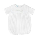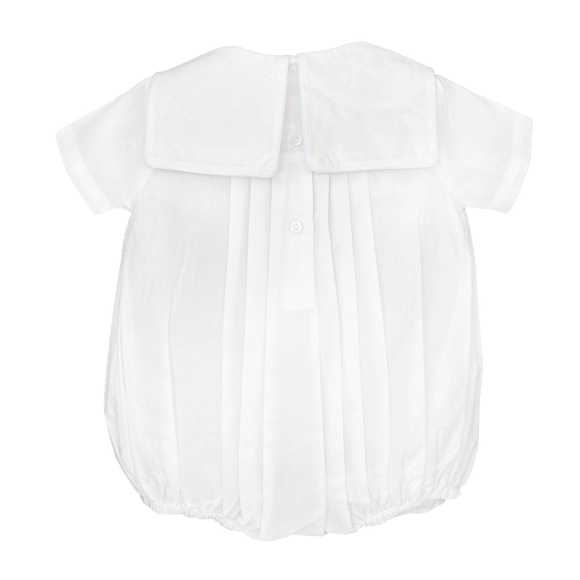 Talk about precious...this sweet boy bubble is traditional and whimsical. Our precious bubble romper for baby boys makes a beautiful outfit for family photos and special occasions. Featuring heirloom-quality handcrafted details like the square collar and shadow stitched train design, this piece is sure to become a treasured keepsake. The shadow stitching is created by tiny hand stitches in which the threads float on the back of the delicate fabric creating a shadow of color on the front. The lightweight batiste fabric keeps little ones cool and comfortable and is easy to care for – just machine wash and tumble dry. 65% Polyester/35% Cotton