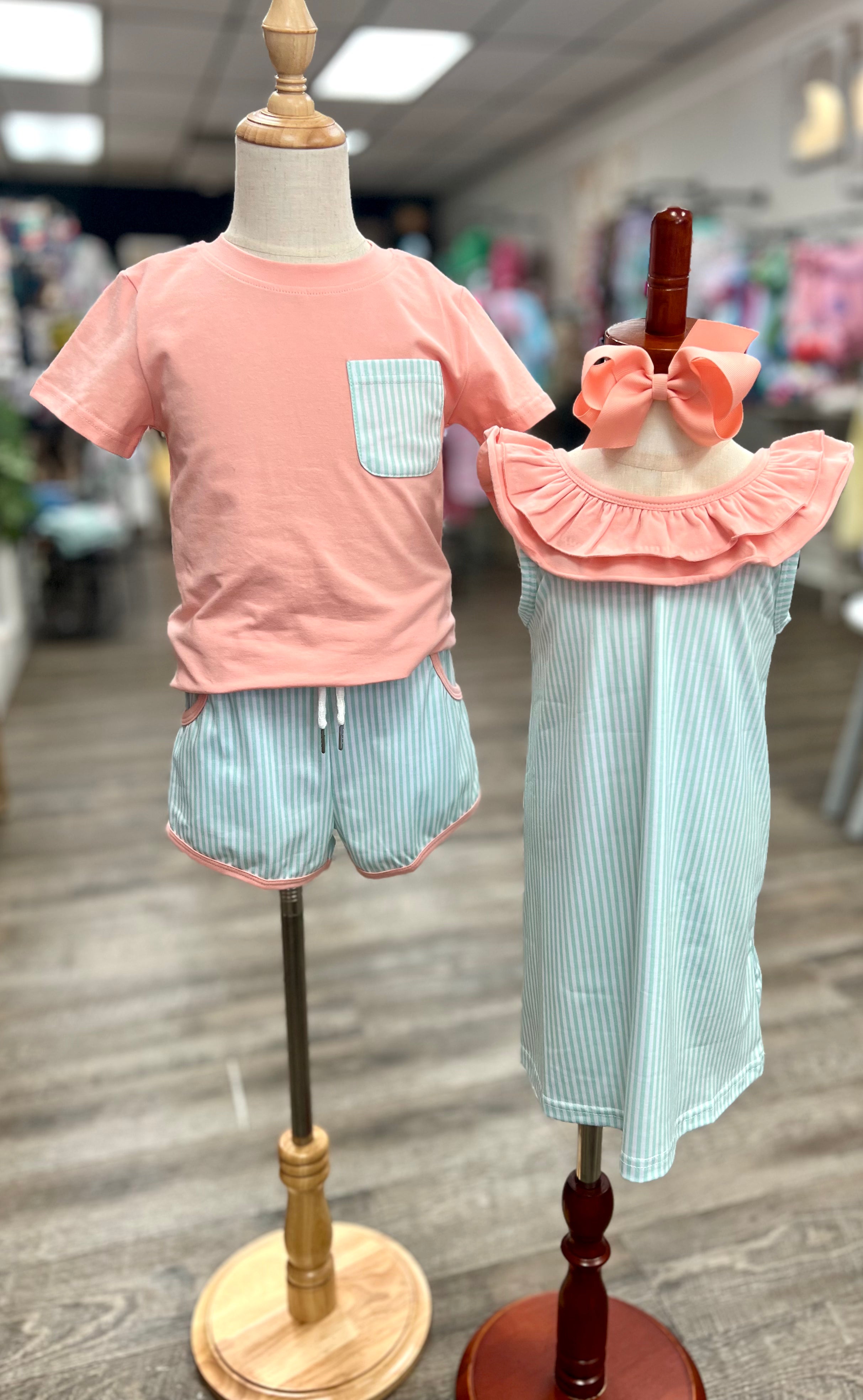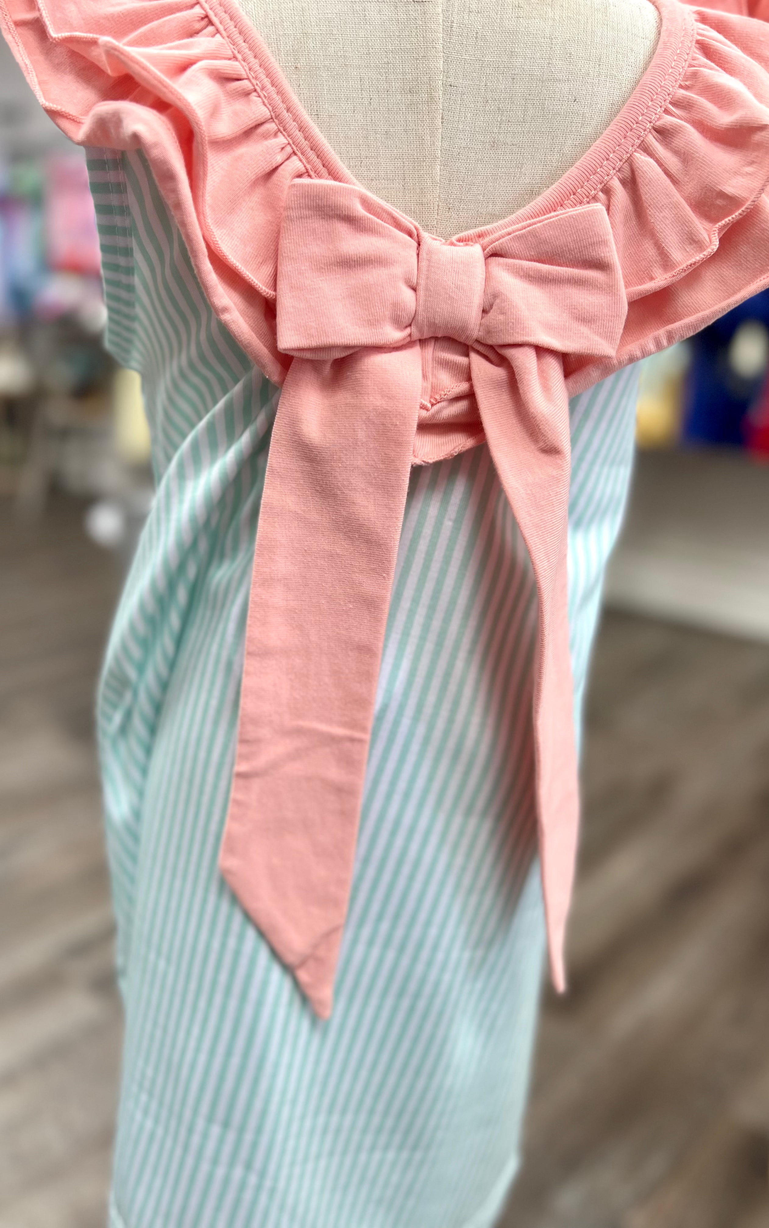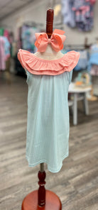 Sweet as Sunday morning. This classic A-line dress is made from soft mint and finished with a double ruffle neckline in the dreamiest peach and a bow in the back. Lightweight, timeless, and twirl-approved — perfect for everything from family photos to front porch swinging.