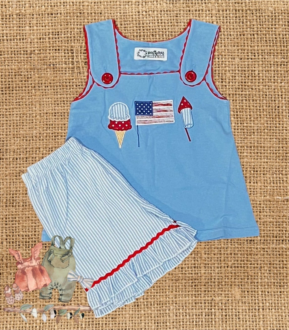 Give your little patriot a stylish look this summer with our Summer In The US of A Girls Set. The patriotic-themed combo includes a knit top featuring a bold Patriotic Applique and seersucker shorts. Perfect for days spent in the sun or any special occasion throughout the season.