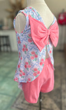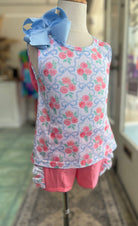 This sleeveless swing top features an all-over rose + bow print, finished with a darling peek-a-boo back and oversized coral bow that steals the show. The matching shorts/diaper bottom are soft, giving her room to twirl, play, and stay comfy all day.