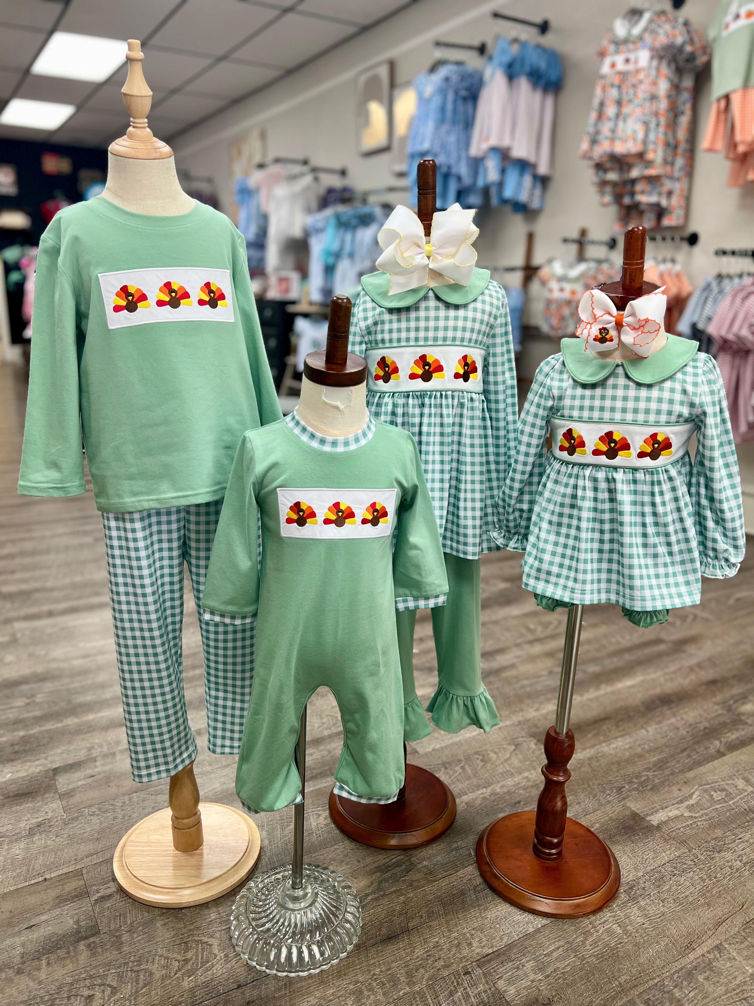 These sweet matching sets are made for family gatherings, school feasts, and cozy fall days. Featuring soft sage gingham and playful turkey embroidery, each outfit is designed to keep your little ones comfy and picture-perfect.
