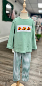 The boys’ pants set is perfect for little gentlemen at the table ✨. A sage gingham top with embroidered turkeys pairs with coordinating pants for a festive, polished look. Ideal for church, family gatherings, or Thanksgiving dinner with the whole crew.