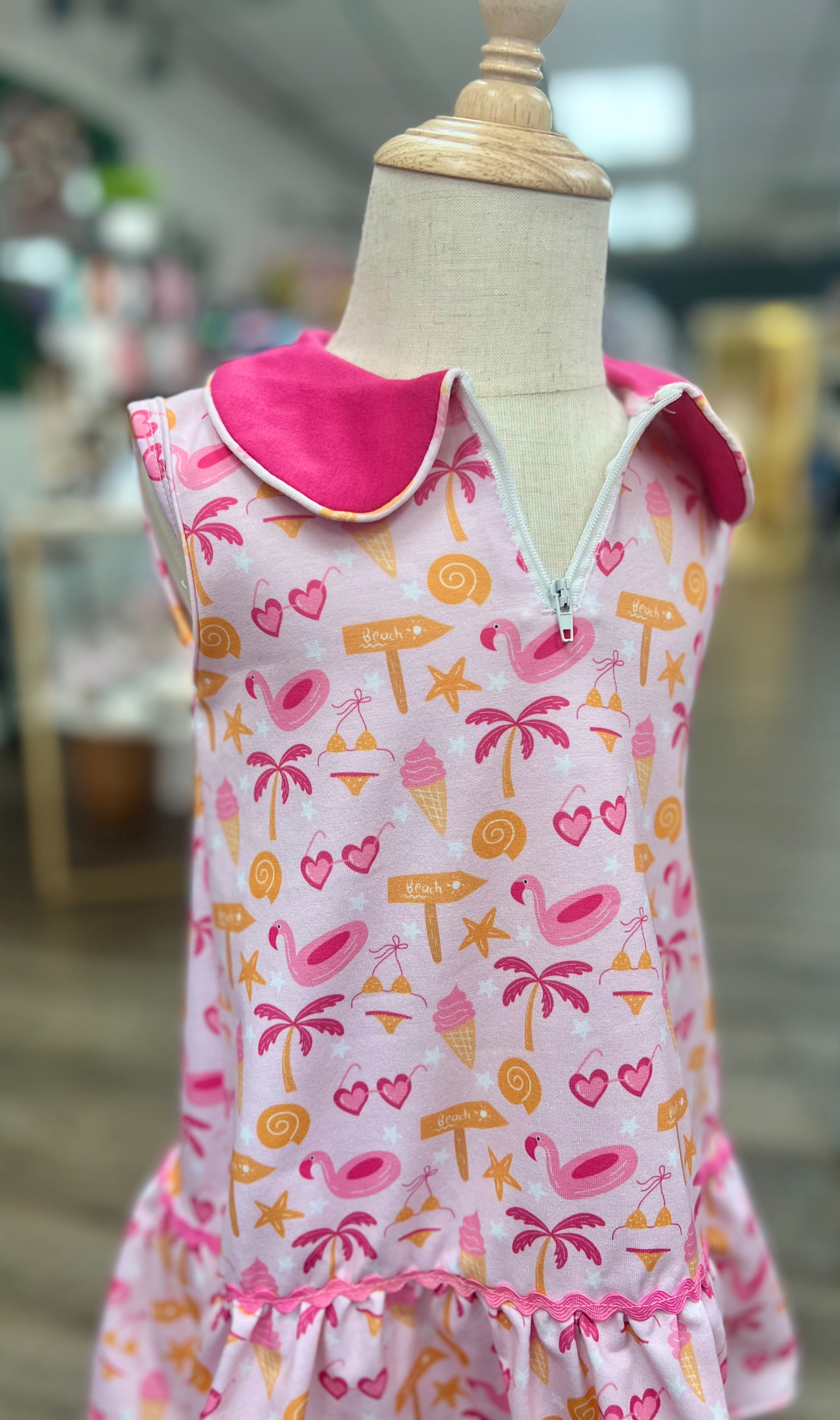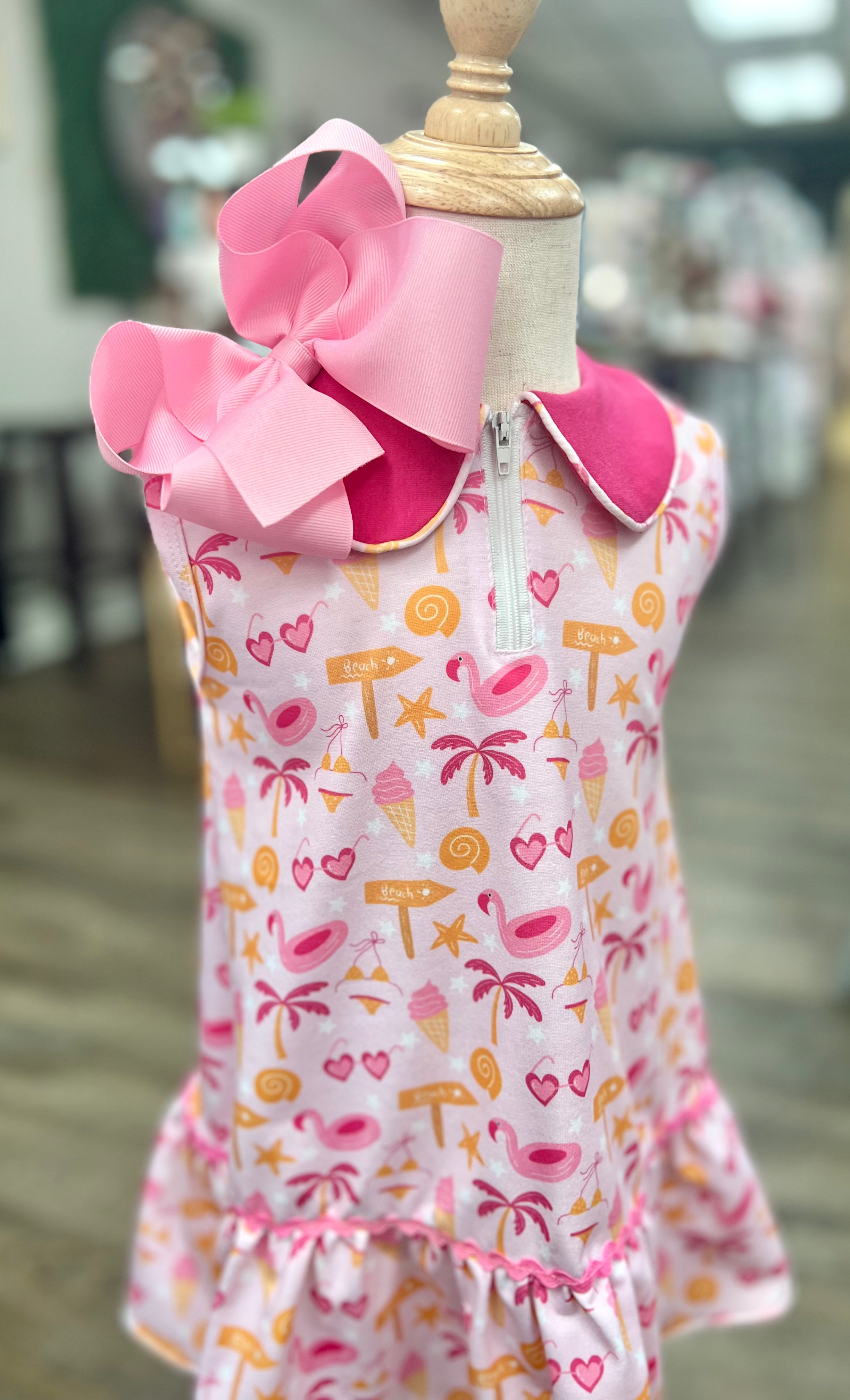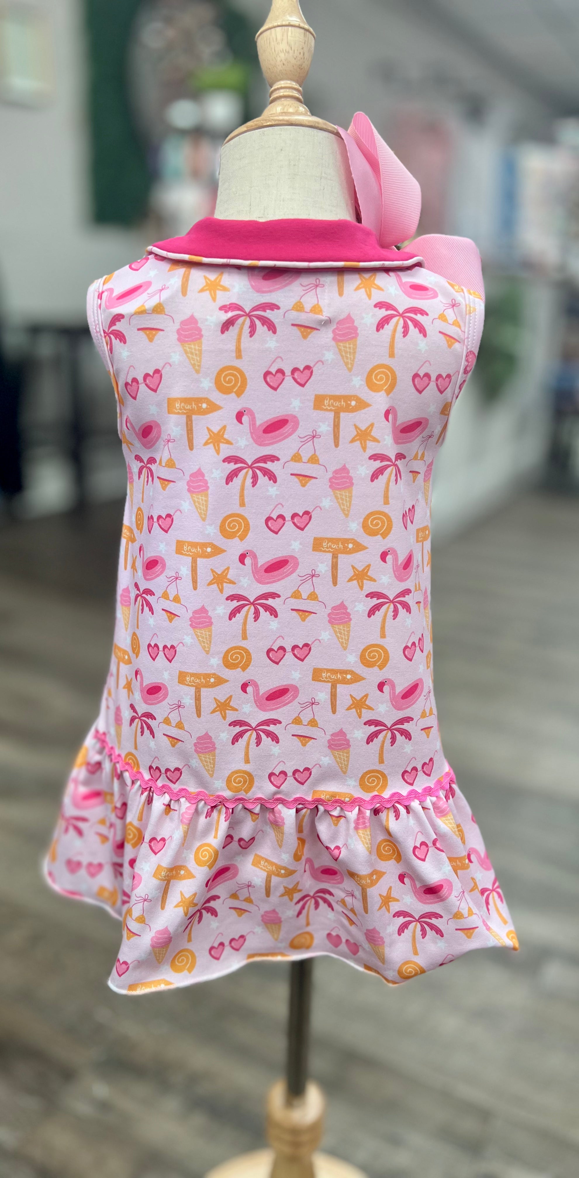 This pinkalicious summer dress is bursting with sunshine and sass! Featuring a playful allover print of flamingos, ice cream cones, hearts, palm trees, and beach signs — it’s basically a vacation in dress form. The hot pink collar adds a bold pop, while the ruffled skirt brings all the twirl.