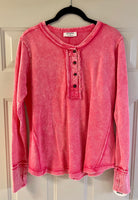 Slip into effortless comfort with our Vintage Vibes 🌿. Featuring a soft mineral-wash finish, raw edge details, and a button-front neckline, this long sleeve top is your go-to for casual days with a touch of style. Pair it with leggings for lounging or jeans and boots for a laid-back look. Available in two must-have colors: Teal and Pink.
