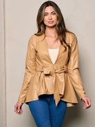 Introducing a classic, timeless piece: the WOMEN'S LONG SLEEVES SELF TIE PEPLUM PLEATHER JACKET! This camel color pleather jacket stands out with its striking peplum fit and self-tie waist, creating a chic and stylish look with a perfect fit. Make a statement with this luxurious and unique piece that will never go out of style!