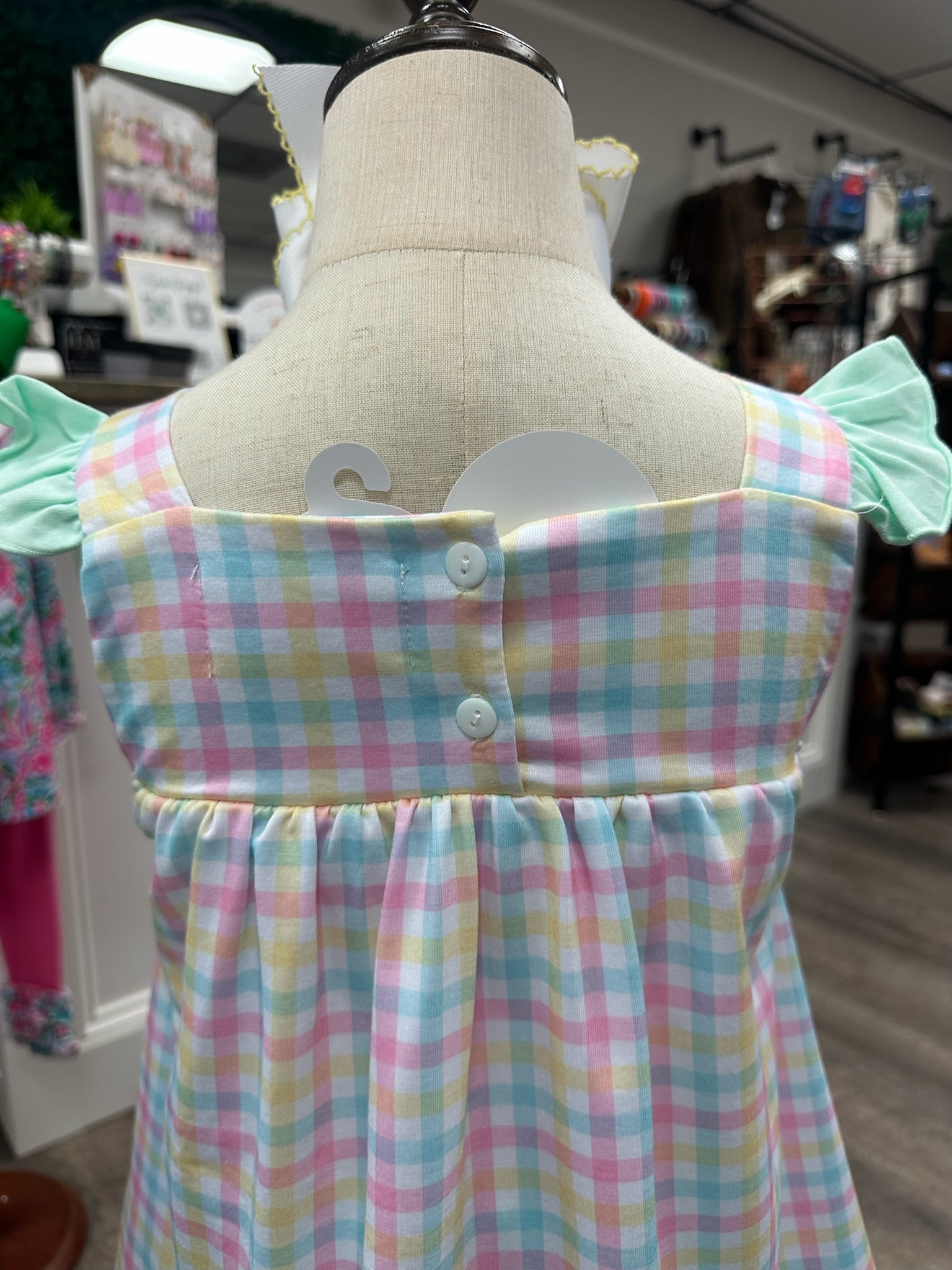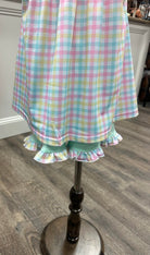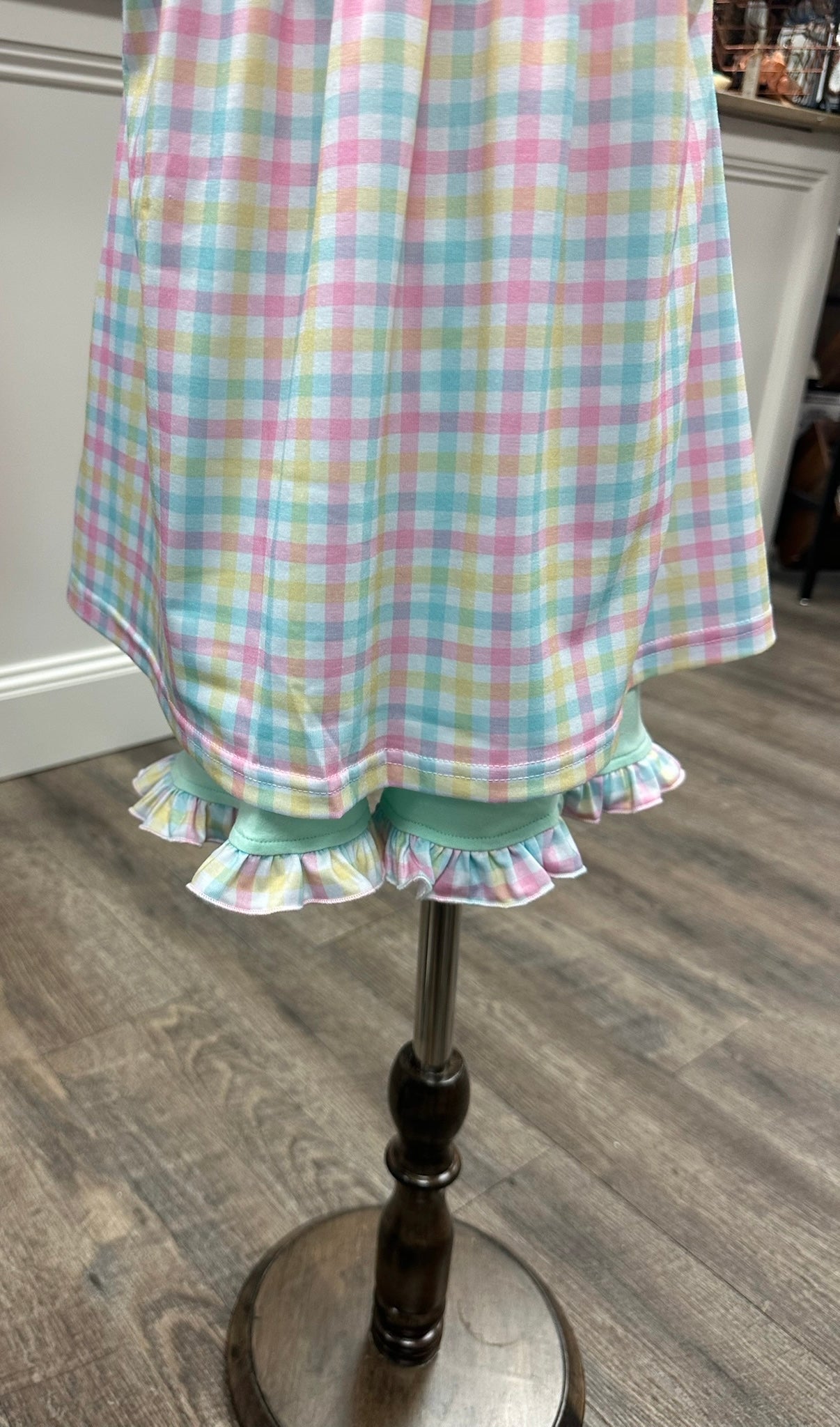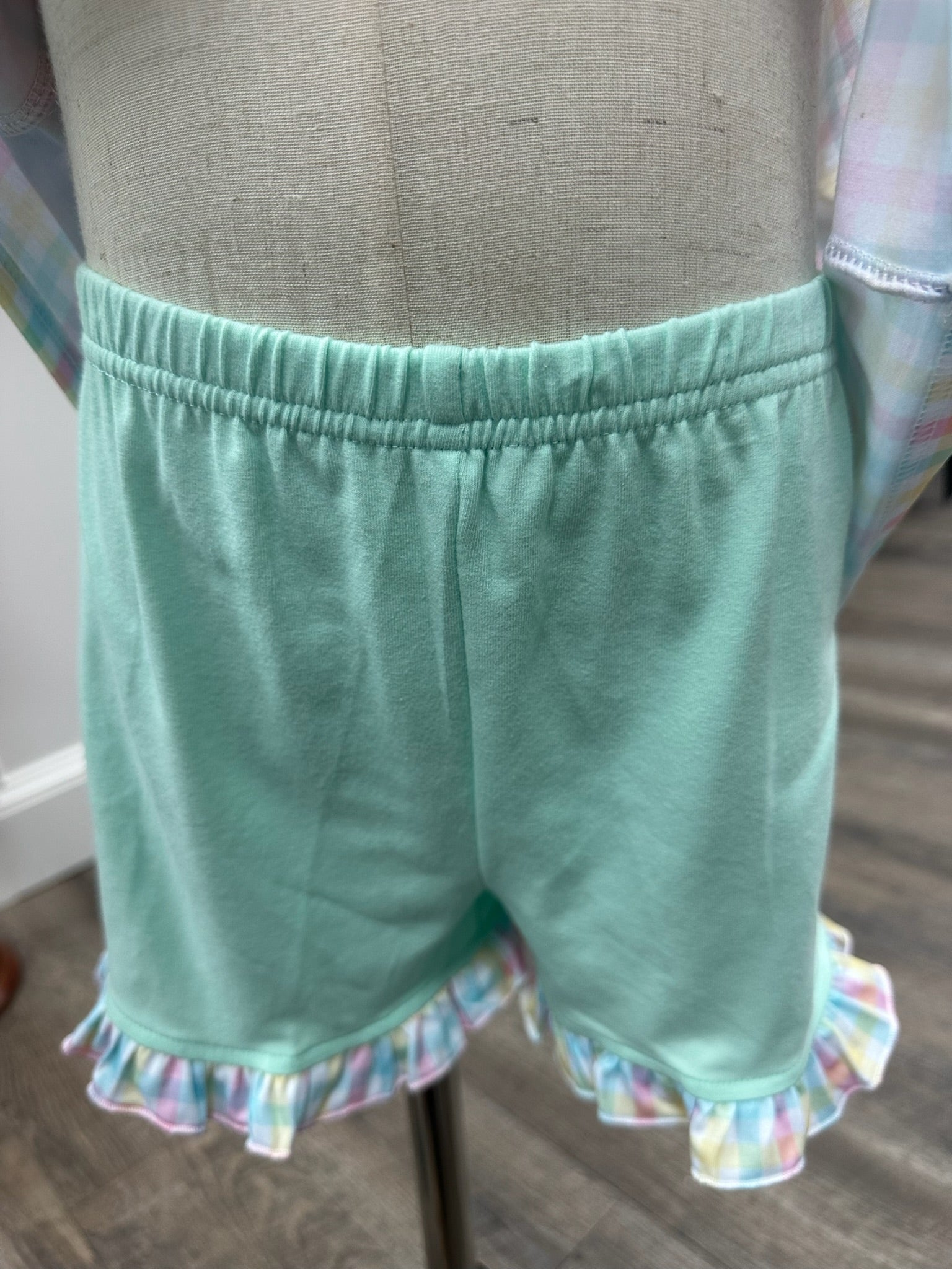 - Pastel plaid shorts in soft pink, blue, yellow, and mint with ruffle hem details