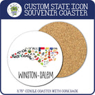 A beautiful coaster featuring the shape of the state filled with the state flag, seal, and relevant images. Your town name is printed in black. The final design/placement of the state and town name will be determined by the shape of the state and the length of the town name.