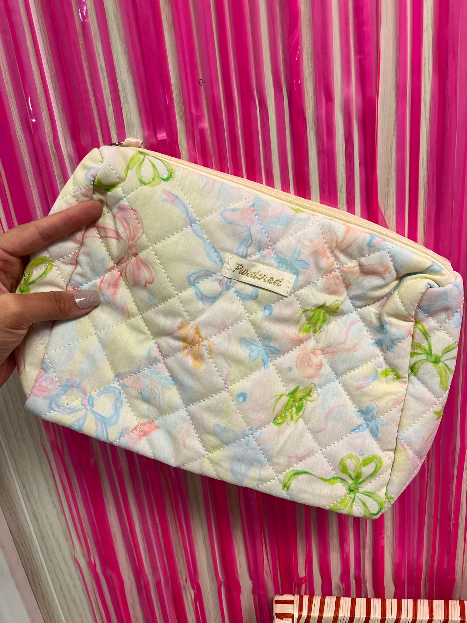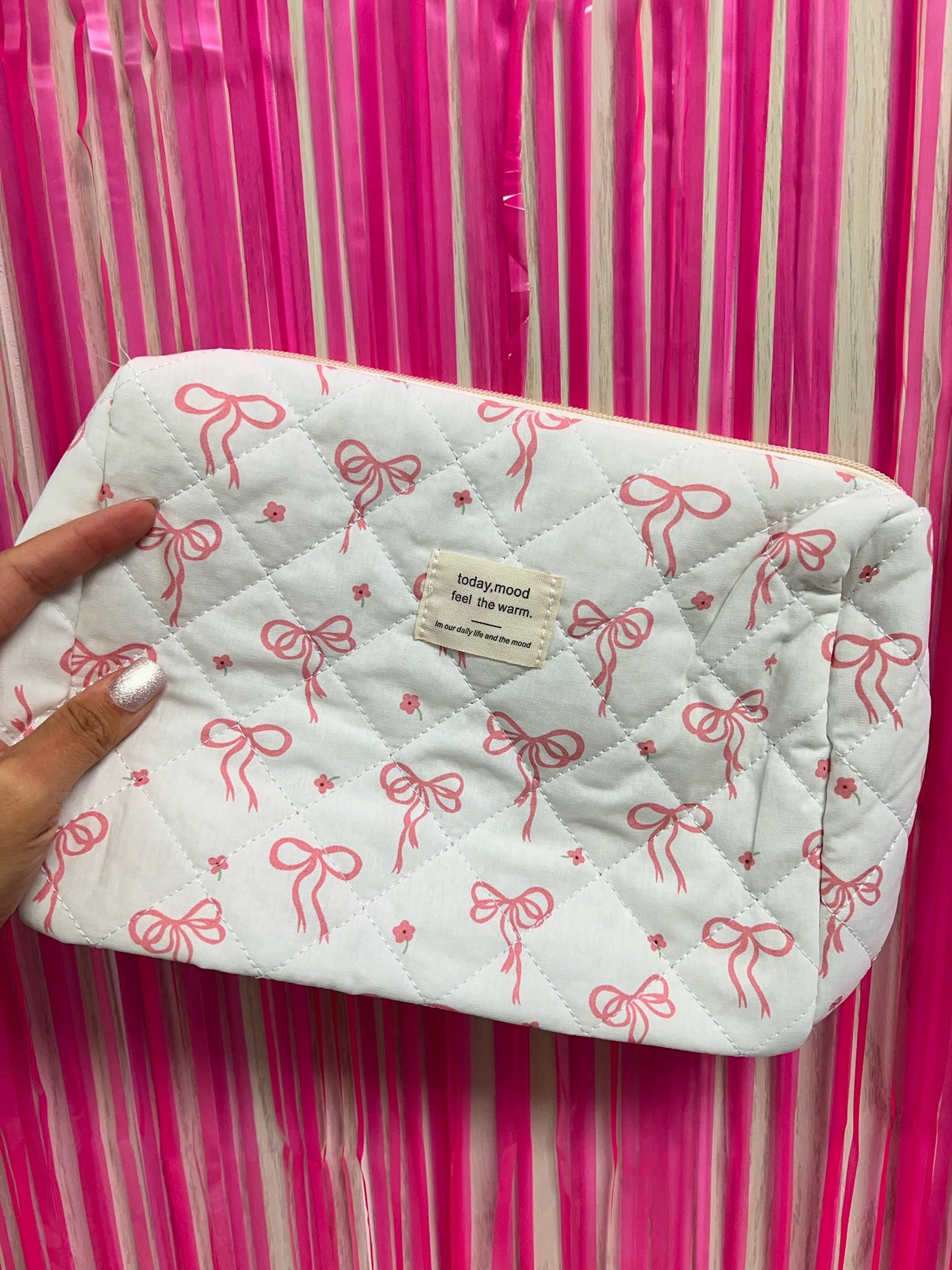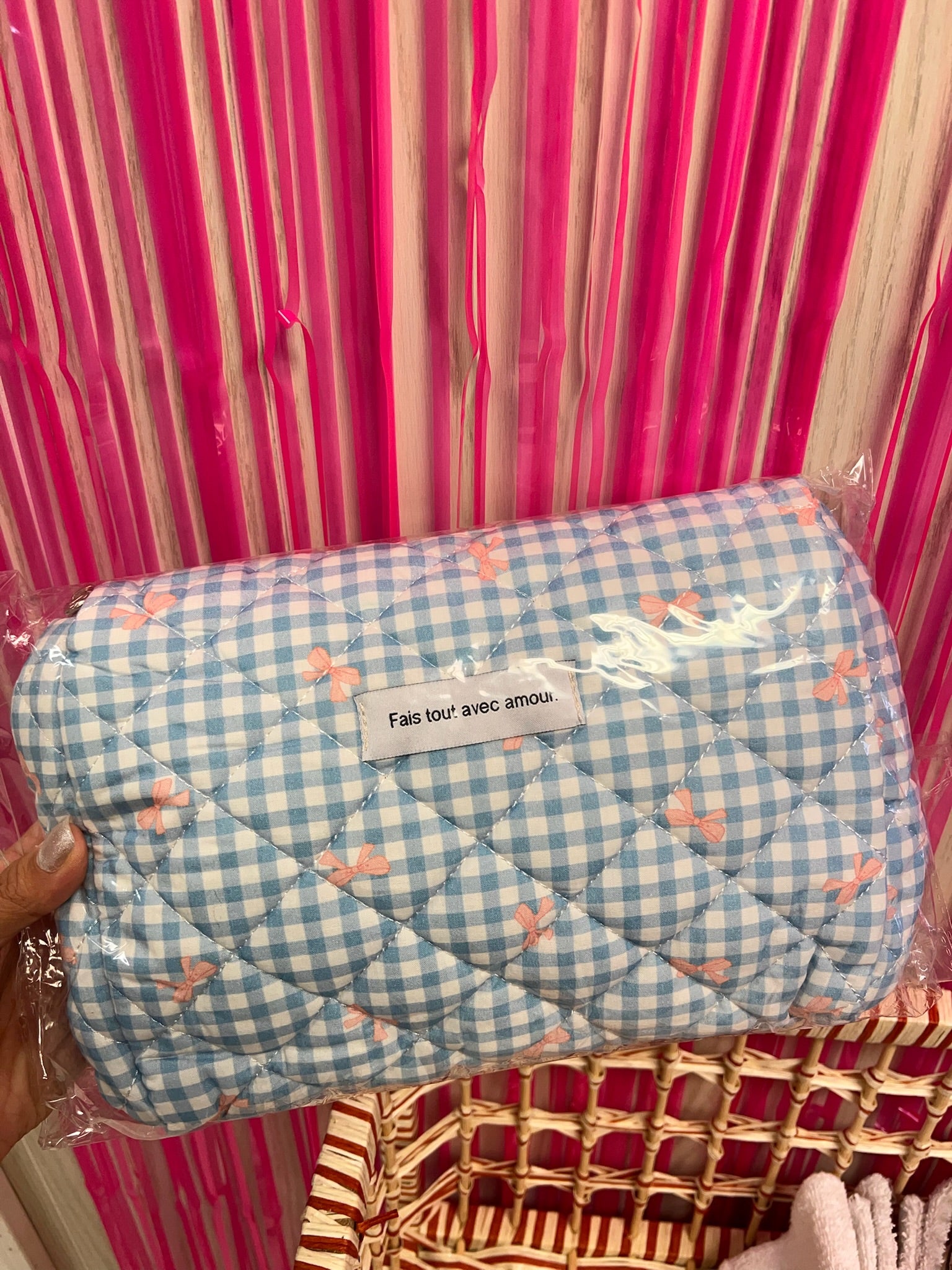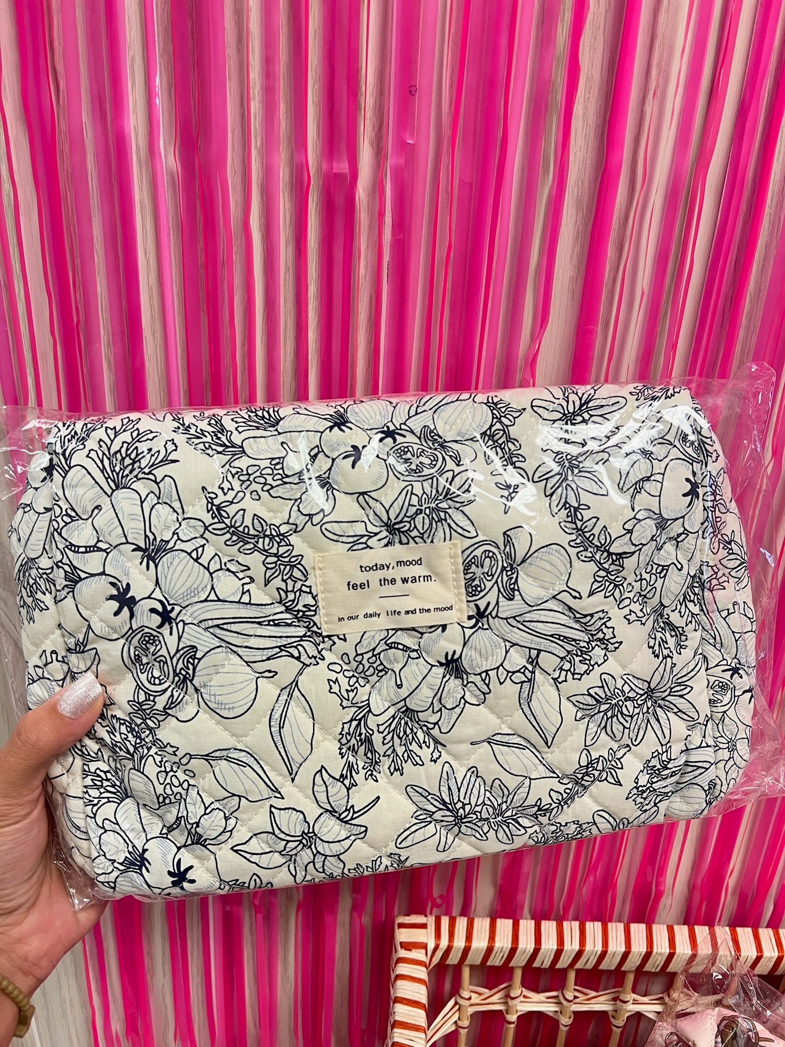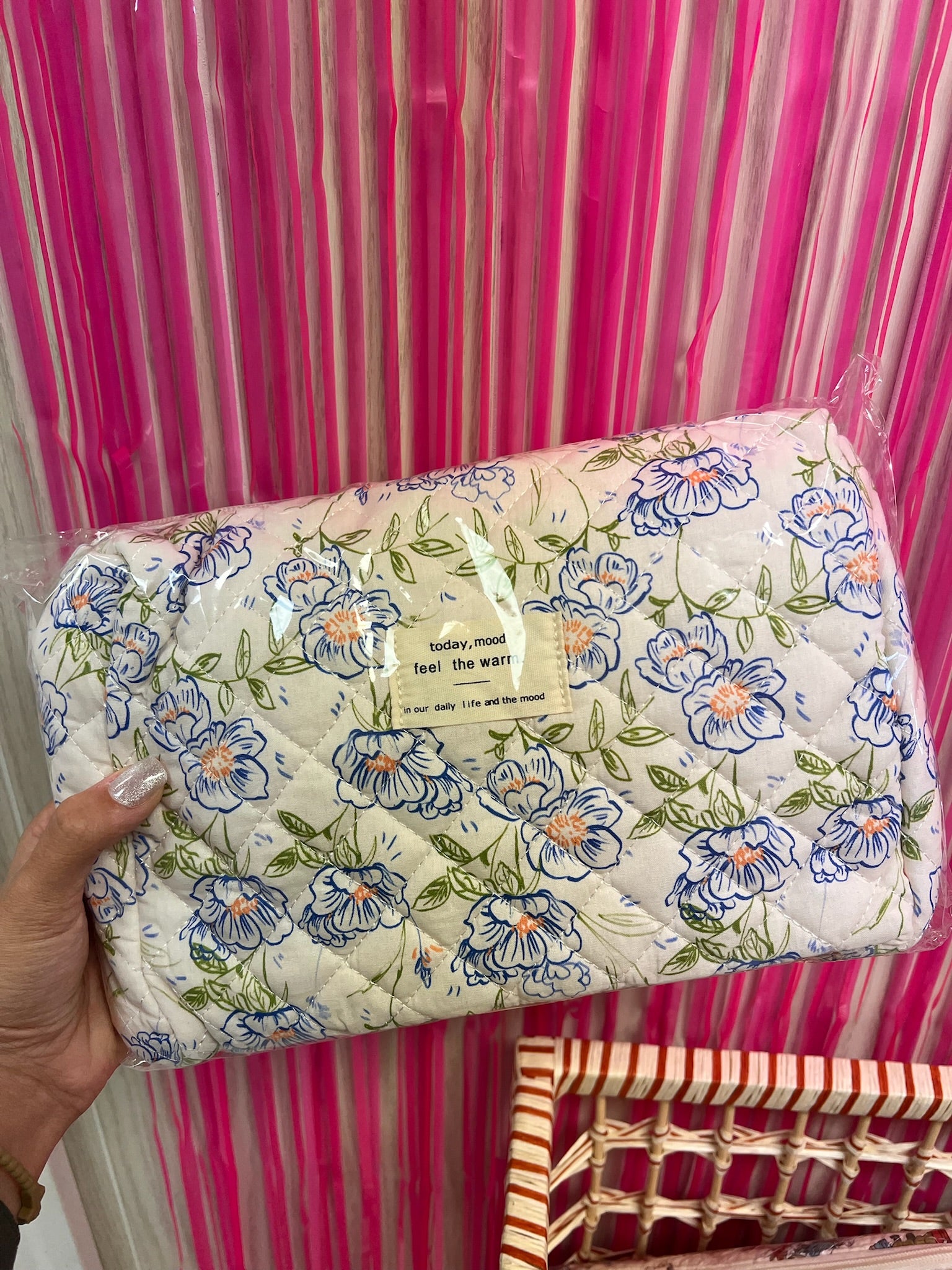 The Quilted Travel Bag Trio includes three matching bags — a large vanity pouch, a medium cosmetics bag, and a slim pencil/brush holder. Each one features soft quilted stitching, dreamy floral patchwork, and the cutest “today, mood feel the warm” label detail.