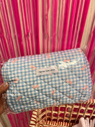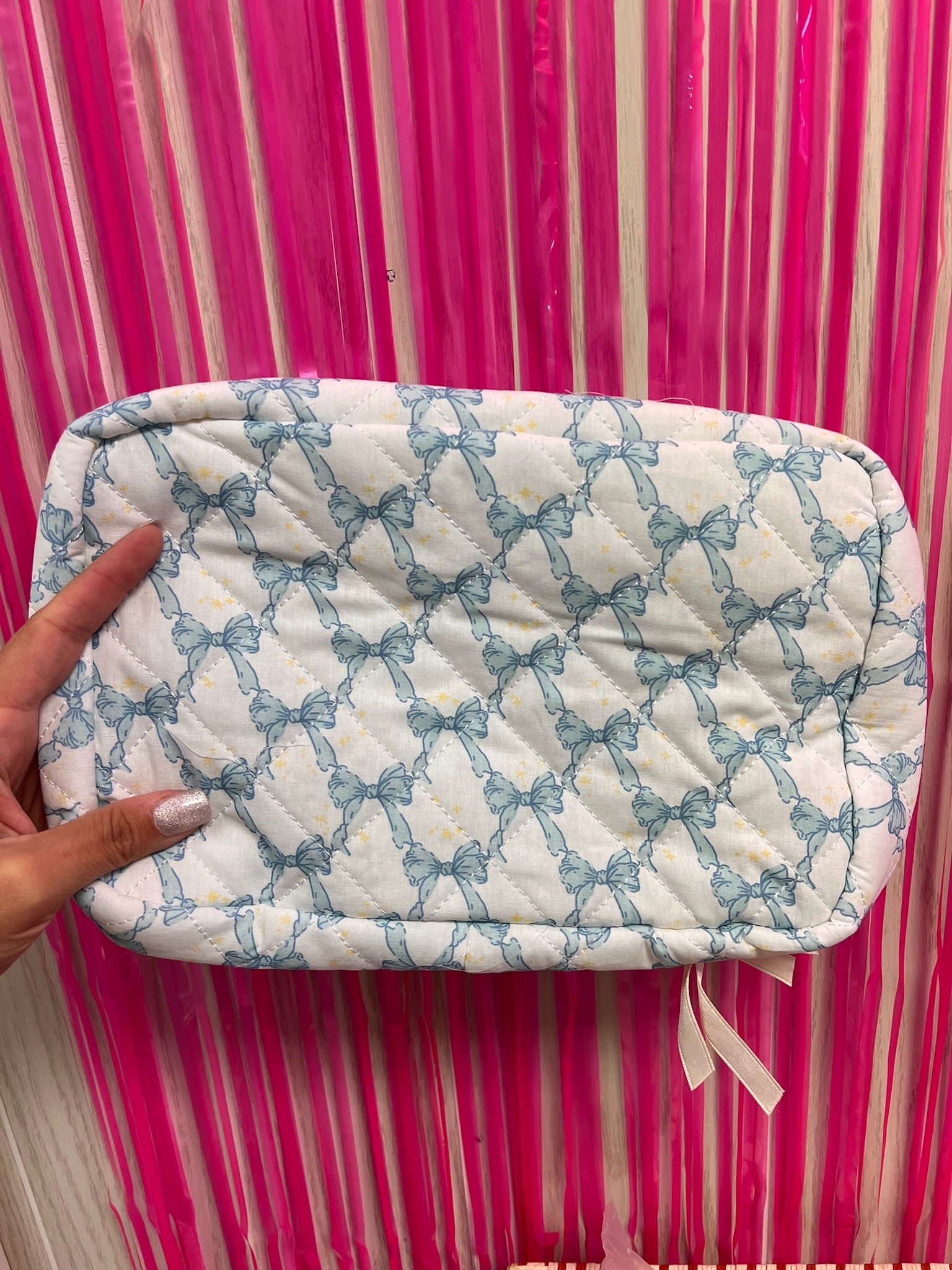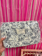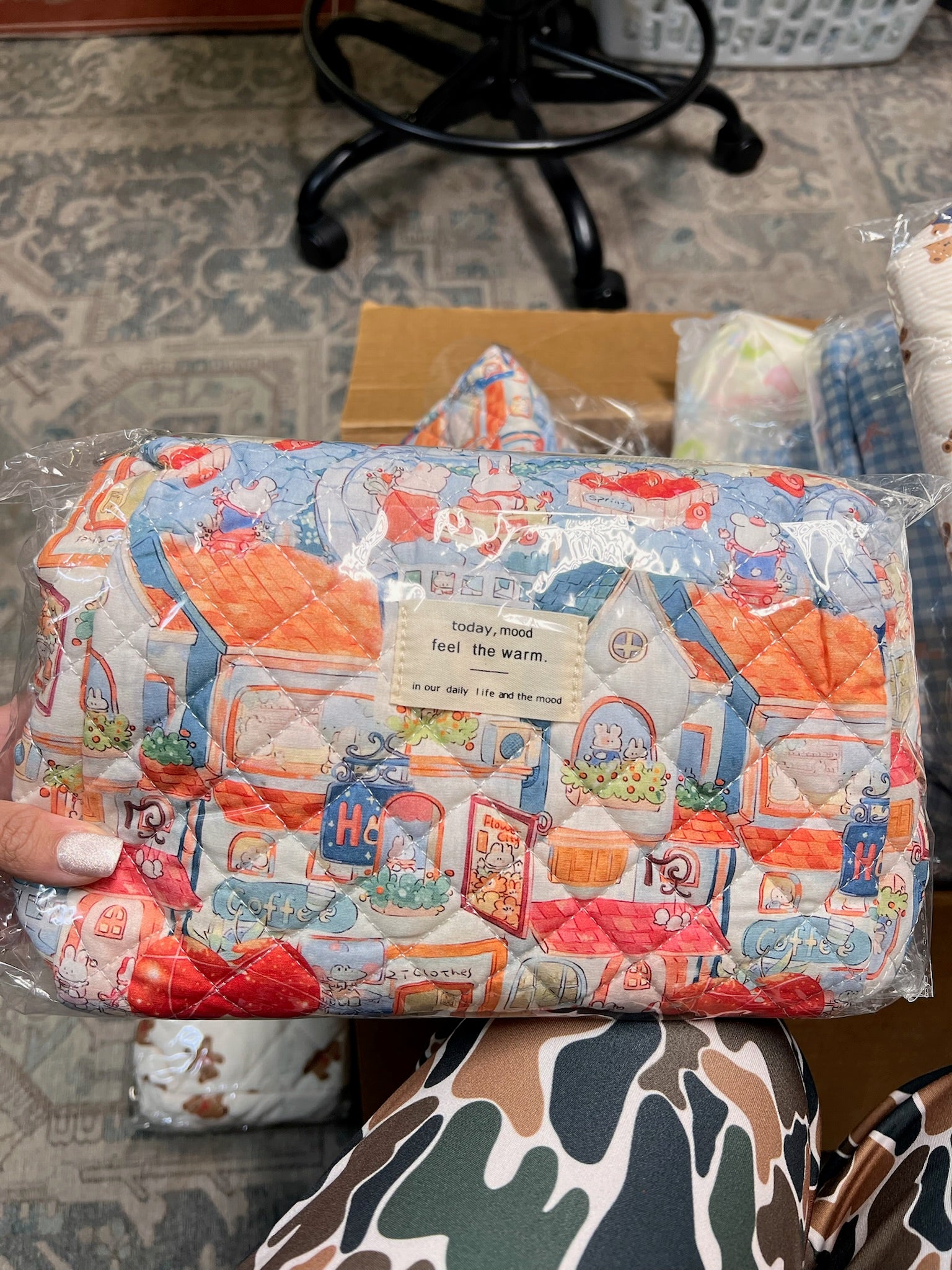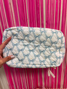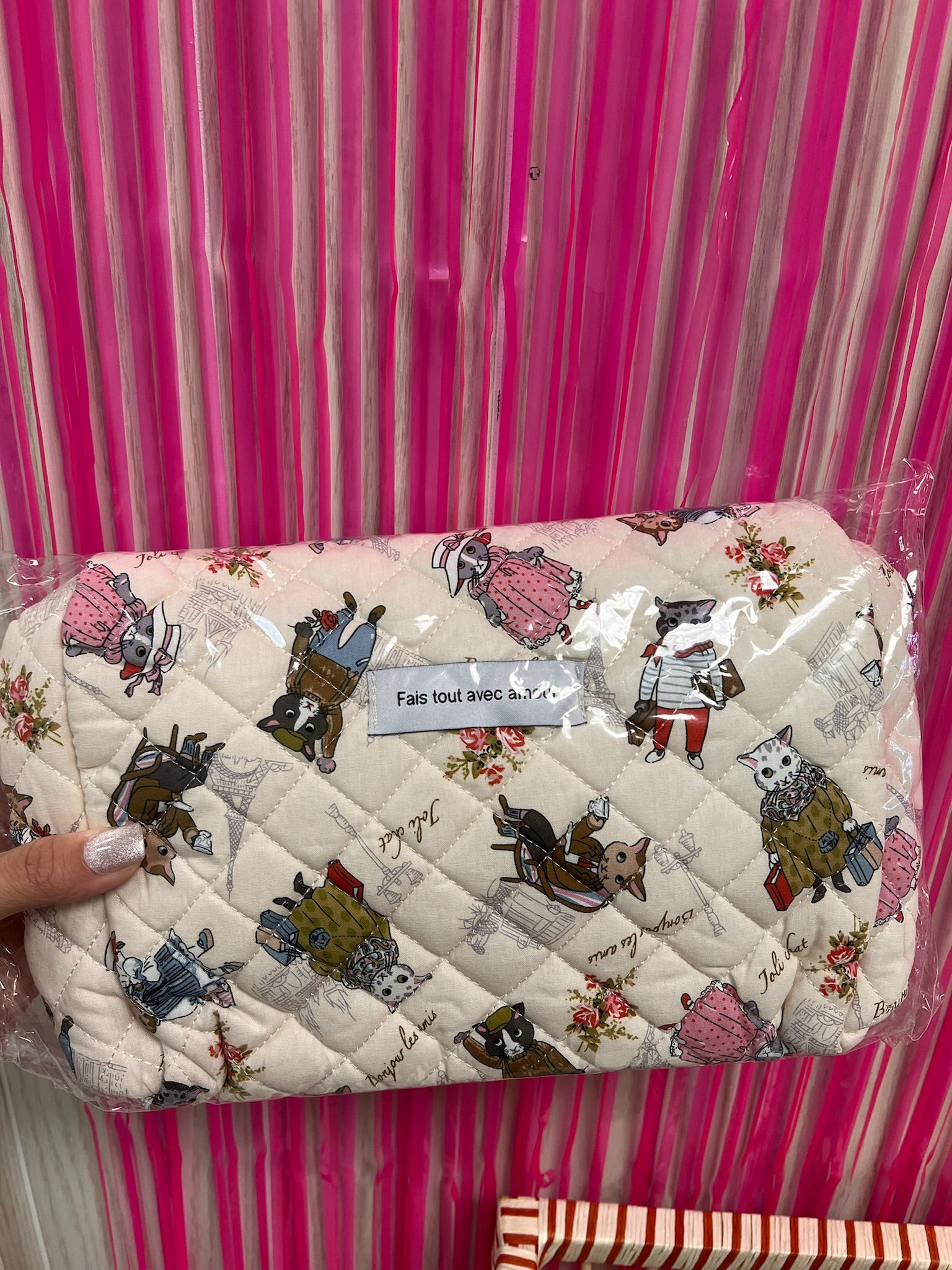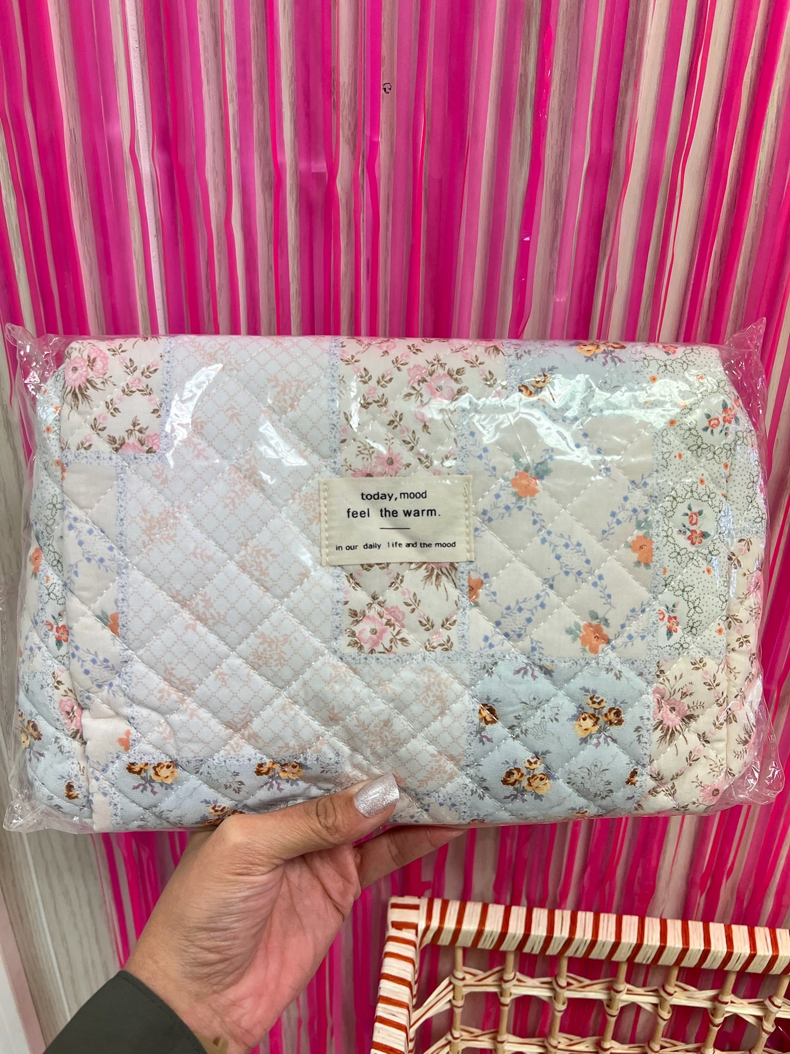 The Quilted Travel Bag Trio includes three matching bags — a large vanity pouch, a medium cosmetics bag, and a slim pencil/brush holder. Each one features soft quilted stitching, dreamy floral patchwork, and the cutest “today, mood feel the warm” label detail.